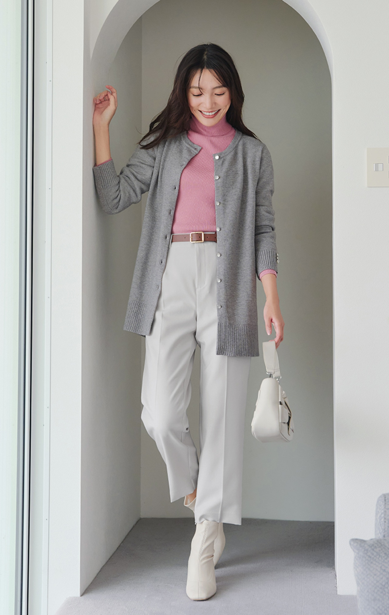 ベーシックなコーディネートも、前身頃と袖口のきらりと輝くボタンで可憐なスタイルを演出。もっちりとした風合いと程よい厚みのあるニット素材で毎日着たくなる。ボタンの開け留めで印象チェンジ!ラフにもきれいめにも着こなせます。