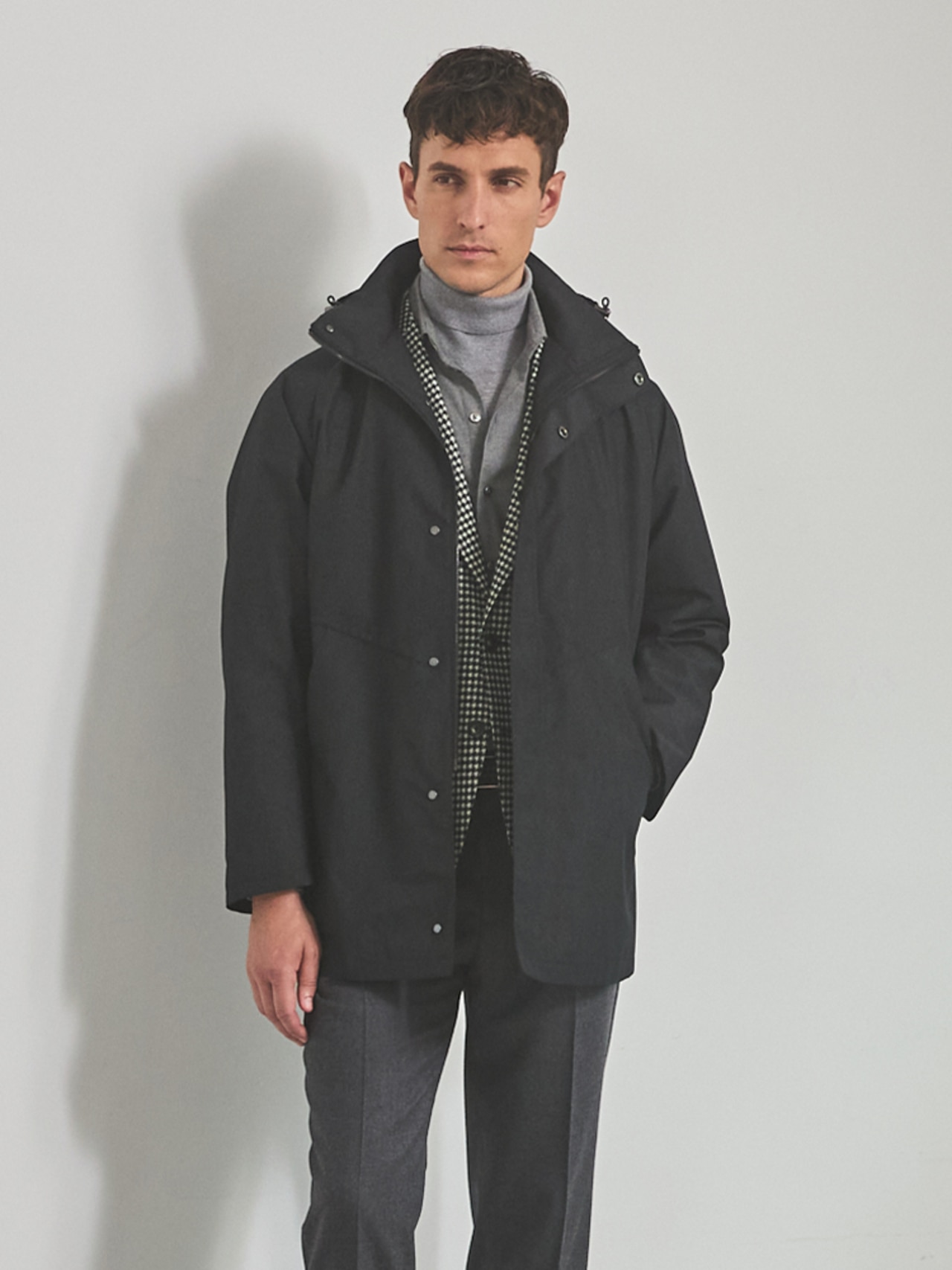 フードは取り外しができ、スタンドコートにもなります。