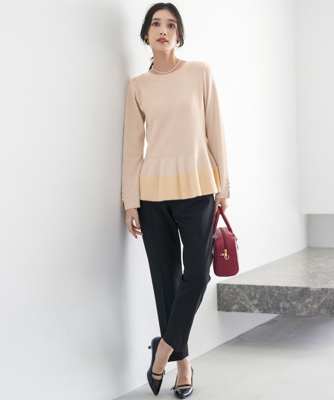 ペプラムトップスやショート丈トップスとのスタイリングはスタイルアップ見えが狙えるシルエットをさらに引き立ててくれます。