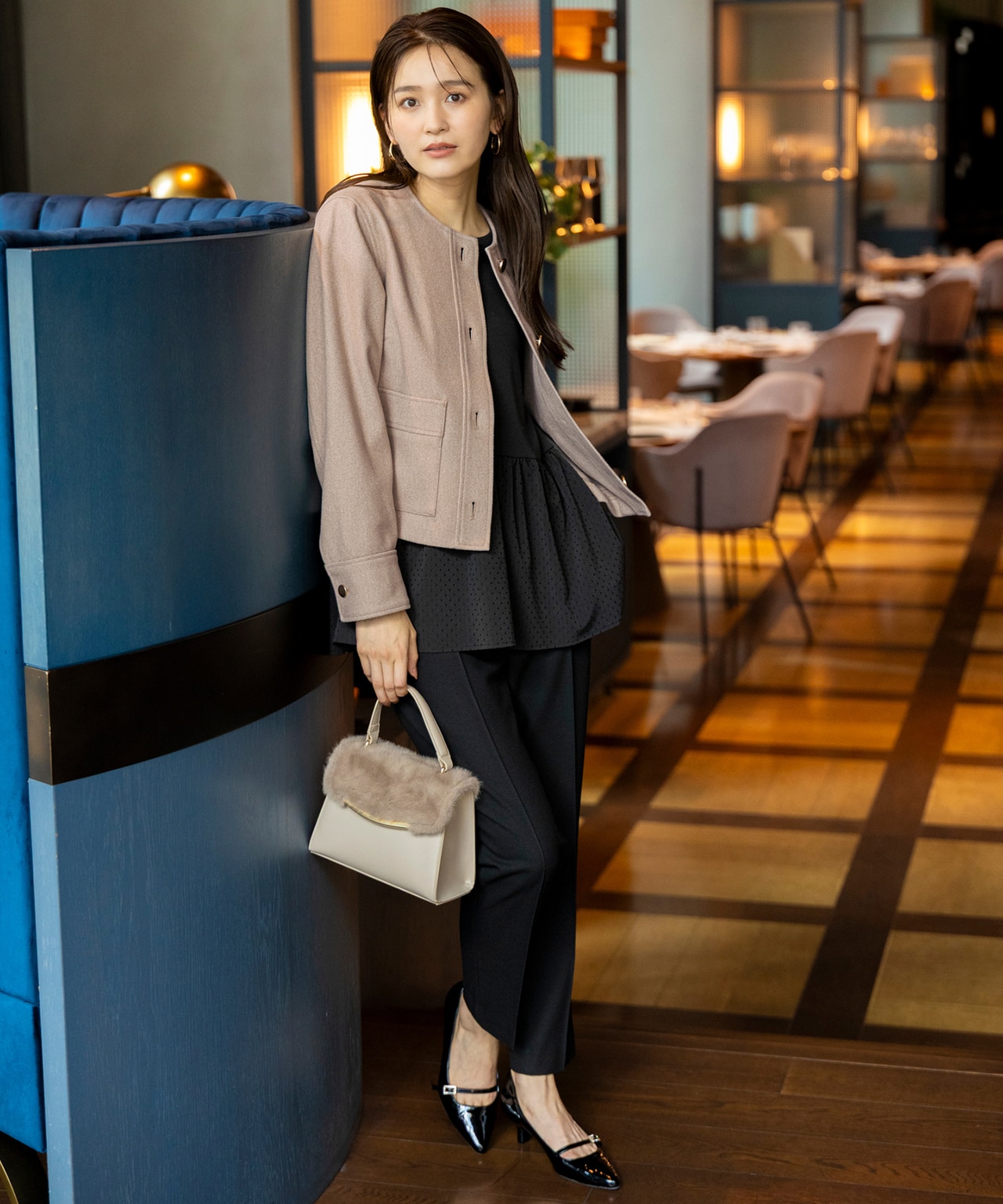 ツヤ素材やビジュー、優し気カラーなど... どこか女性らしい要素のアイテムと合わせてハンサムすぎない着こなしができるのもANY SISならでは。
