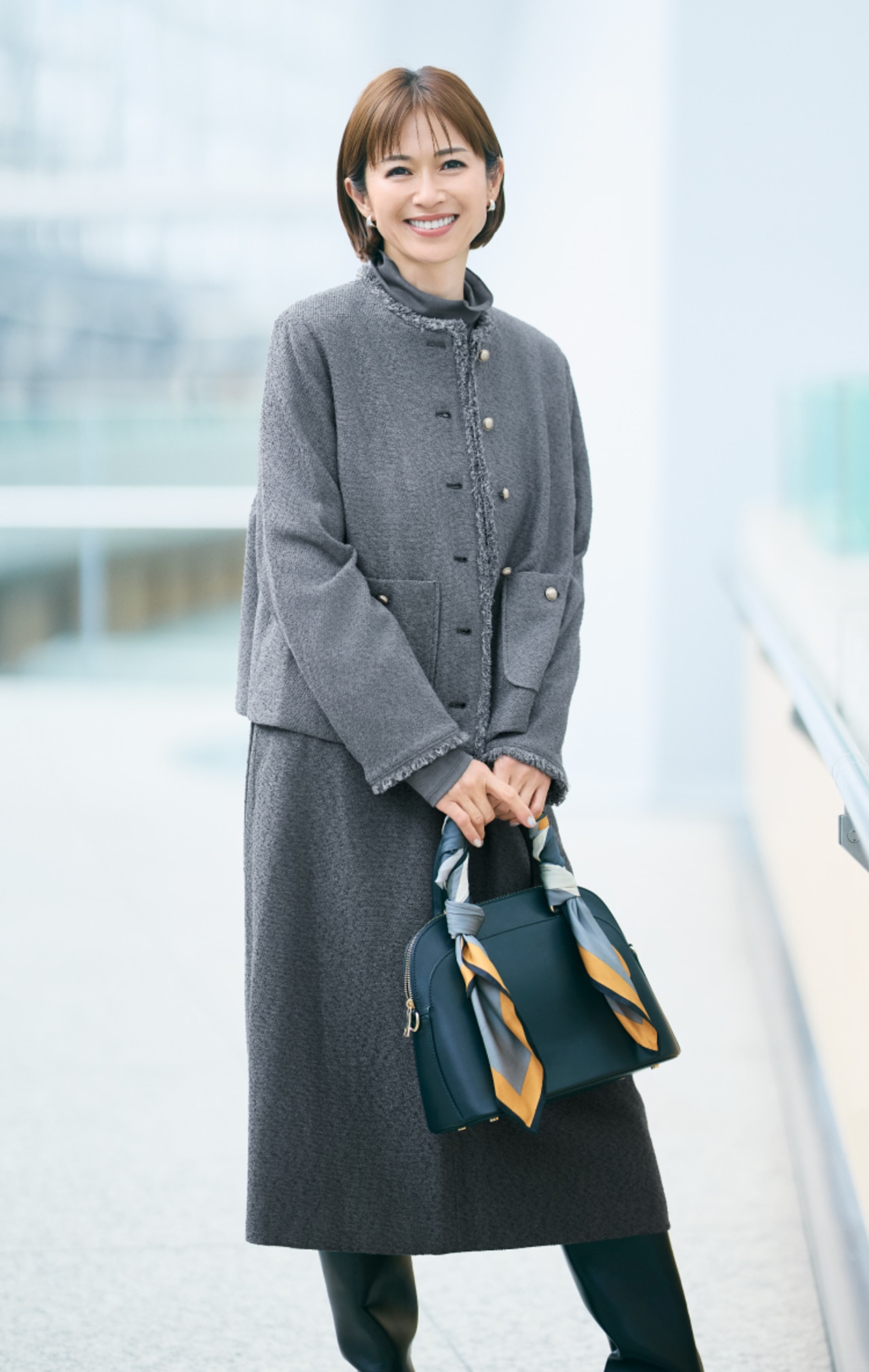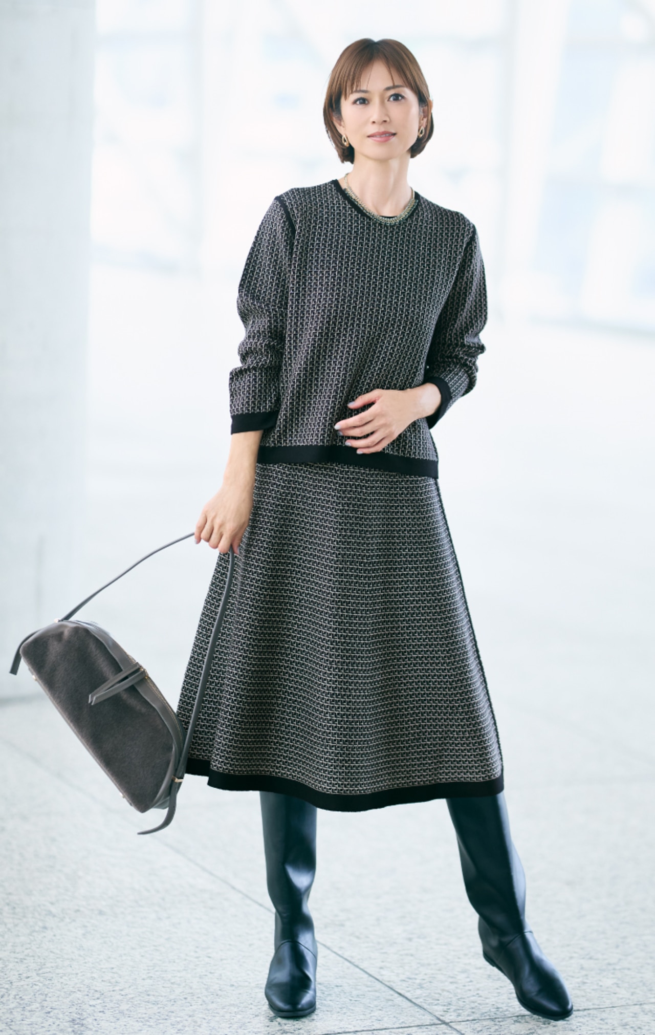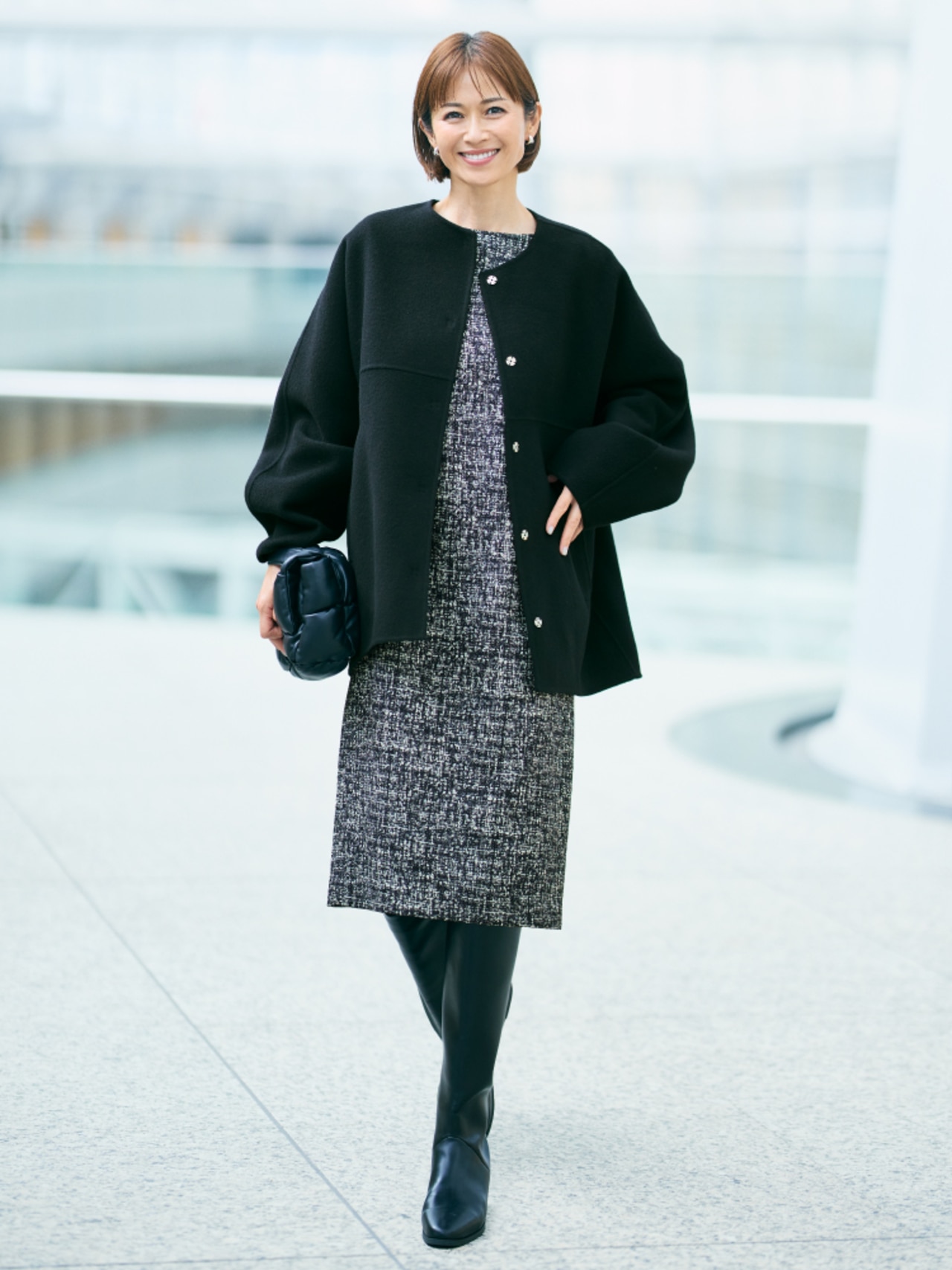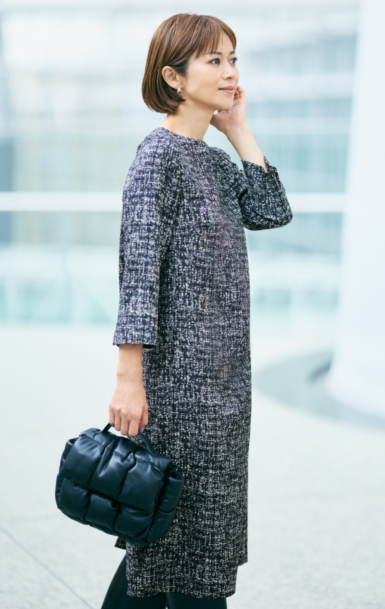 Iラインのすっきりとしたシルエットのジャンパースカート。上品見えするツイードの凹凸素材は、適度な落ち感も美しい。インナー次第で印象を自由に変えられる優れもの。同素材のジャケットを羽織れば、たちまちオンスタイルが叶います。