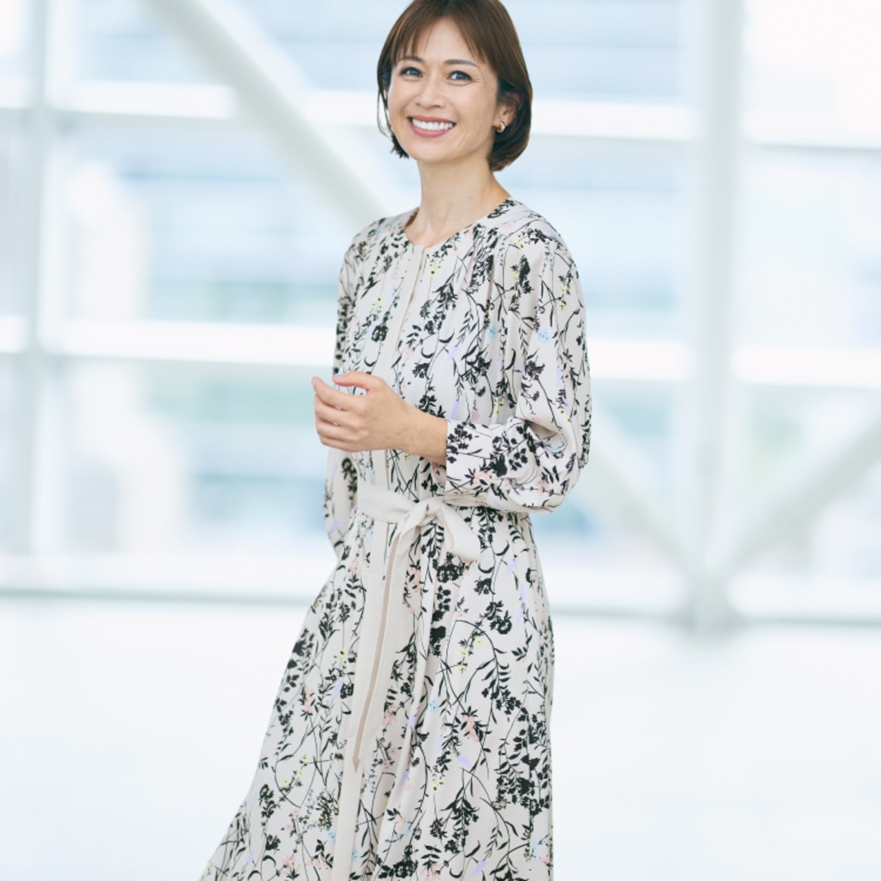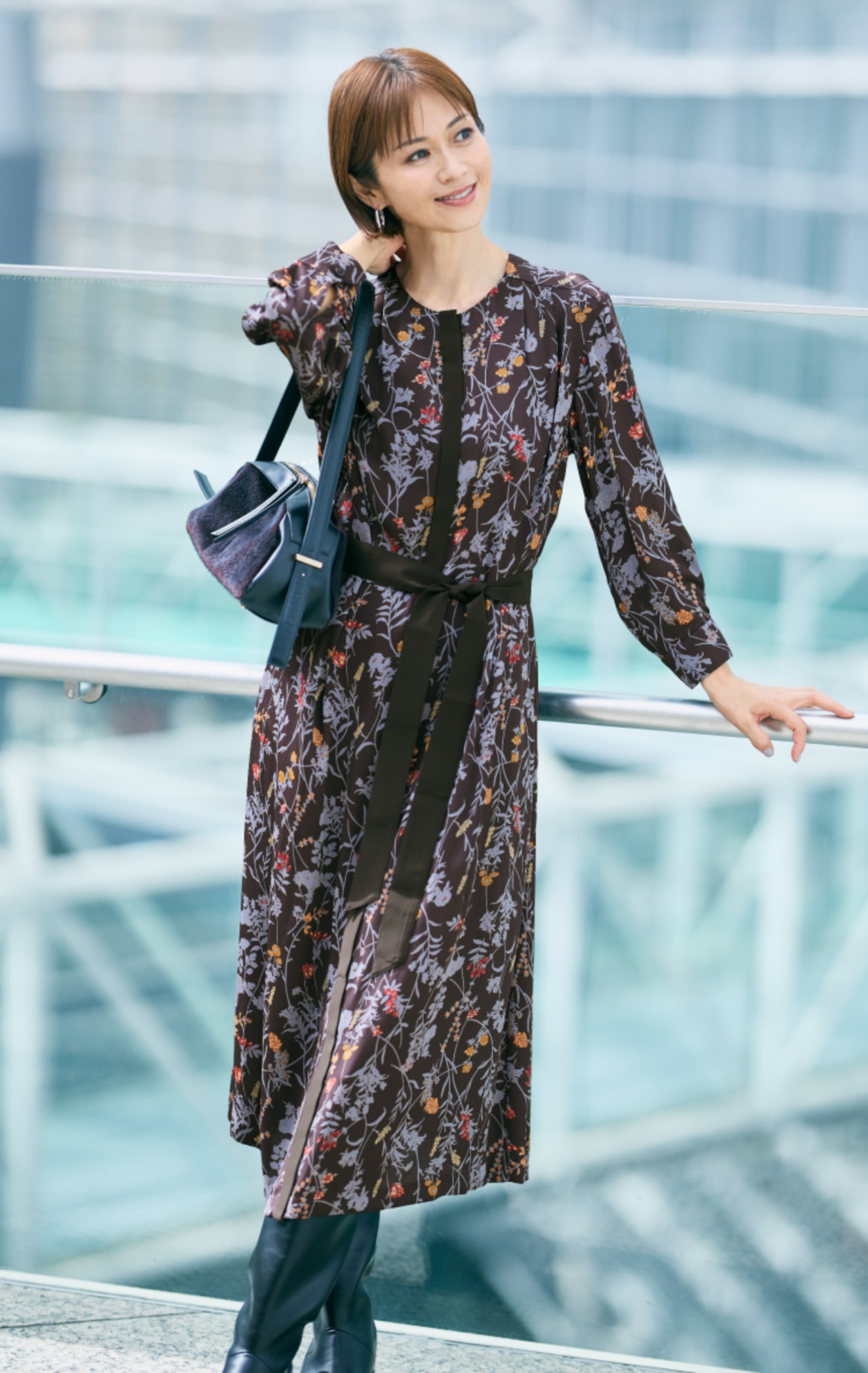 自由区で人気のフラワー柄のワンピース。甘くなりすぎない上品な花柄と、流れるようなシルエットが大人の女性の内にあるしなやかさを美しく映します。シックなブラウンベースは今季の新色。