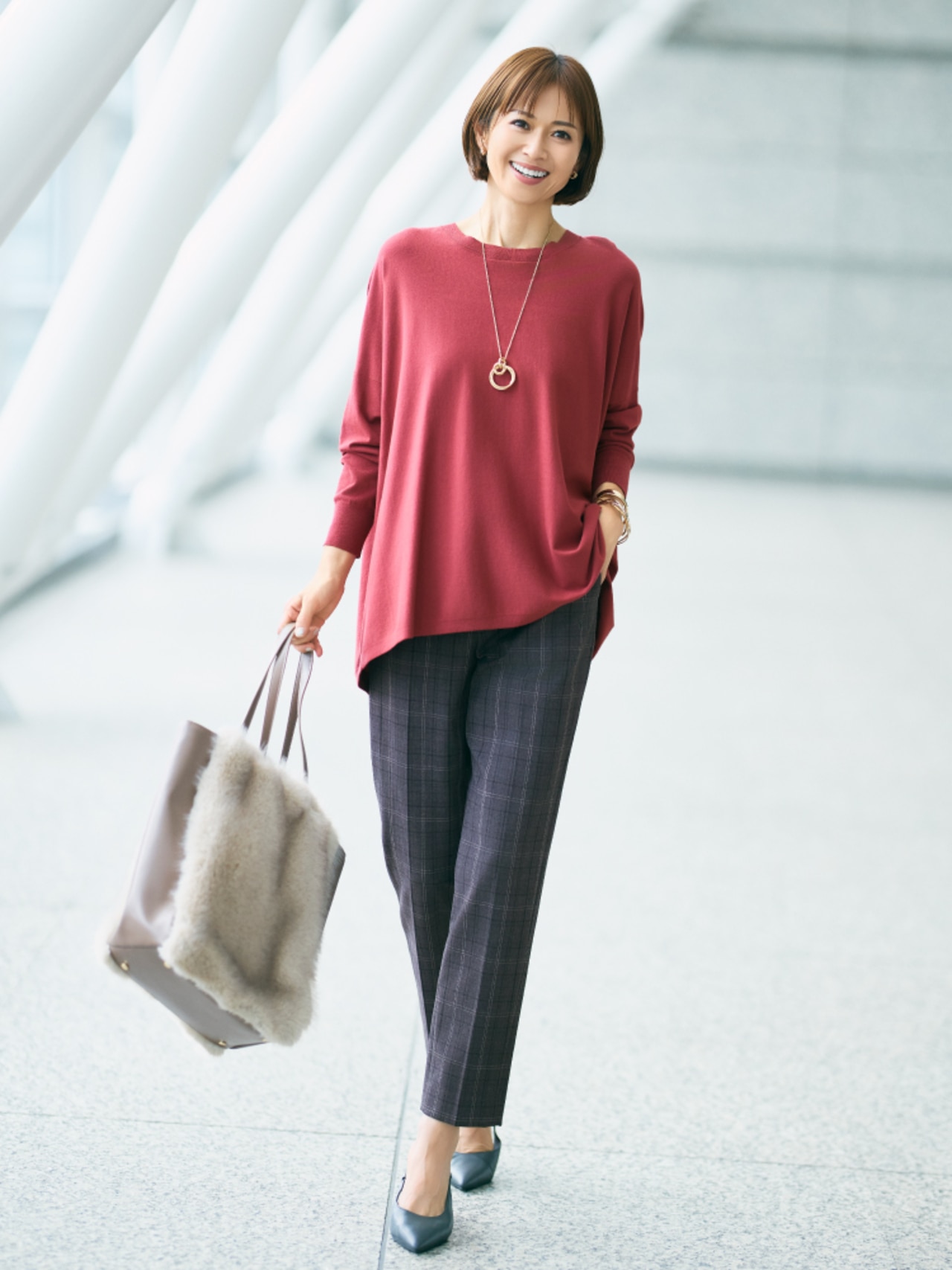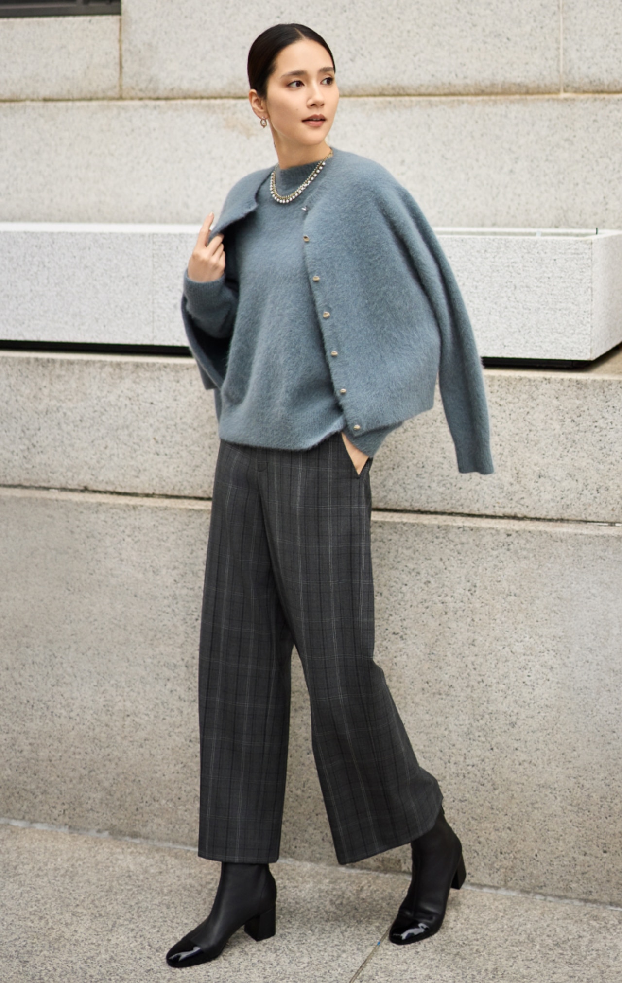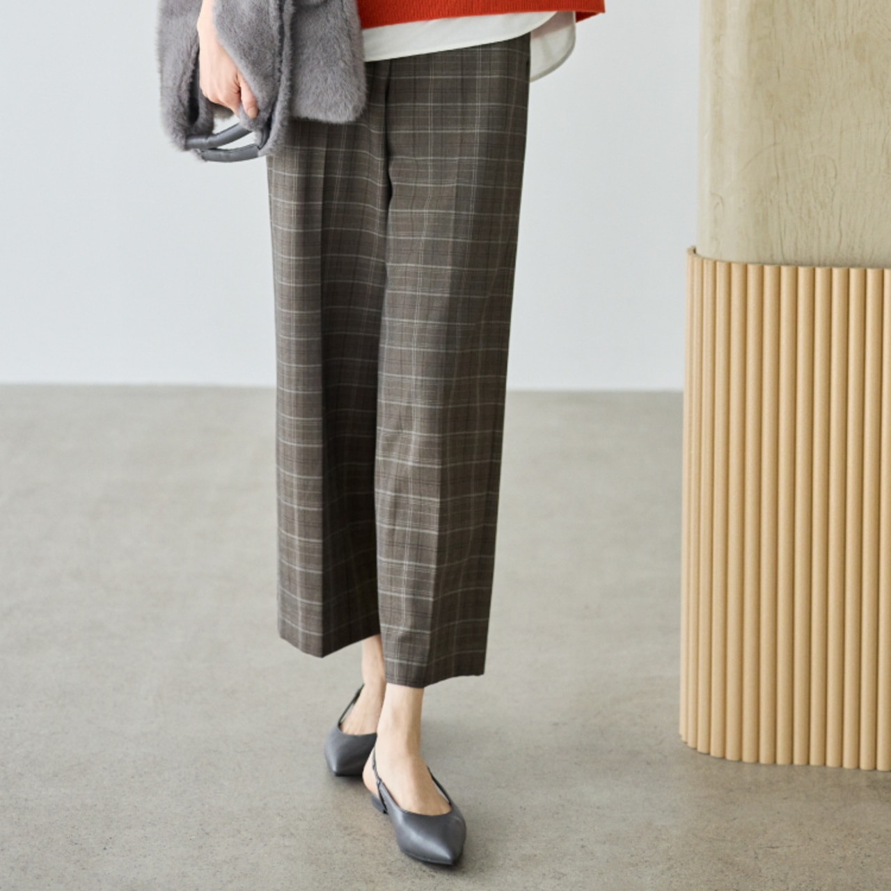 主張しすぎず、それでいて知的な印象のチェック柄ボトム。きれいな落ち感のワイドシルエットで、より上品な印象に。暖かさもさることながら、小雨程度の水をさっと払うことができる撥水加工も魅力です。