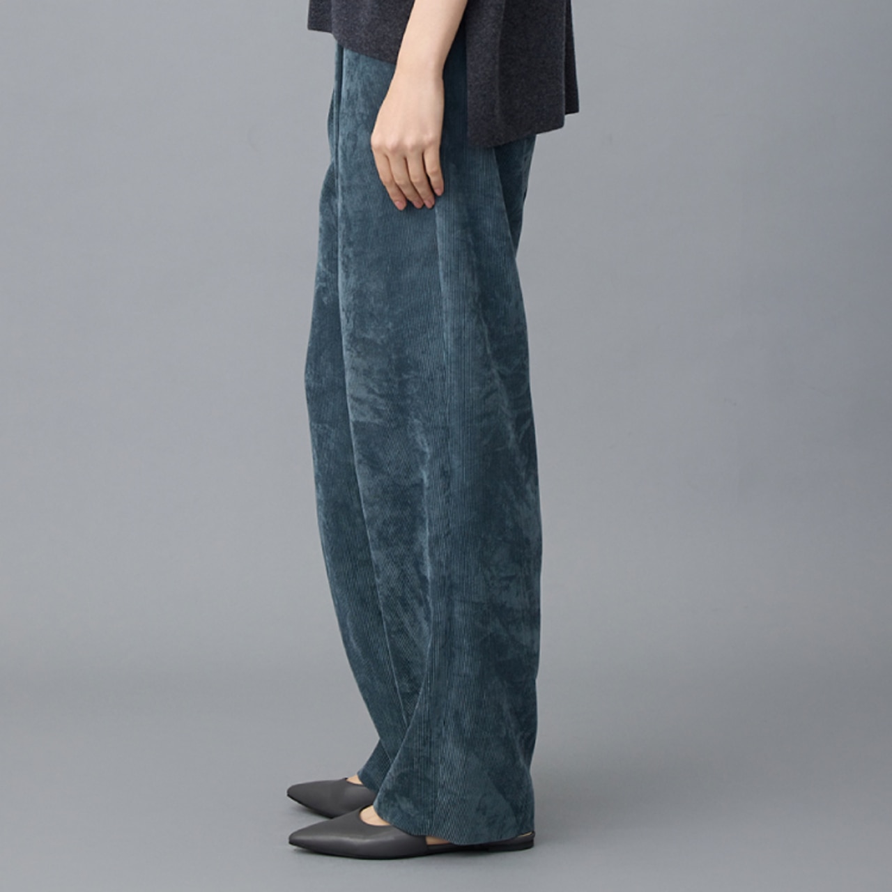 硬さを感じない柔らかな肌当たりのコーデュロイパンツ。ウエスト周りはぐるりとゴムの仕様でイージーな穿き着心地。トレンド感を感じる程良いワイドシルエットで大人の垢抜けスタイルを。
