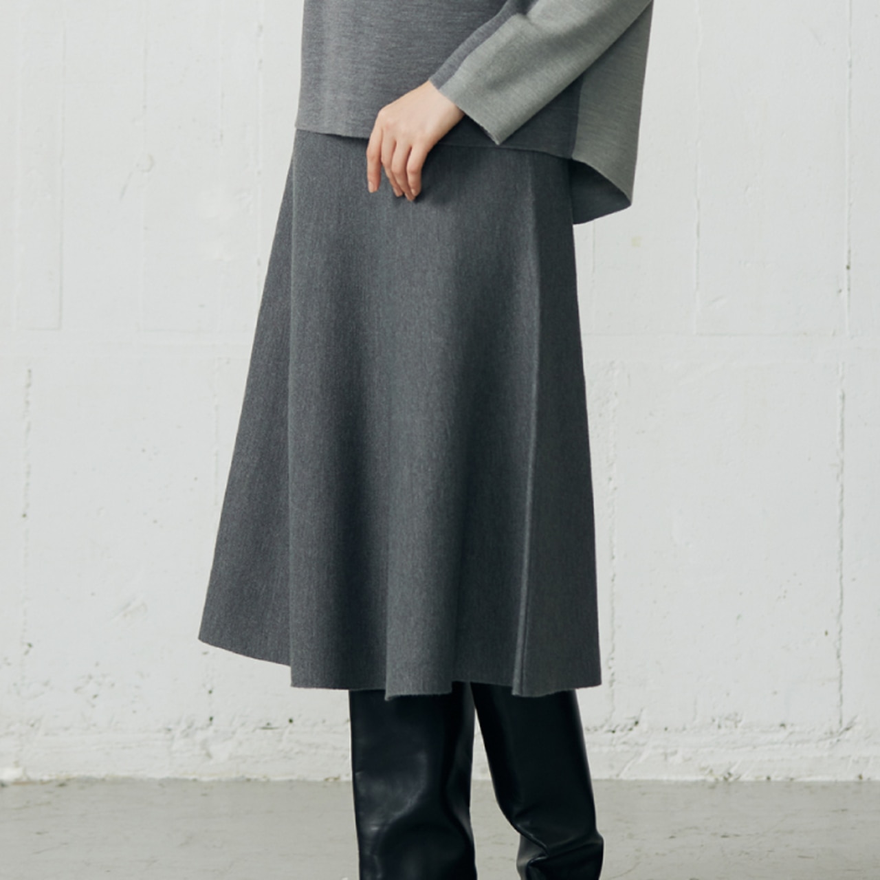 ニットの心地よさとフレアの美しいラインを併せ持った大人の女性にふさわしい上品なスカート。ミラノリブ特有の密に編み立てられた生地は、適度なハリ感と端正さを備え、理想的なフレアシルエットを描きます。品よくセットアップで着こなすのもあり。