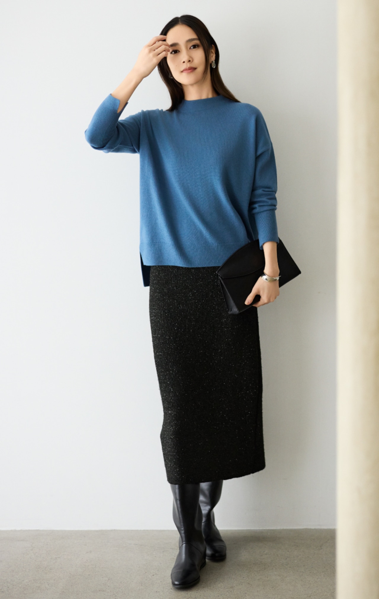 華やぎを秘めながら、決して派手にならない。洗練された大人の輝きを纏わせてくれるスパンコールのニットスカート。タイト過ぎない絶妙なIラインシルエットです。
