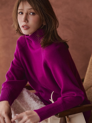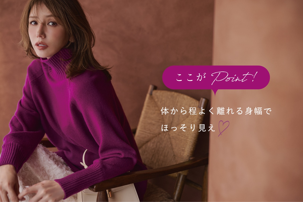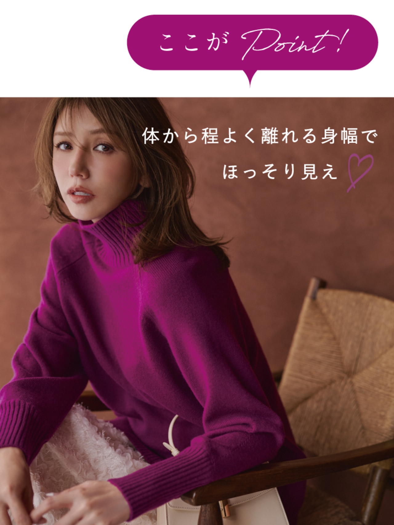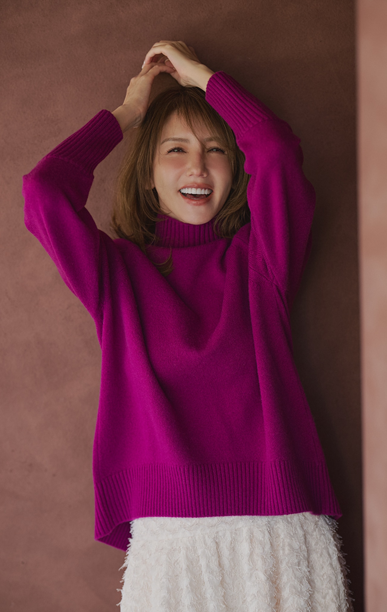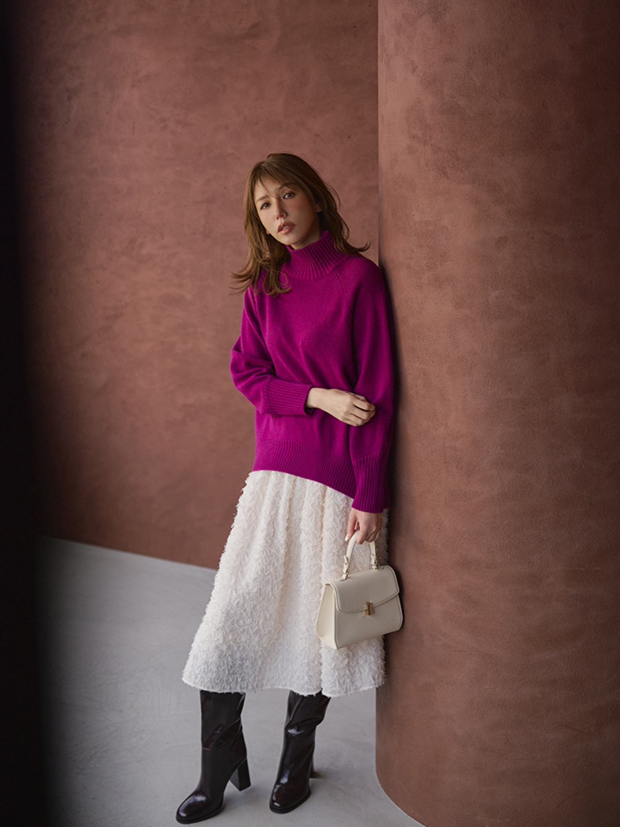思わず目を引くラズベリーは、誰が着ても美人見えする一枚。ゆるっとこなれたシルエットに、ふんわり揺らめくアイボリーのスカートを合わせたスタイルで、大人の可愛さを最大限に引き出す。