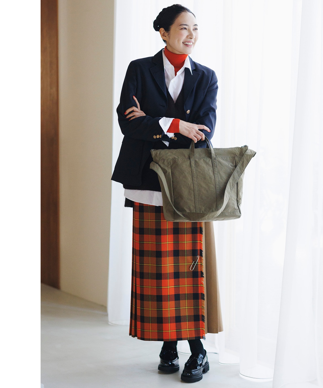 カジュアルスタイルと相性抜群なのは言うまでもなく、大人の女性らしいジャケット&スカートスタイルに暖かみを与えてくれるワンポイントとしても活躍するカーキ。