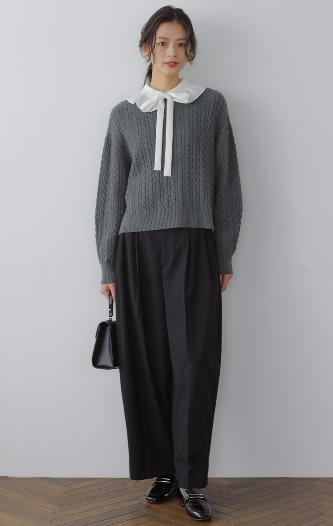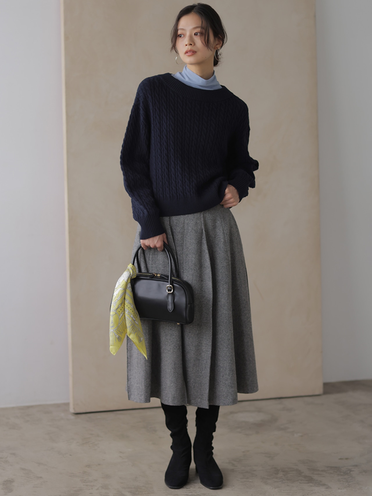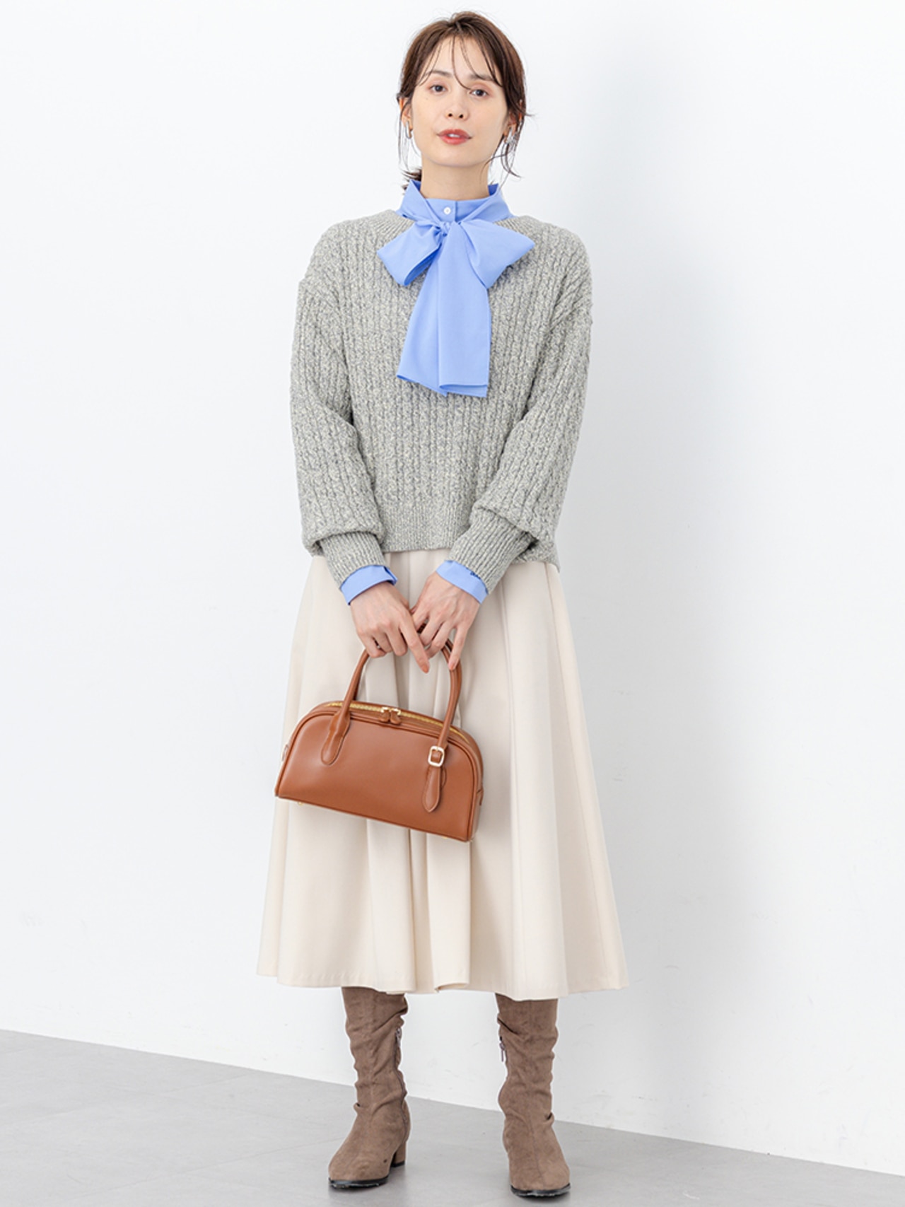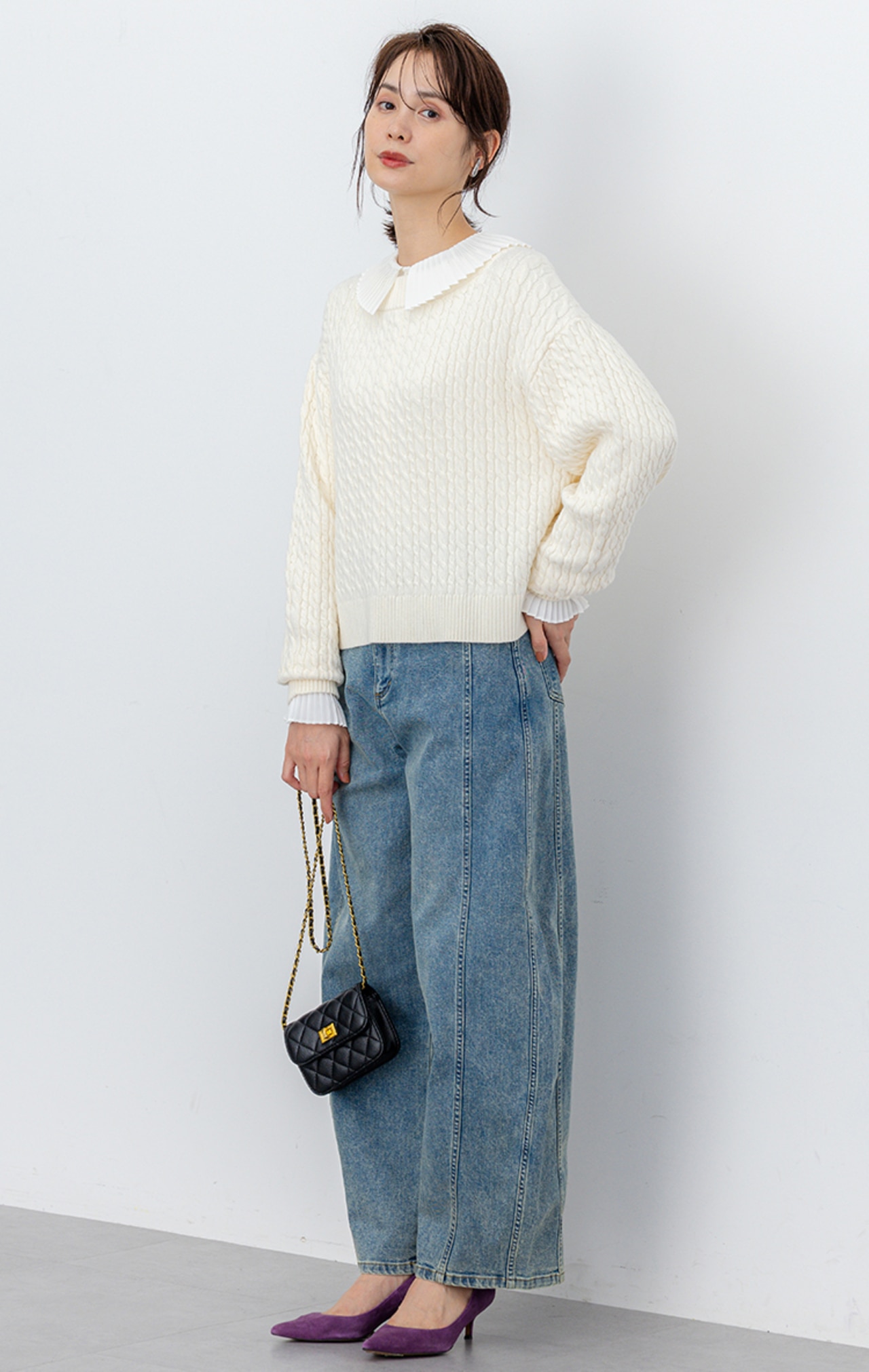 上品なアイボリーニットはプリーツブラウス+カーヴィーデニムで抜け感をミックス。足元は差し色を加えてメリハリを。