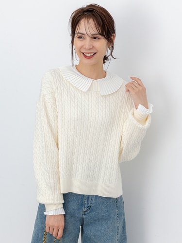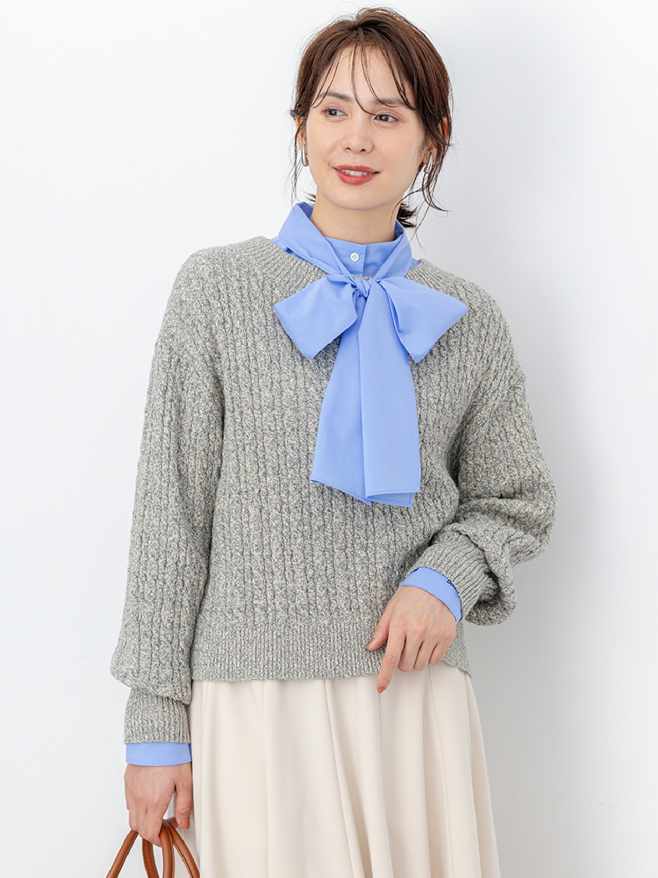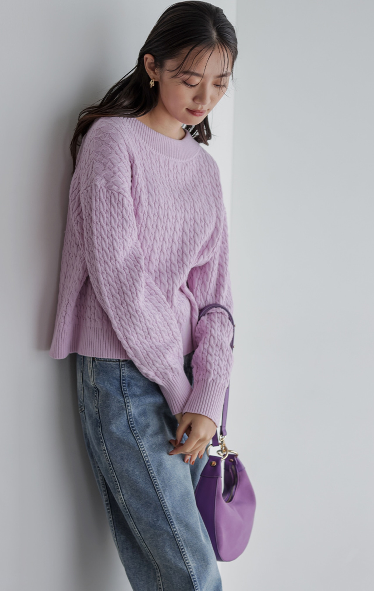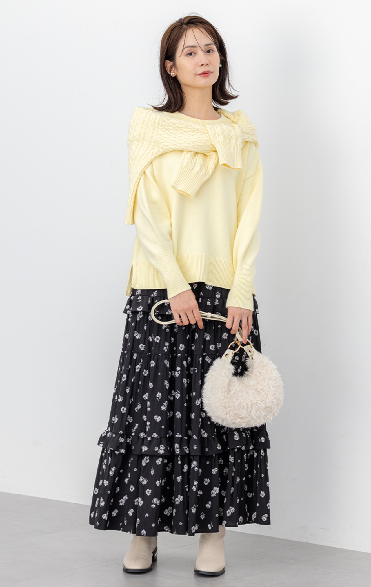 上品なアイボリーニットはプリーツブラウス+カーヴィーデニムで抜け感をミックス。足元は差し色を加えてメリハリを。