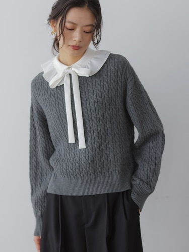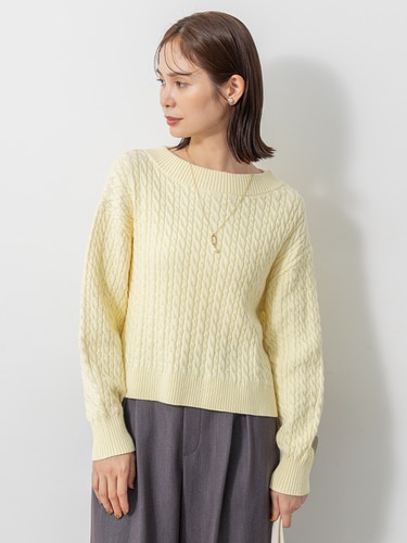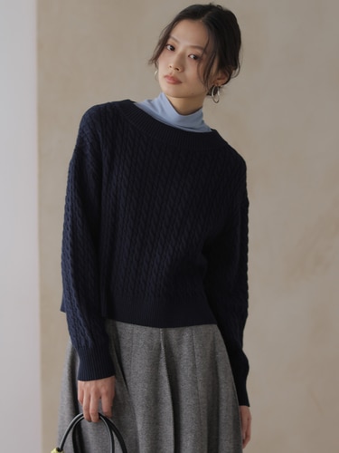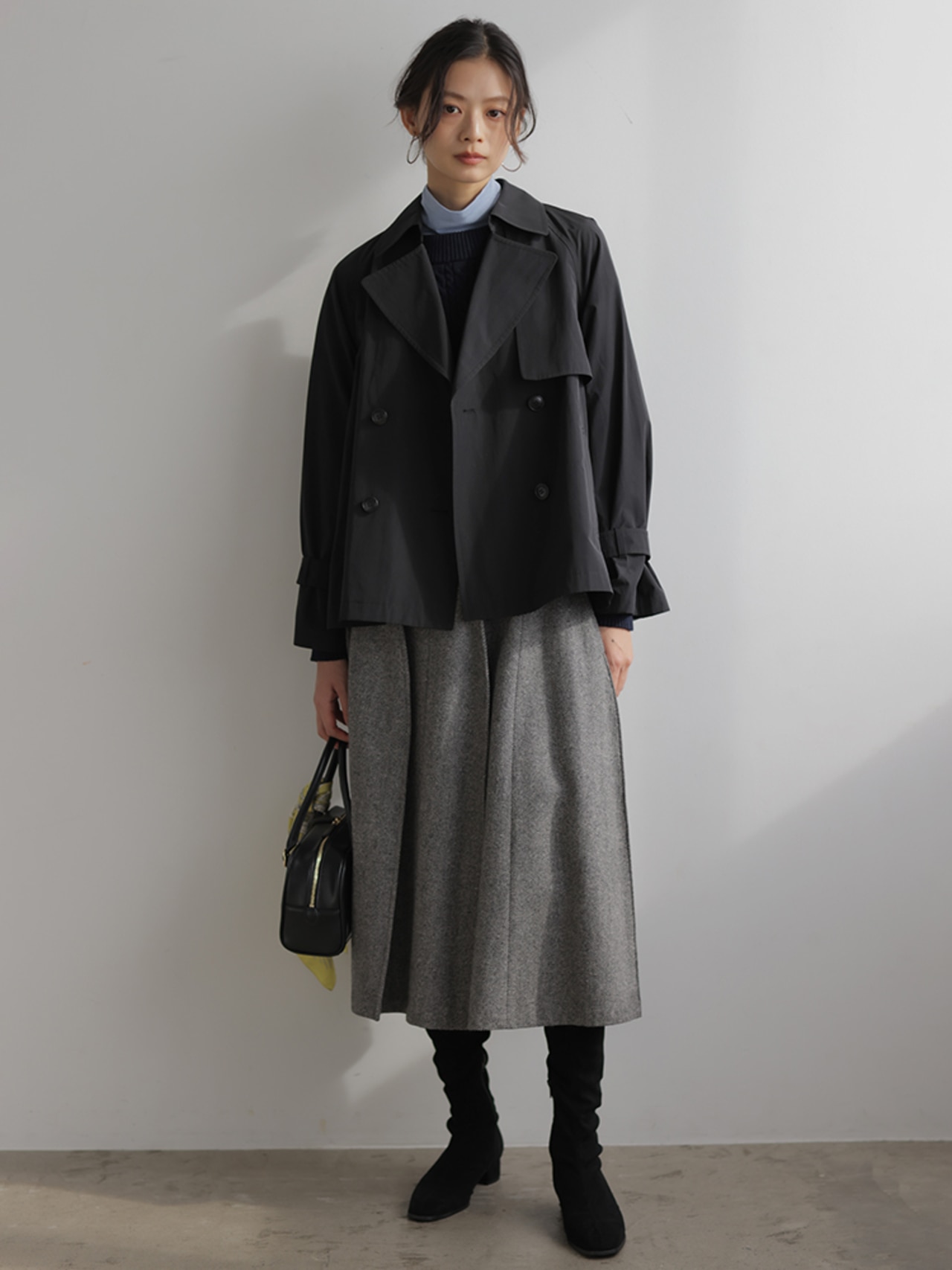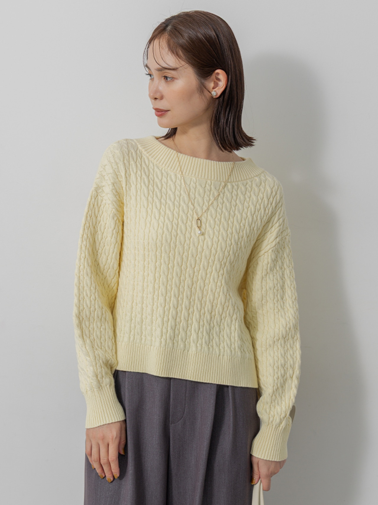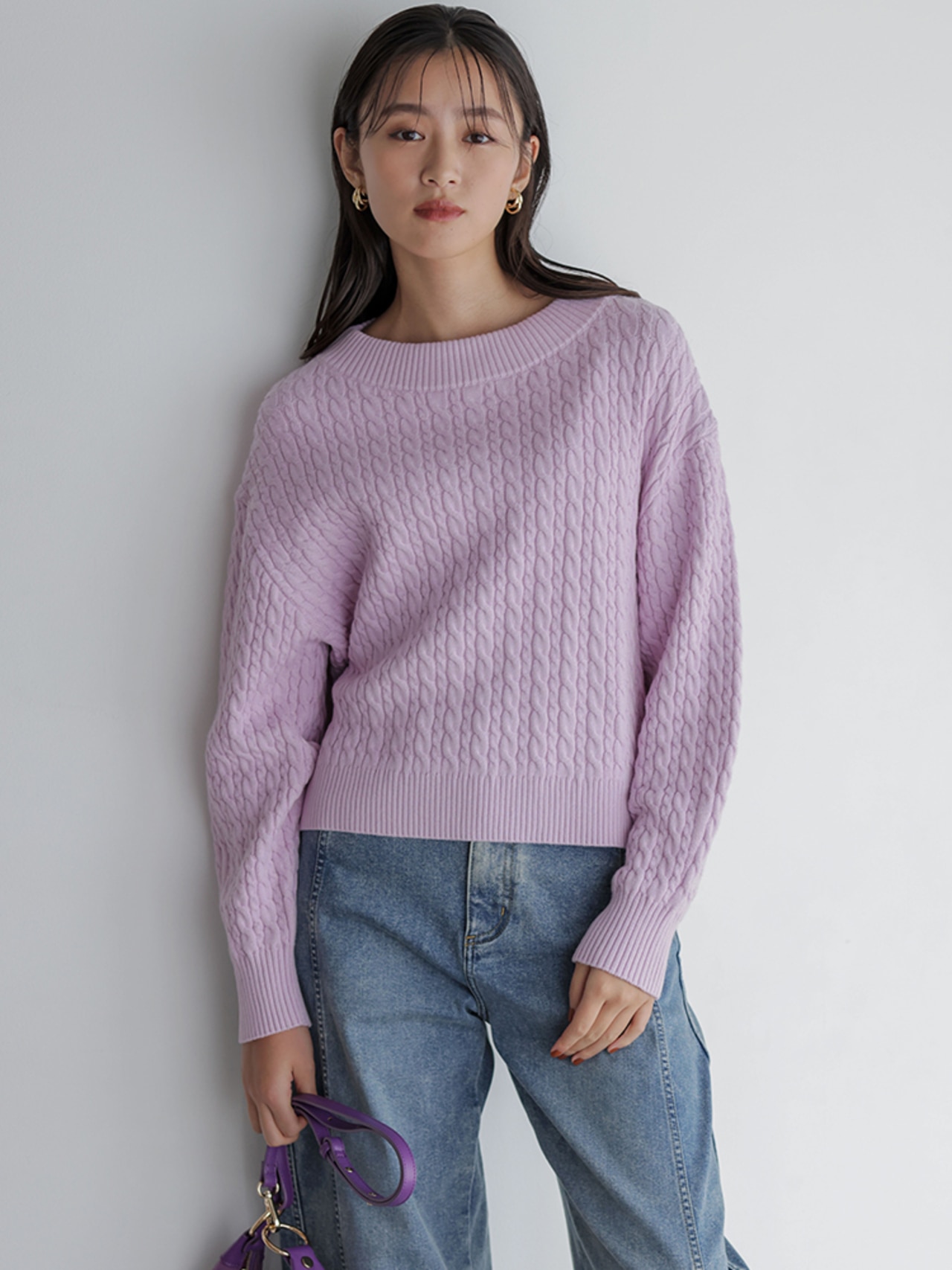 上品なアイボリーニットはプリーツブラウス+カーヴィーデニムで抜け感をミックス。足元は差し色を加えてメリハリを。