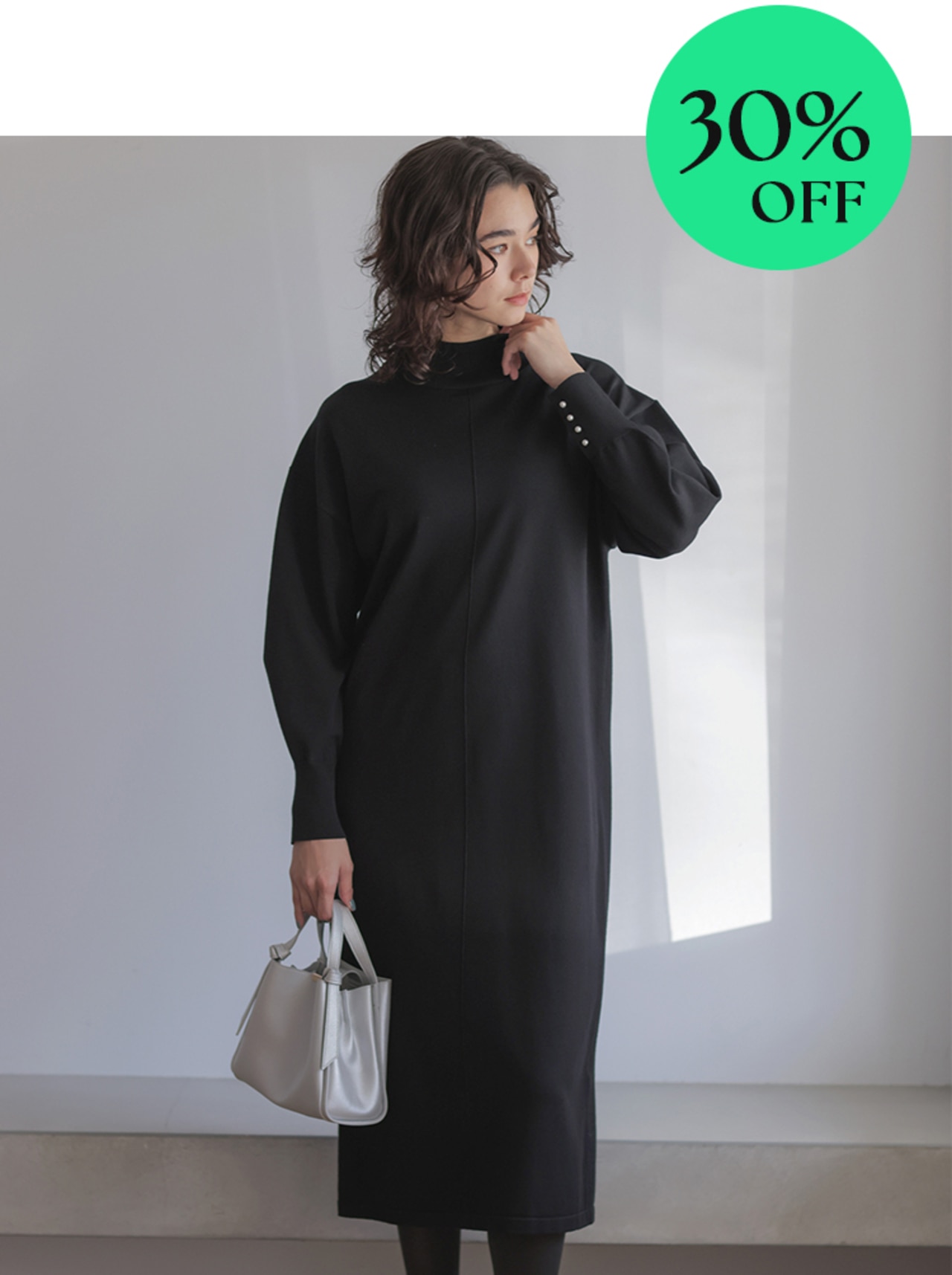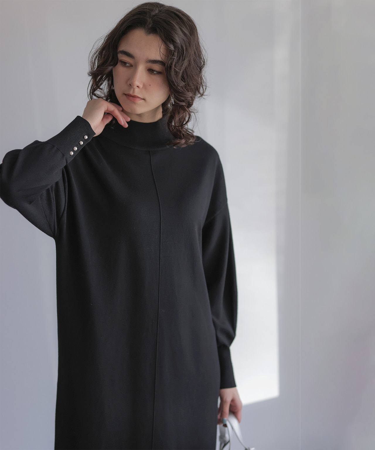 シンプルなデザインながら袖口のパール調ボタンや程よいハイネックなどこだわりの詰まった1枚です。