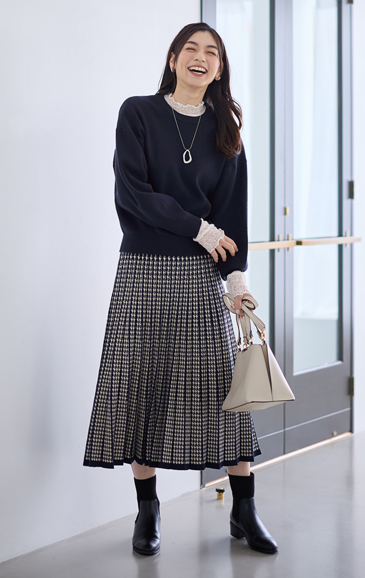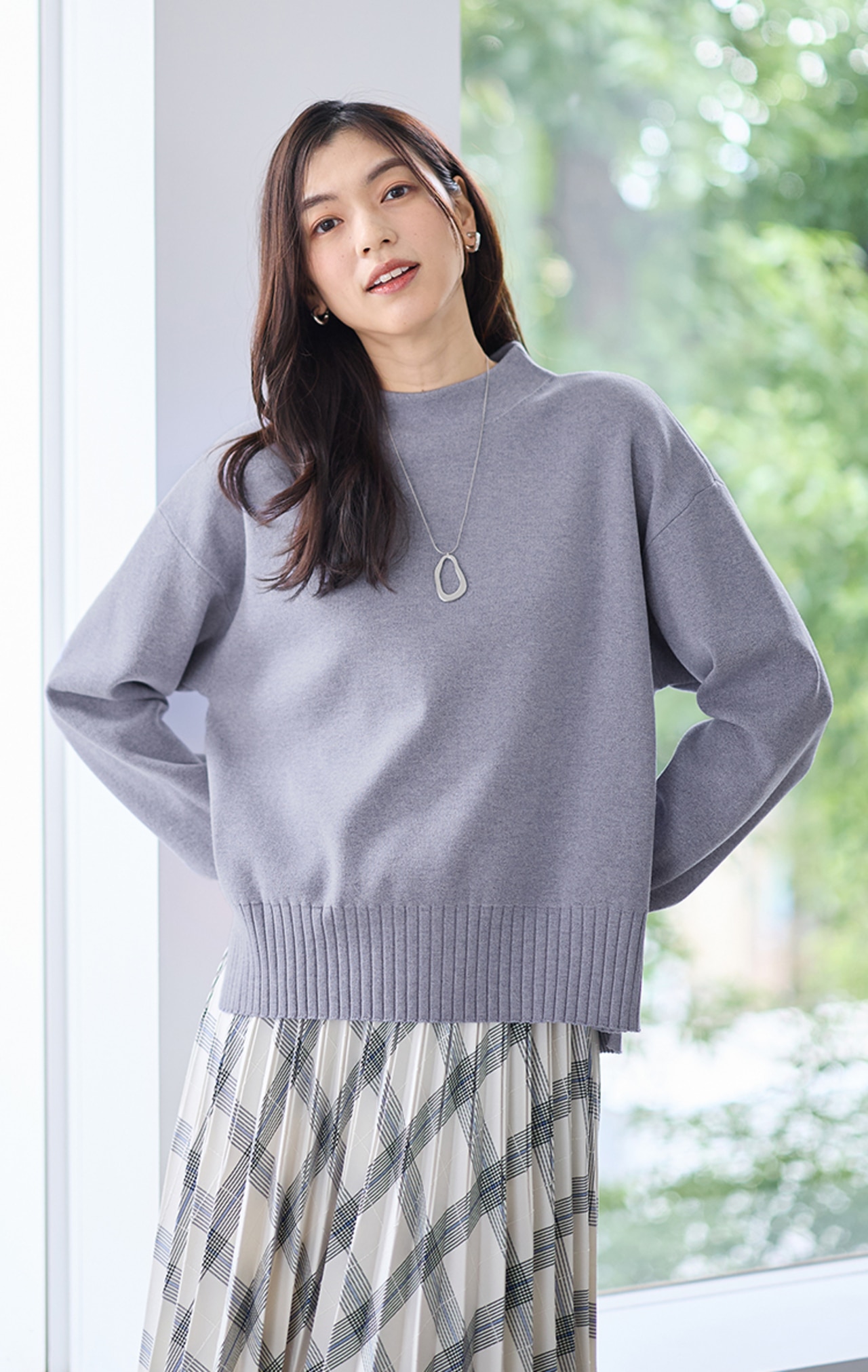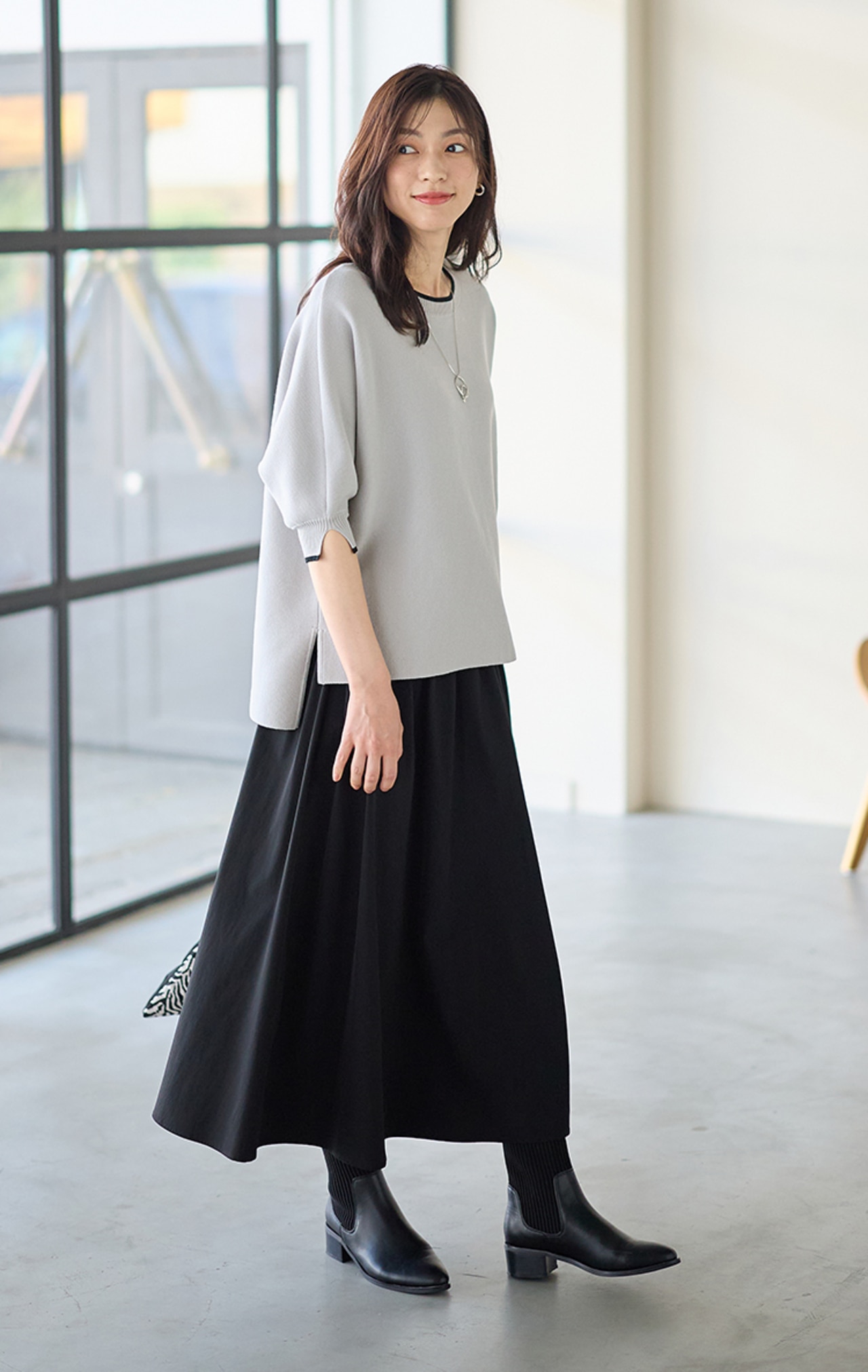肩まわりをふんわりカバーするドルマンスリーブのニットと、ふわっとした広がりがきれいなスカートのセットアイテム。これだけでコーデが決まるので忙しい朝にも頼れます。