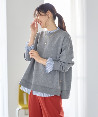 カジュアルにもきれいめにも幅広く活躍する、スウェットとニットのいいとこ取りアイテム。袖口&後ろ裾のスリットがさりげない抜け感を演出します。腰まわりをすっきりとカバーする、ふわっと優しく包み込むシルエットです。