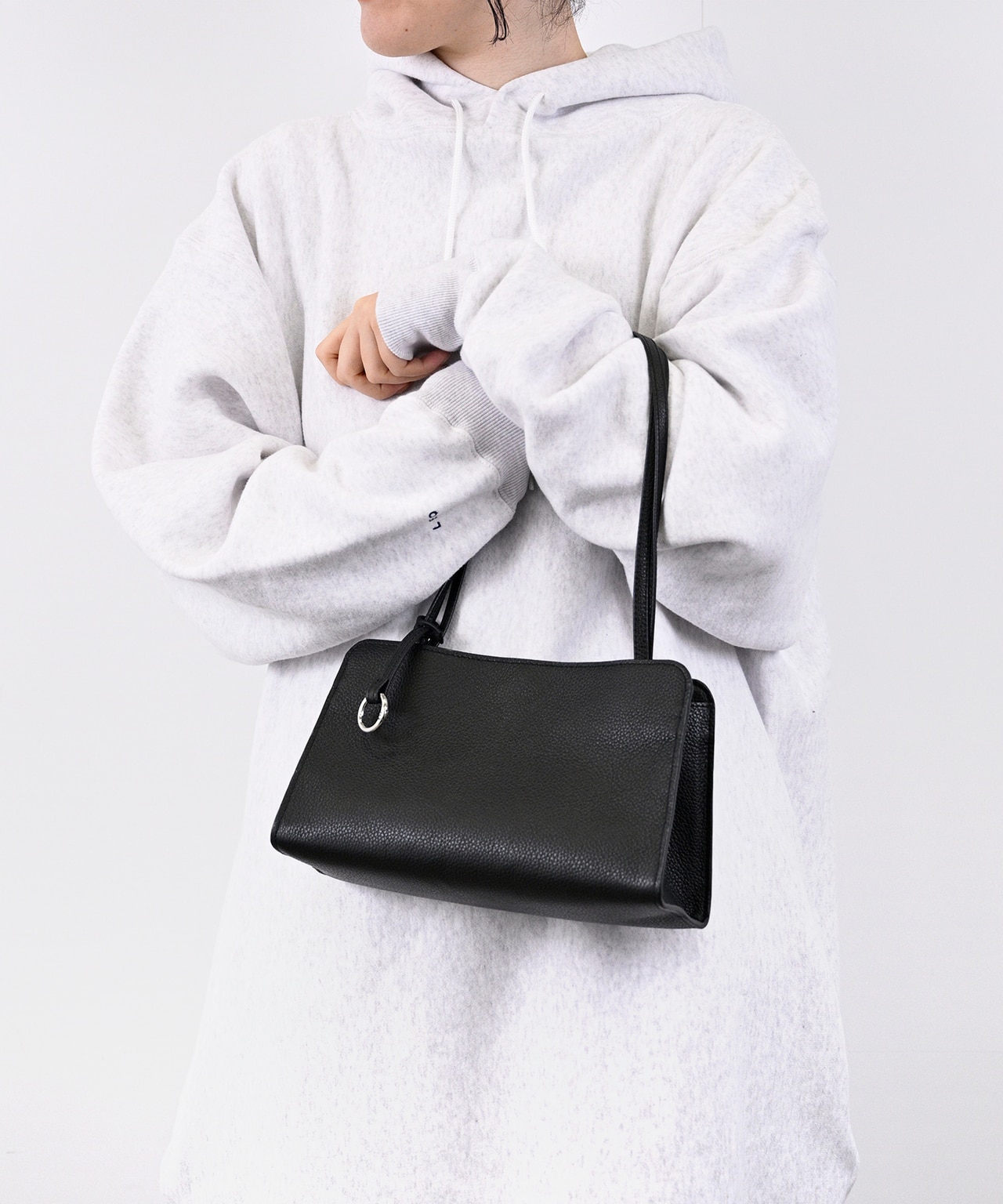 スウェットワンピースにブラックバッグを合わせた、軽やかなデイリースタイル。カジュアルな装いも、レザーの質感が全体をすっきりとまとめます。