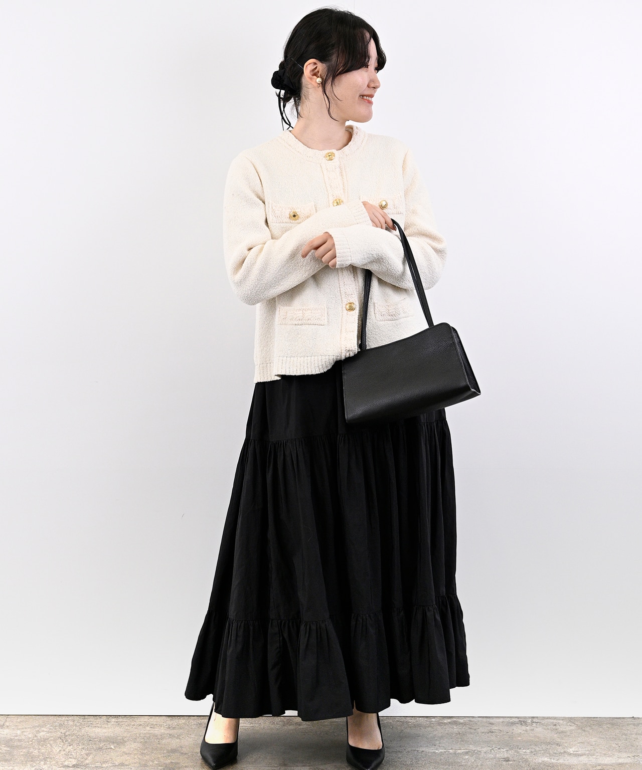 ブラックバッグを肩掛けすることで、甘くなりすぎず全体を引き締めます。