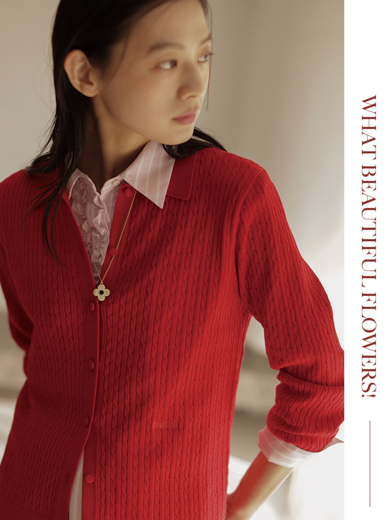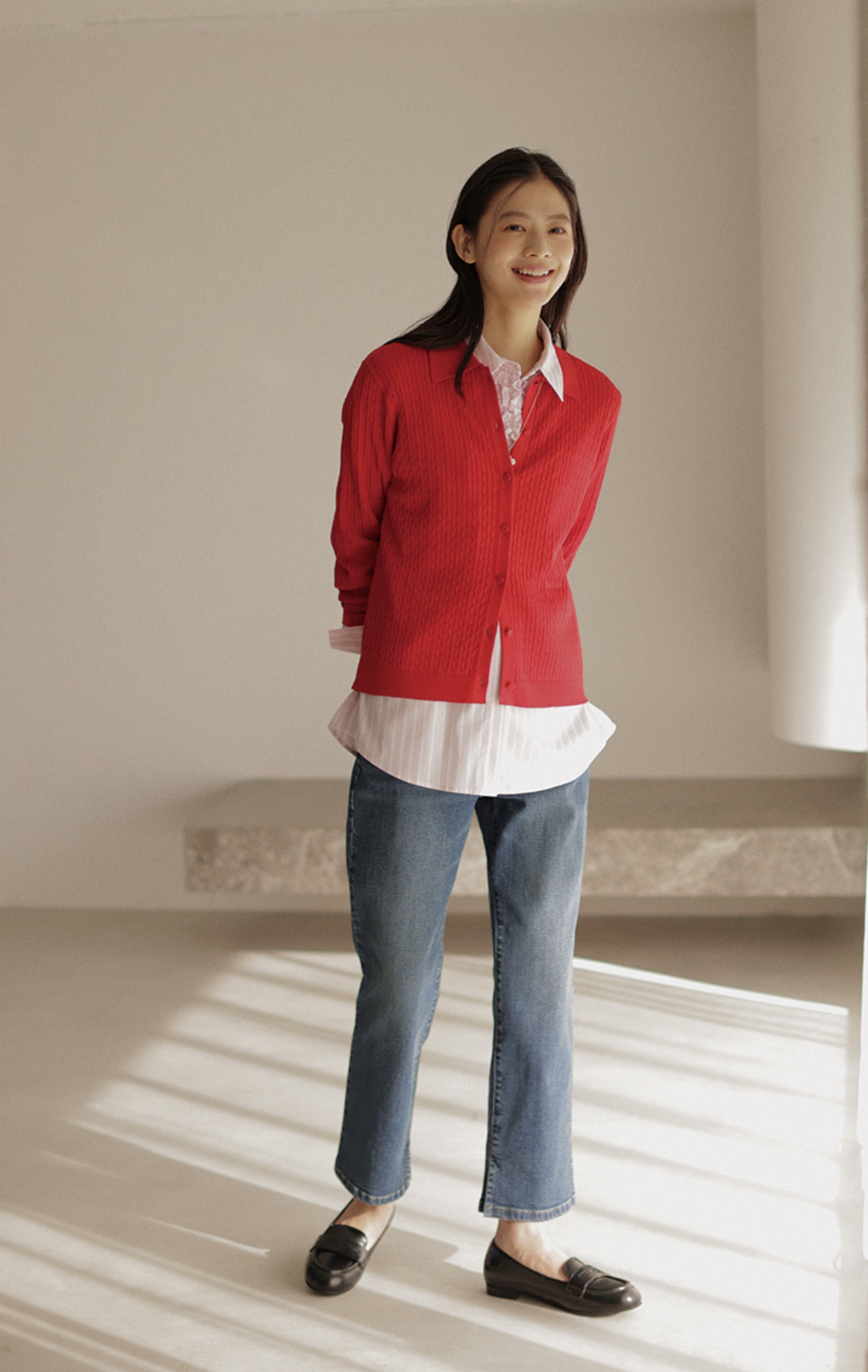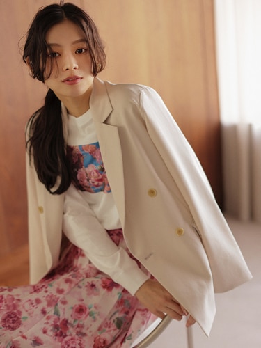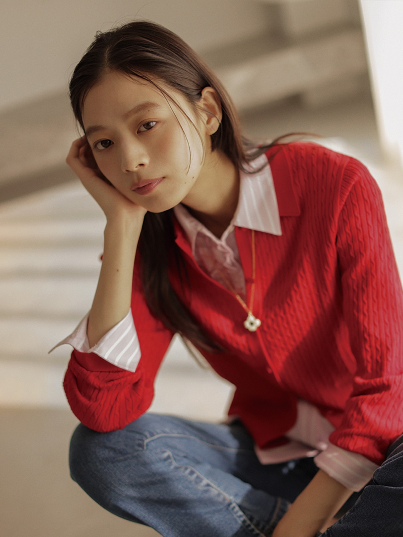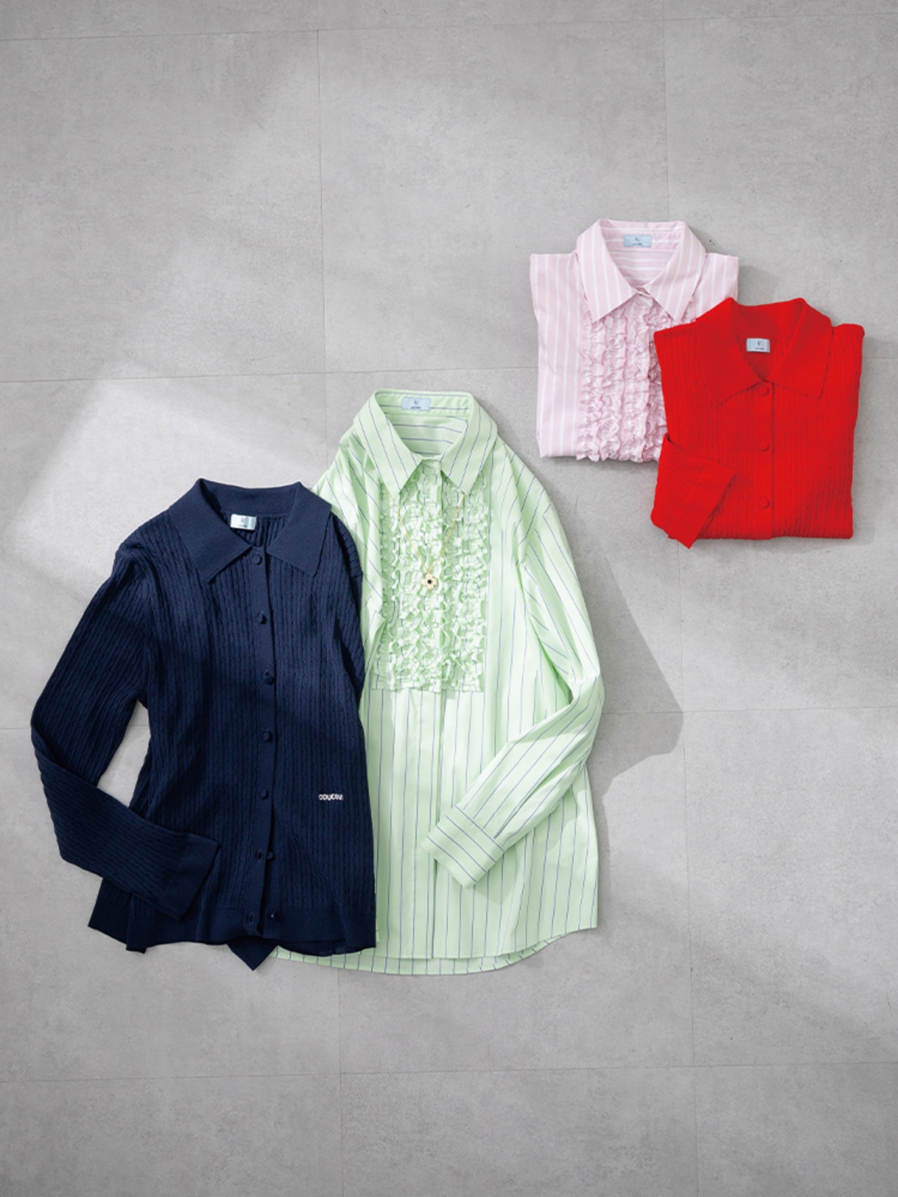 COUCOUの文字が何ともチャーミングなカーディガン。襟や裾から覗くパステルカラーのストライプシャツや花のネックレスが春を連想させスタイリングに華を添えます。