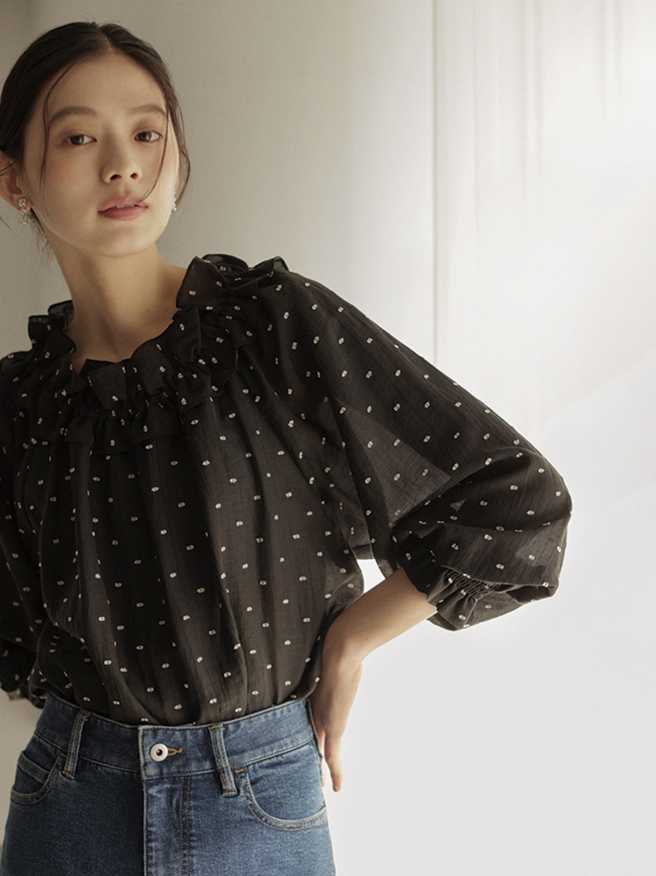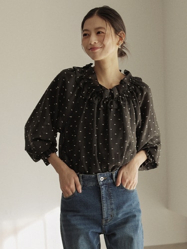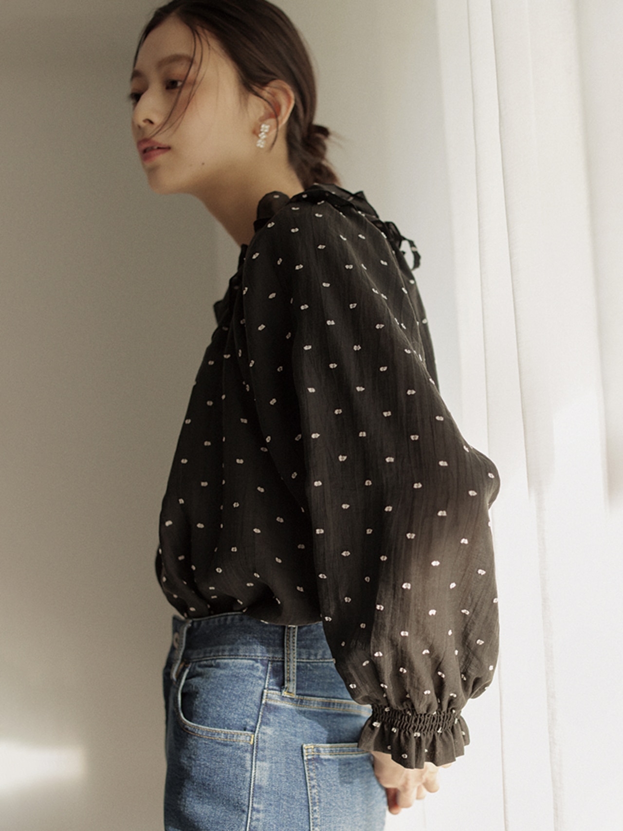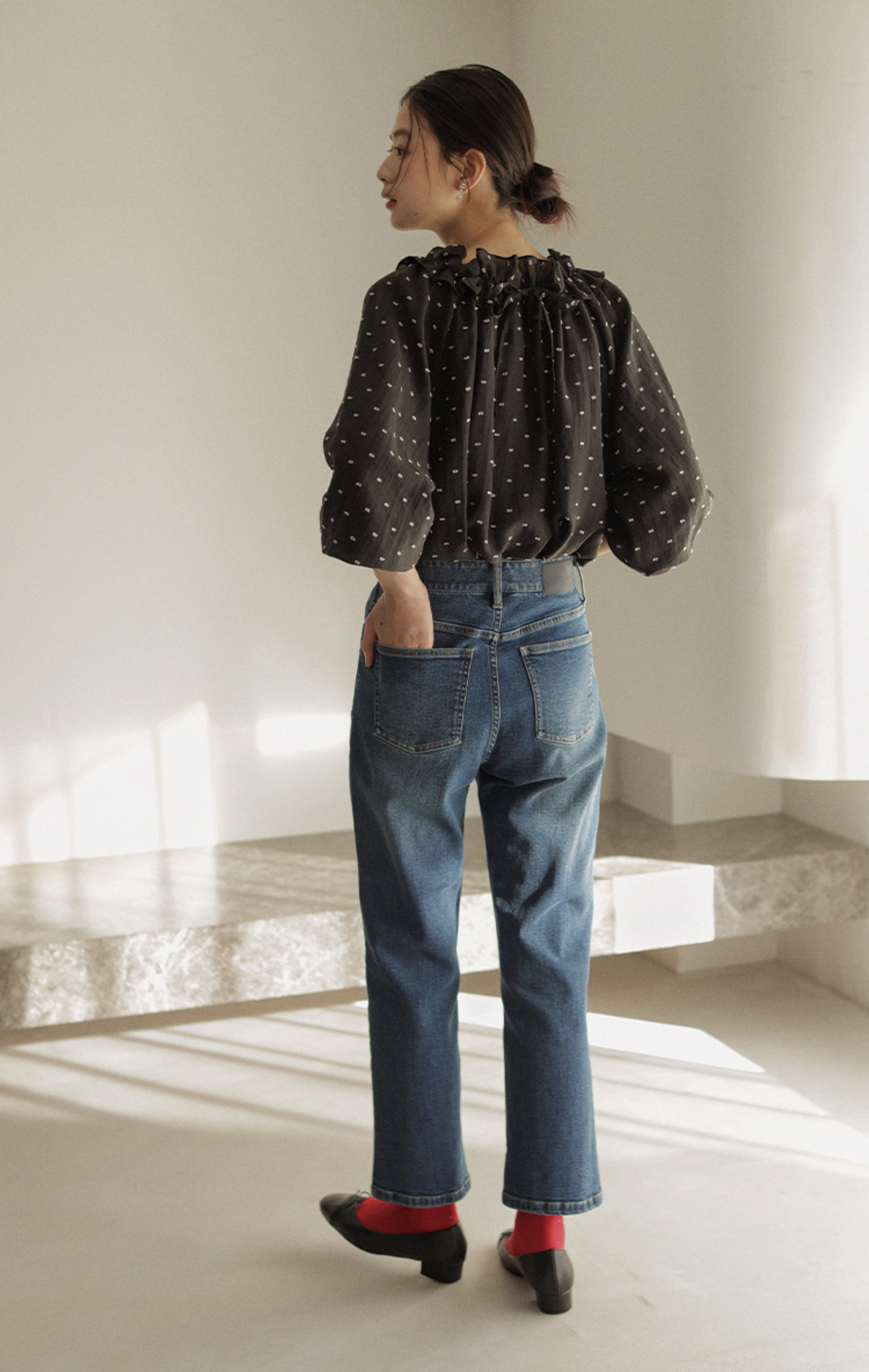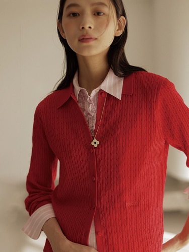 COUCOUの文字が何ともチャーミングなカーディガン。襟や裾から覗くパステルカラーのストライプシャツや花のネックレスが春を連想させスタイリングに華を添えます。