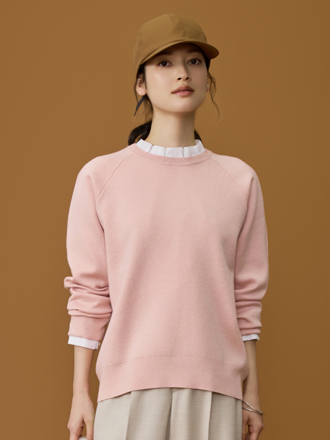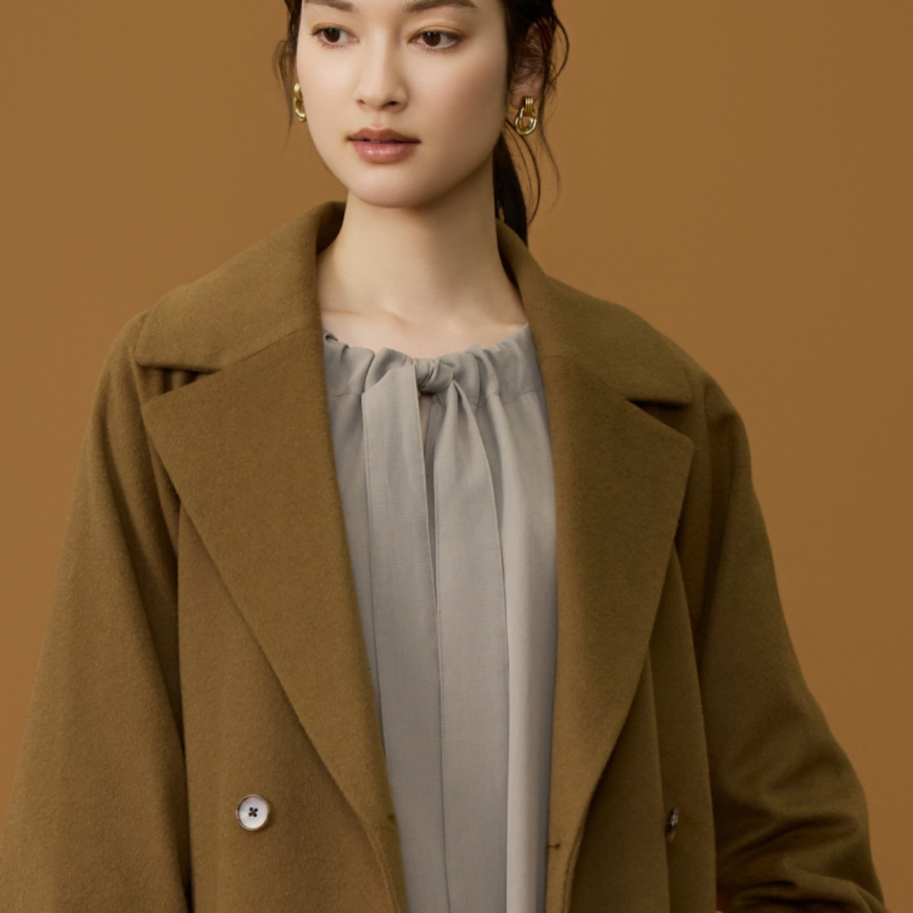 高品質なウールを丁寧に起毛させたライトビーバーのコート。なめらかな肌触りと軽やかさ、そして動くたびに生地の上質さが際立つ一着。深みのあるキャメルカラーの温もりが大人の女性に相応しい品格を添えます。