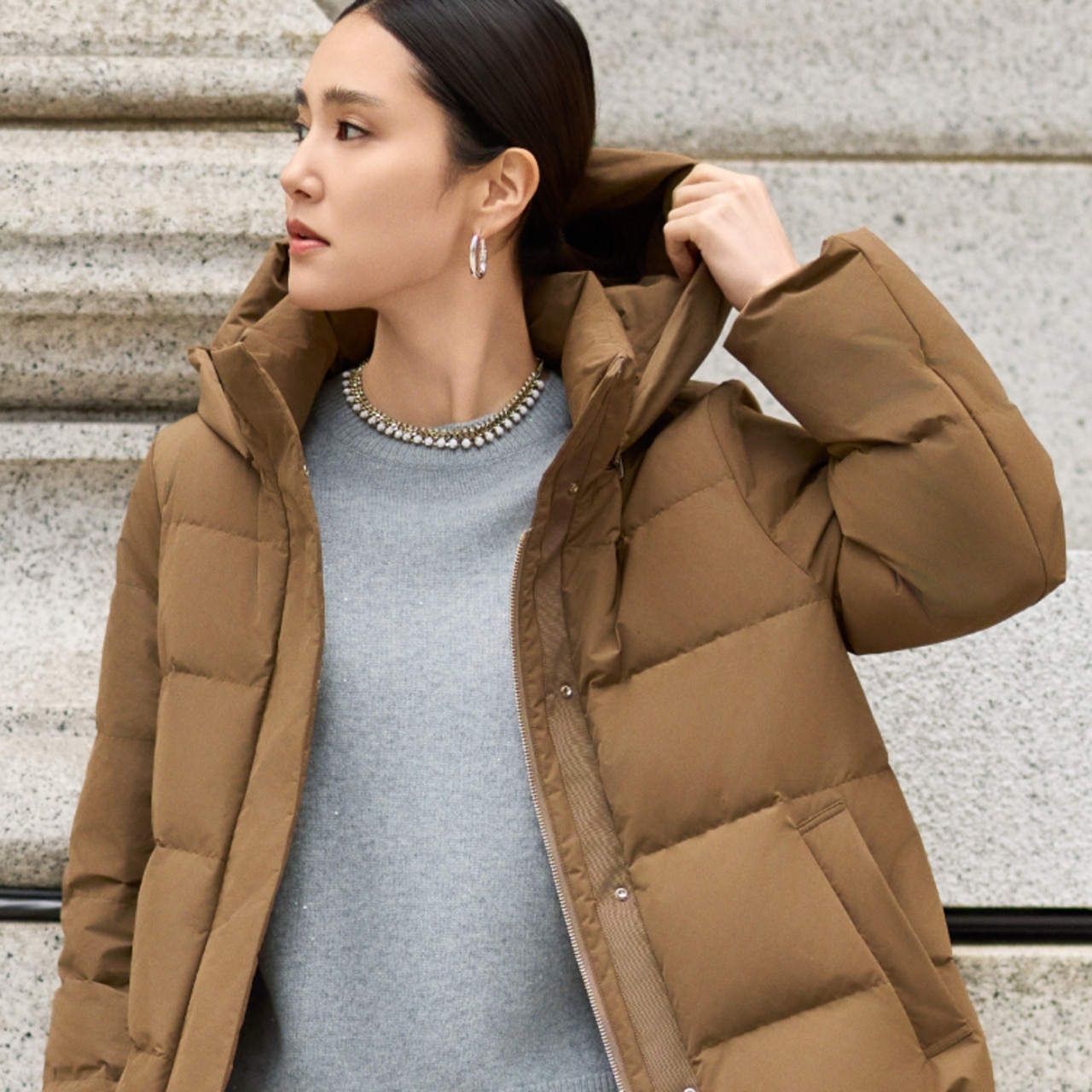 上質な微光沢を放つショートダウンコート。ほどよく華やぎながらも知的な印象を与えるキャメルカラー。首元はたっぷりとボリュームを持たせ、今年らしいバランスで。