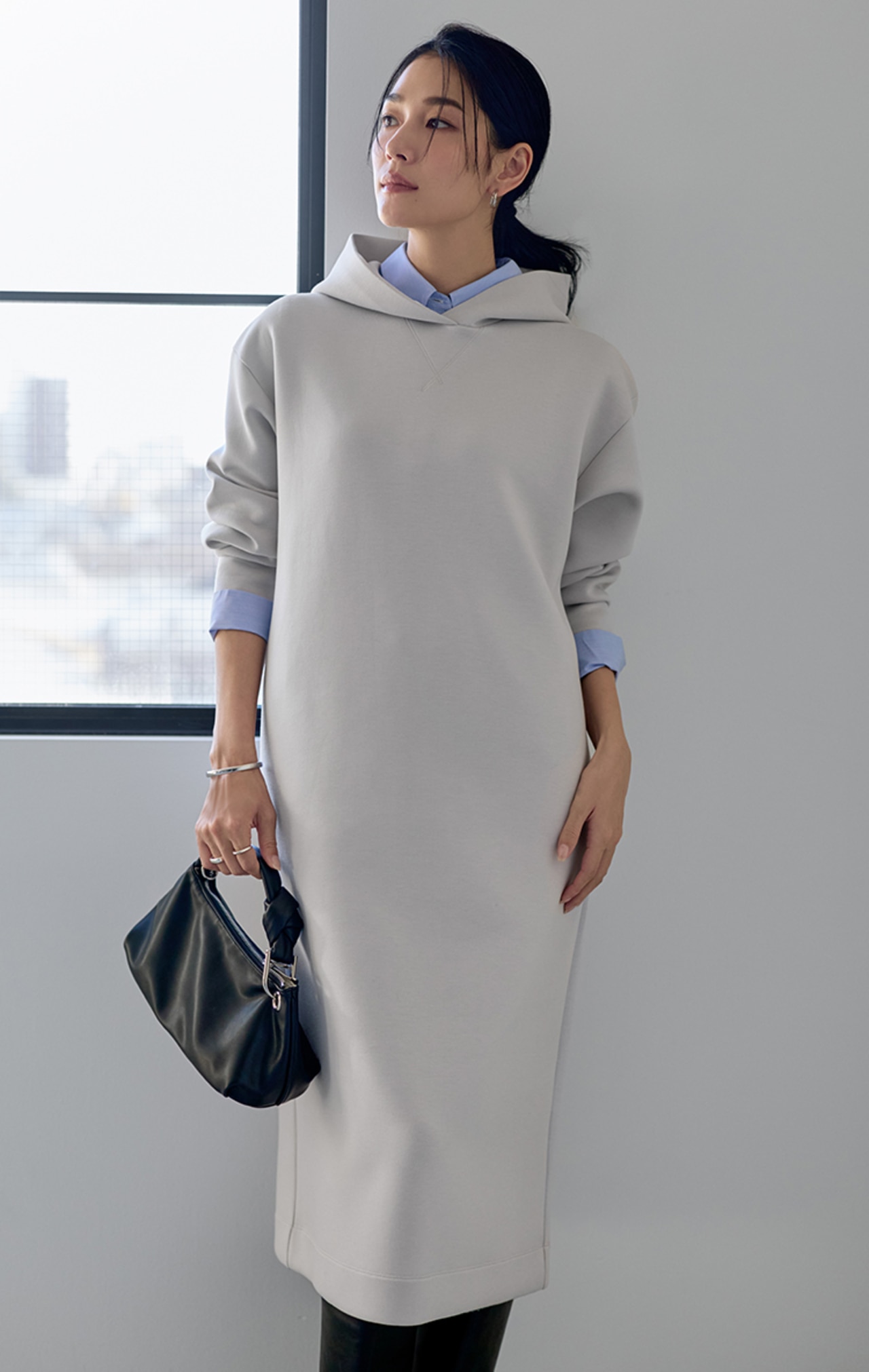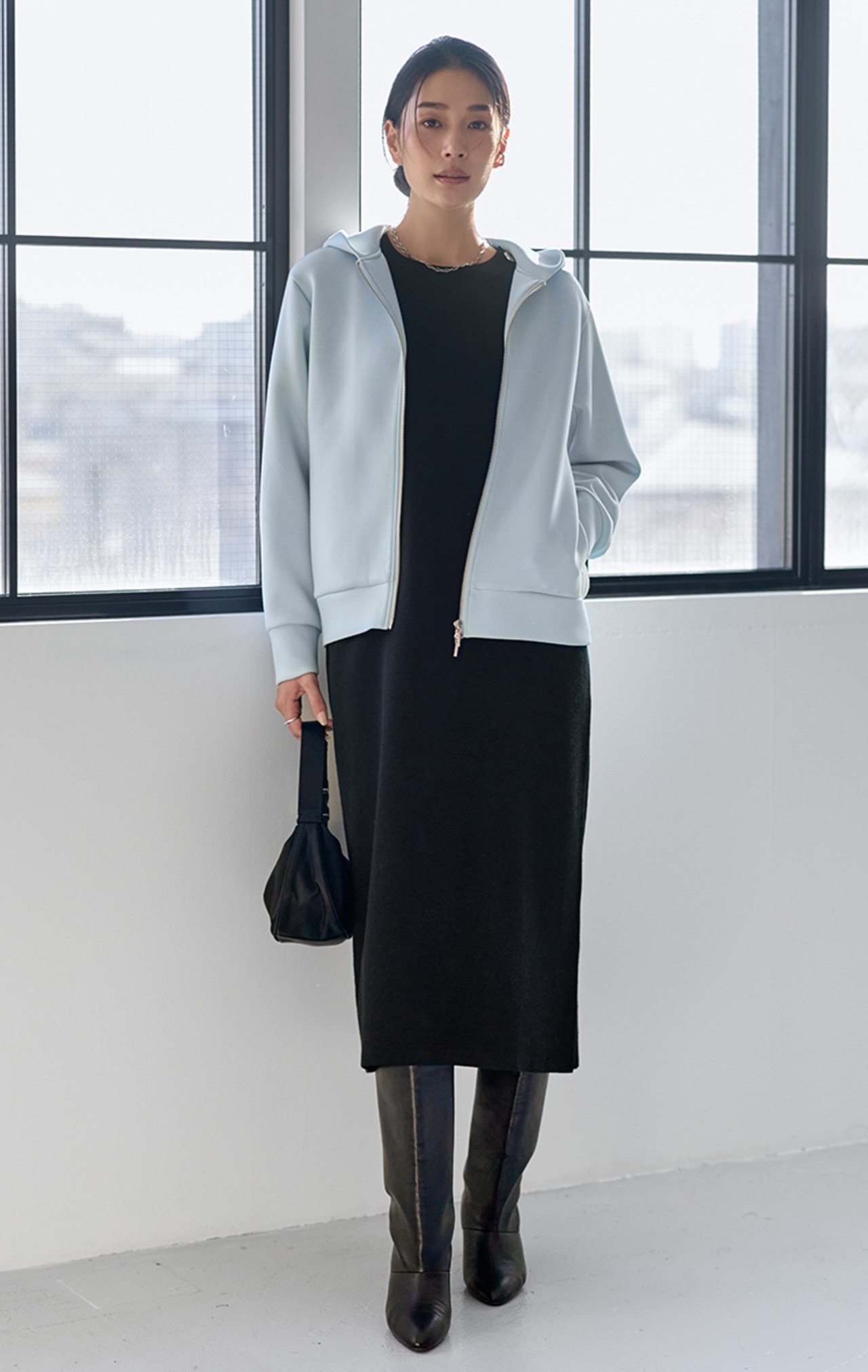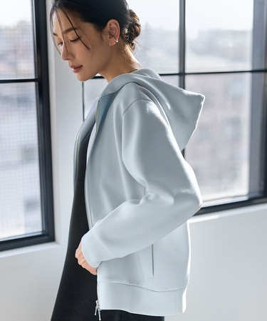 脱ぎ着で気温調整のしやすいジップアップフーディー。ダブルジップなので、上を開けても下を開けても着て頂け、好みの位置で抜け感を演出できます。羽織としても、コートインでも長く活躍する1枚。