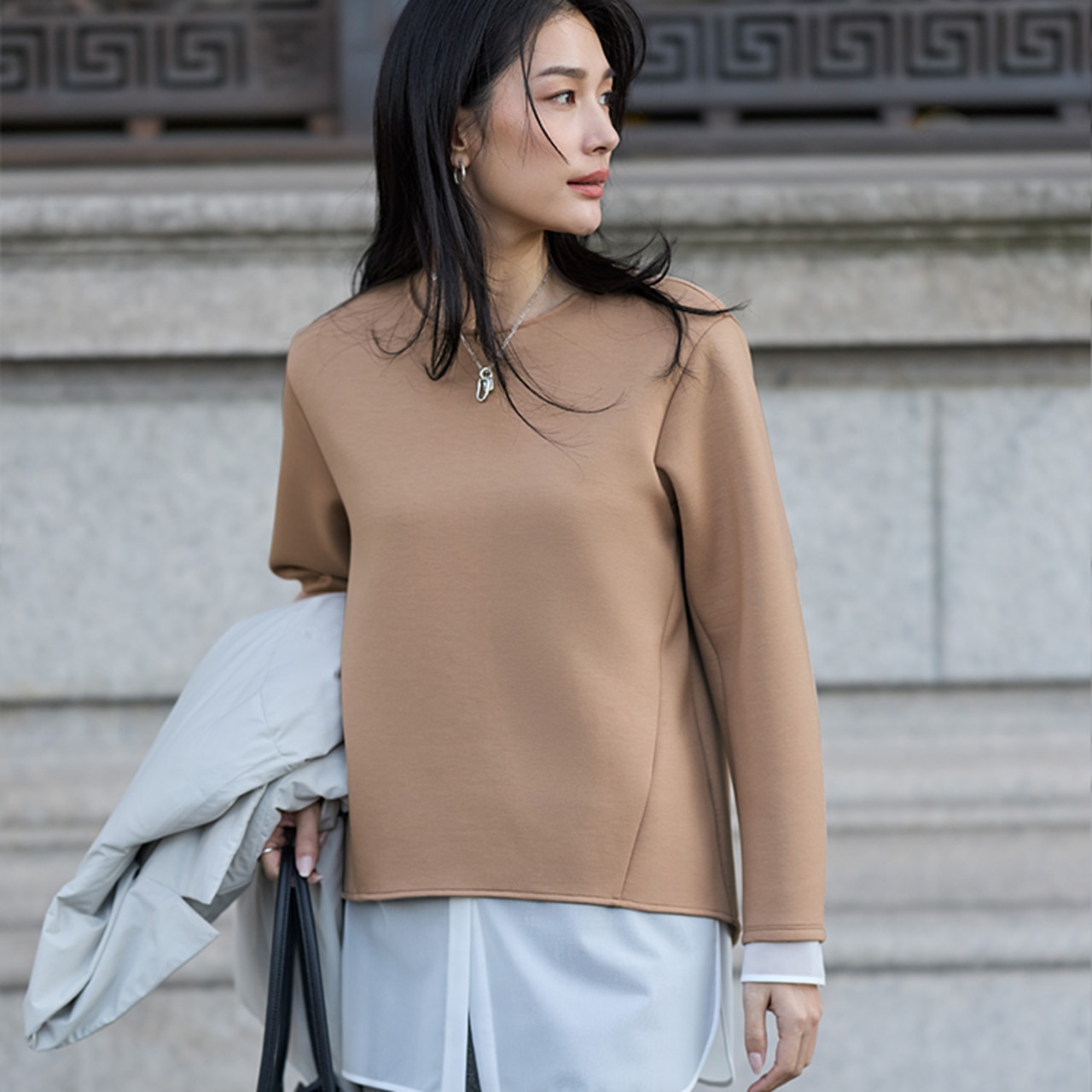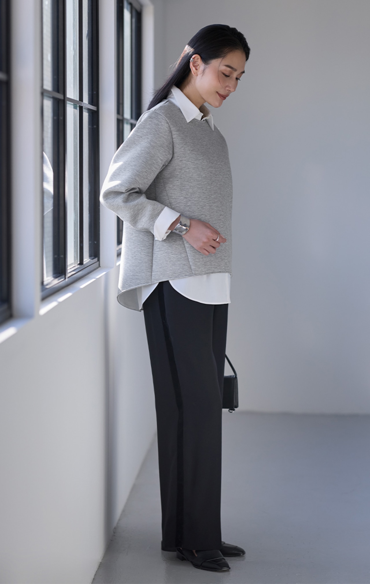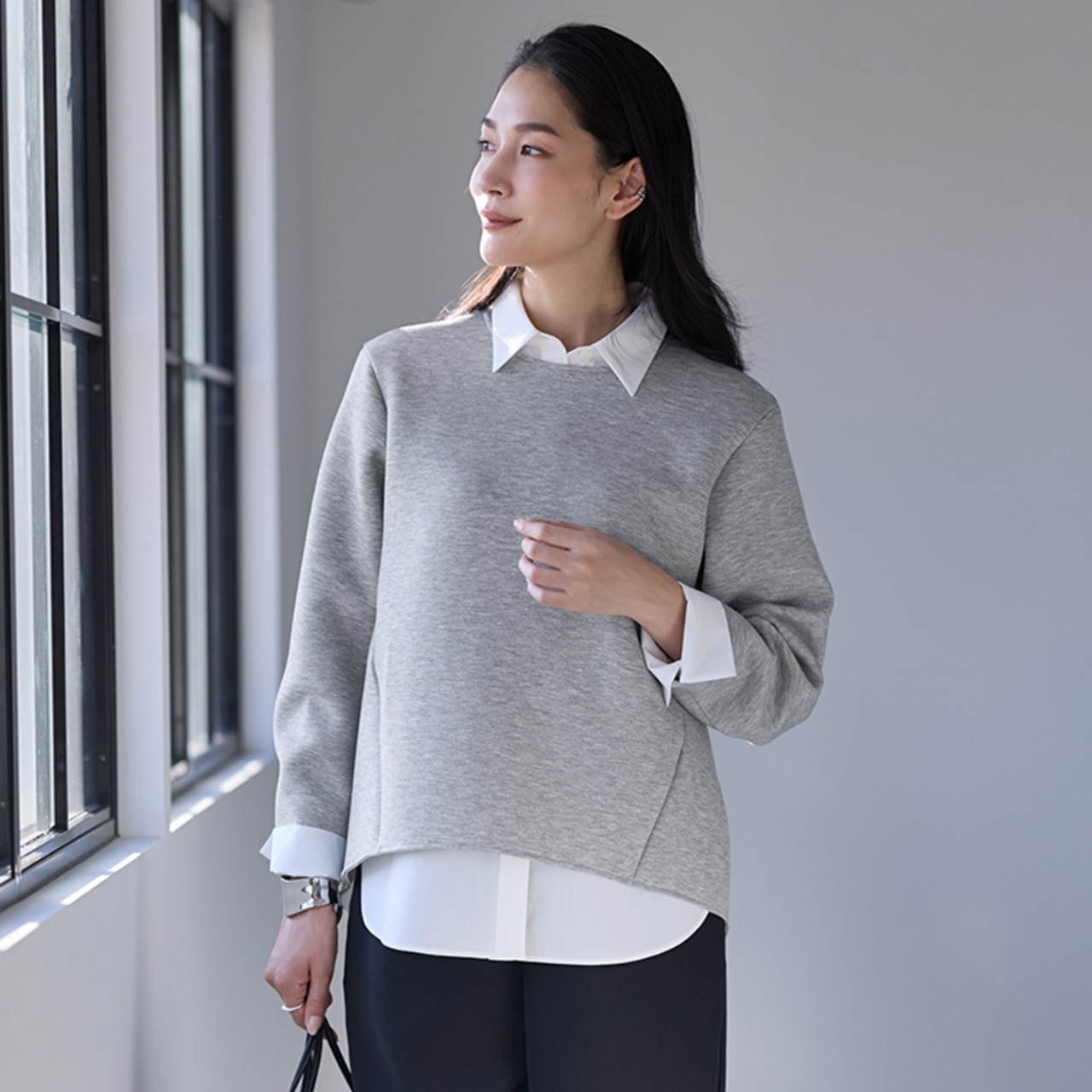 前後差のあるデザインプルオーバー。素材のハリ感を活かした緩やかなフォルムの袖デザインや、バックスリットもポイント。シャツやカットソーを、襟や裾からさり気なく見せるレイヤードスタイルもおすすめです。