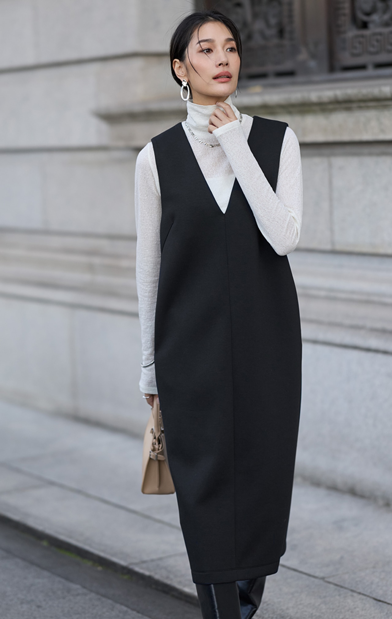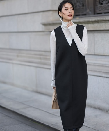 深めのVネックがシャープな印象のジャンパースカート。細見えのシルエットでありながらも、後ろの裾スリットで動きやすさも考慮したデザイン。タートルネックやボウタイブラウスなど、きれいめインナーとの組み合わせで大人っぽく決めて。