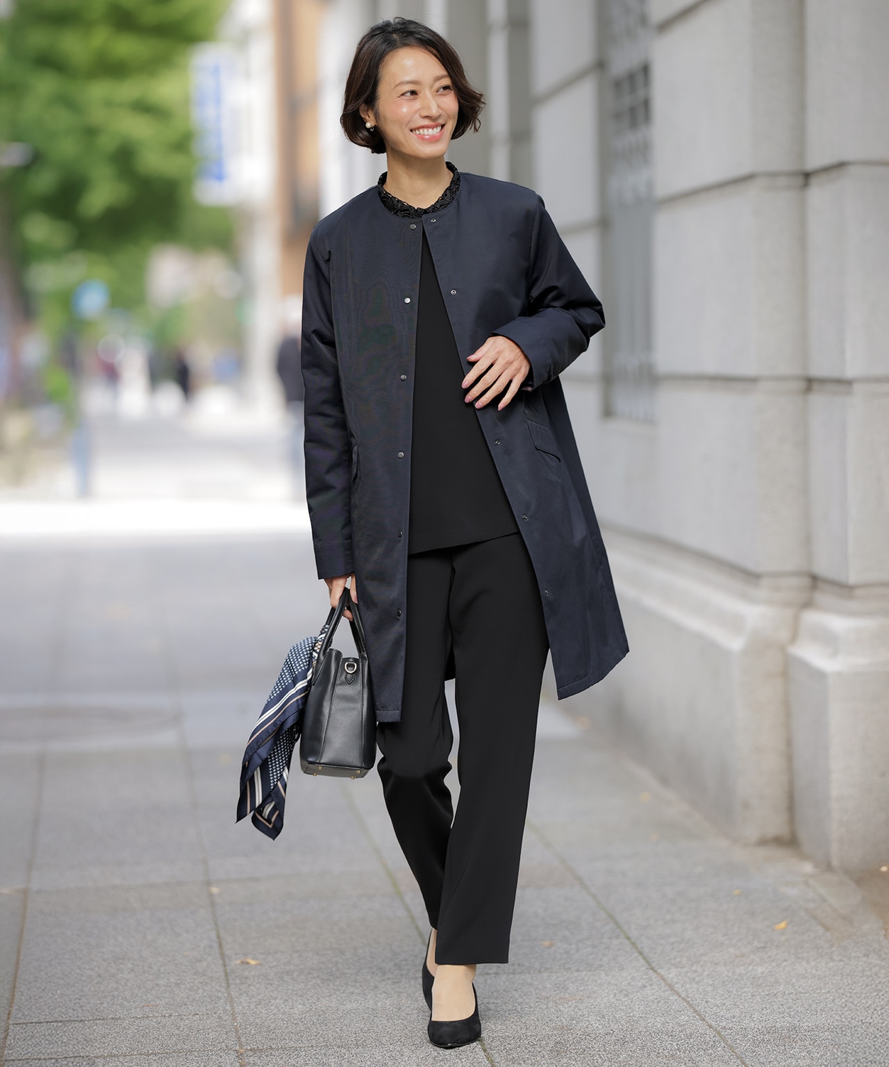 端正なノーカラーコートで叶える、信頼感と自信を与えるダークトーンコーデ