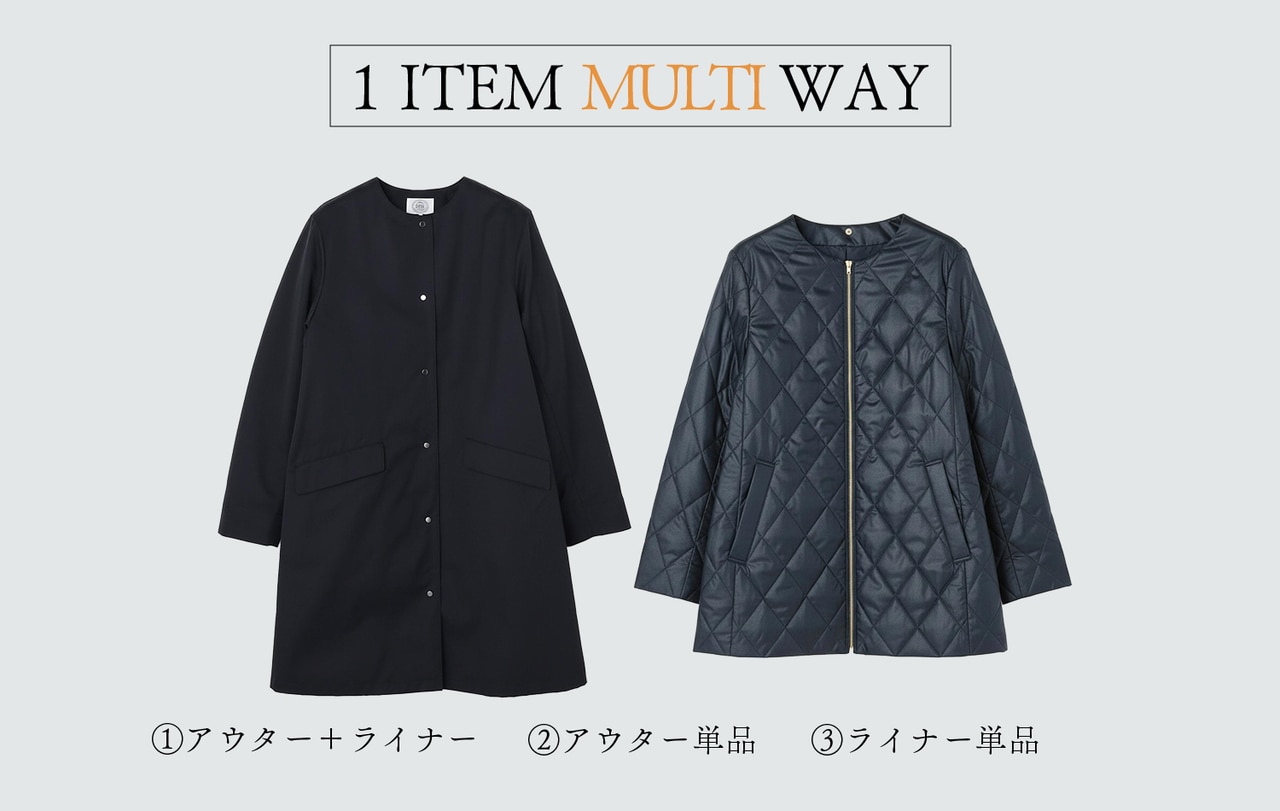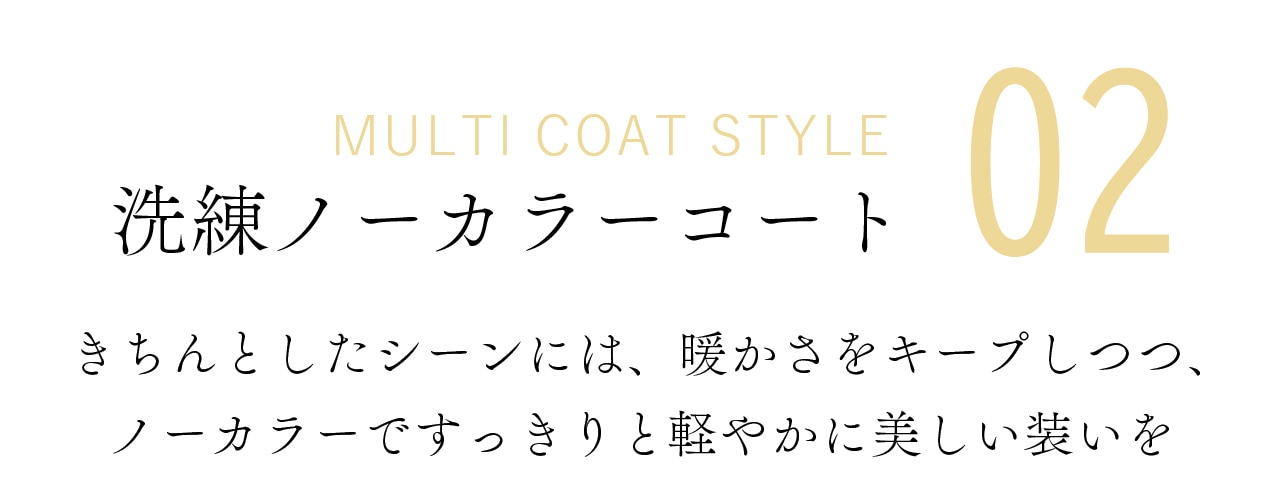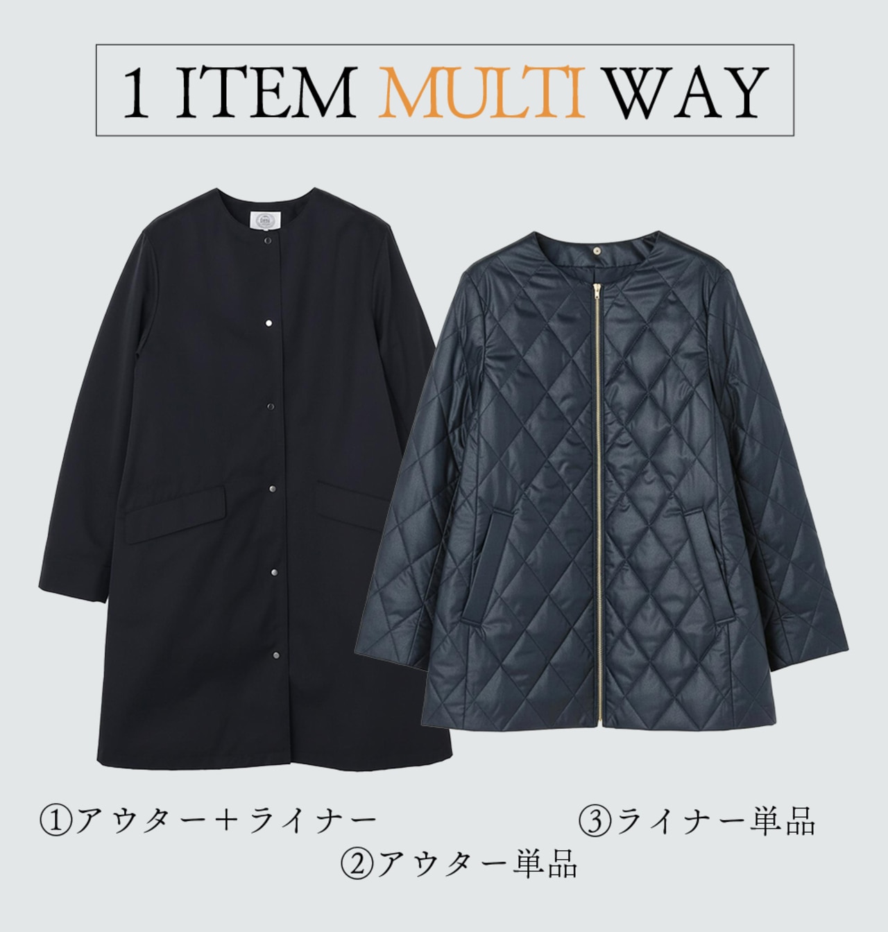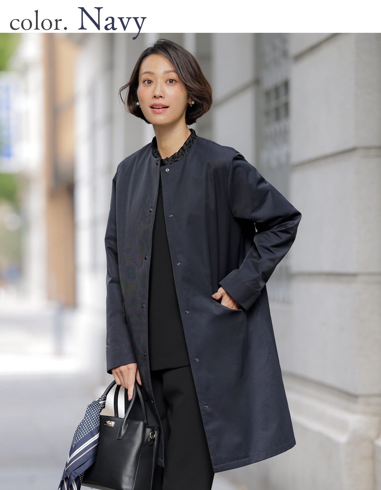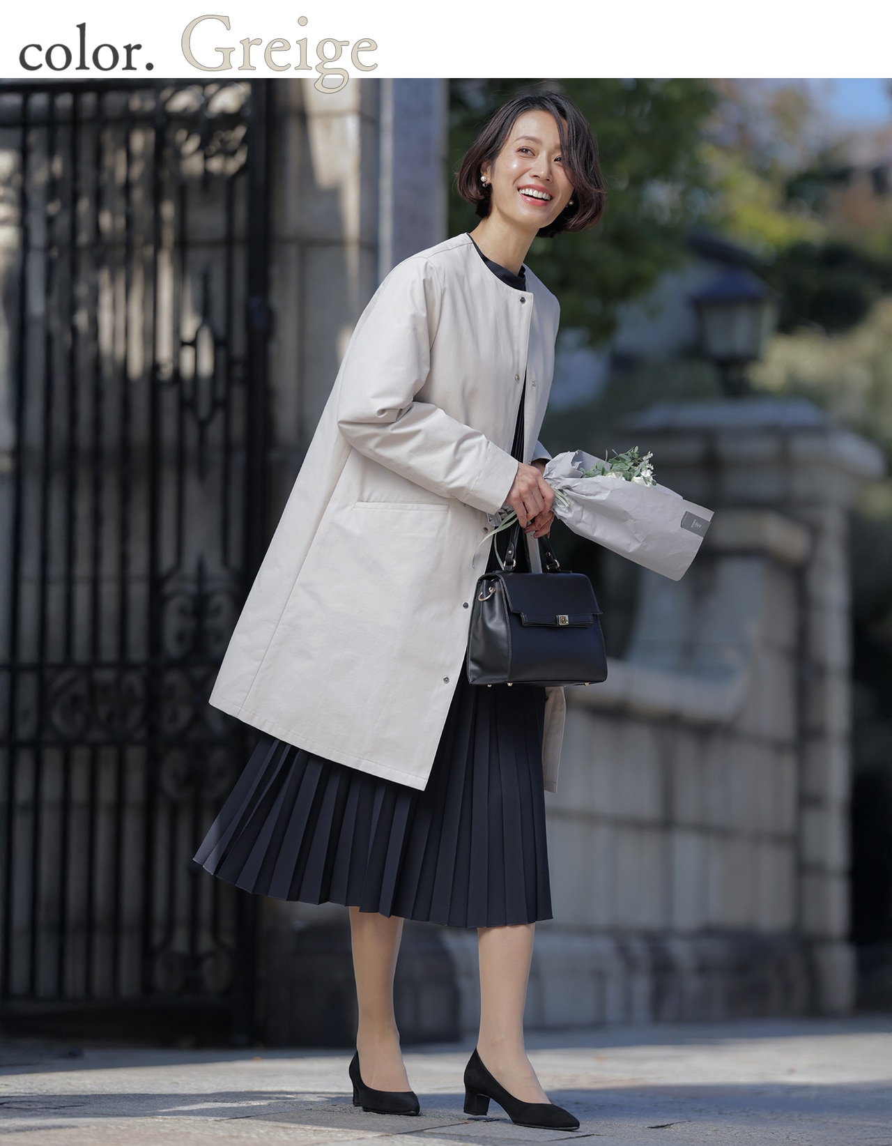 ネイビーのワンピースにグレージュのコートを羽織った、華やかさと気品を両立するスタイル。ネイビーワンピースのきちんと感を、グレージュコートの柔らかな風合いが程よく中和し、抜け感のあるエレガントスタイルに昇華。軽くて暖かな着心地のよさは、緊張しがちなハレの日もリラックスして過ごせる一着に。マルチコートなら行事が続く春の季節も、シーンと気温に合わせた品格ある装いが叶います。
