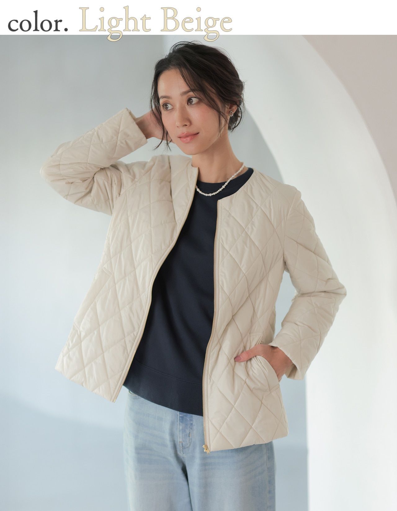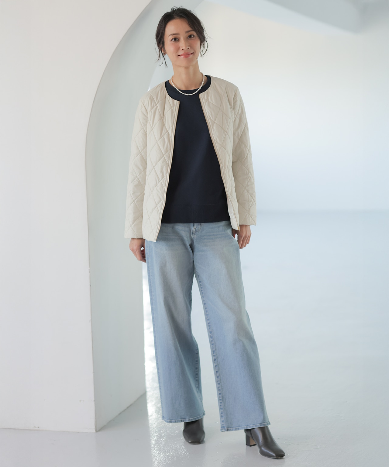 まだ肌寒い春先には、単品使いのできるキルトライナーが頼りに。ネイビーのスウェットとデニムで繋いだブルートーンに、ライトベージュを羽織って春らしい明るさをオン。気負わないのにどこかエレガントな、大人の余裕を感じさせるデイリースタイルの完成。軽やかな着心地で、春の街歩きも颯爽と楽しめる。