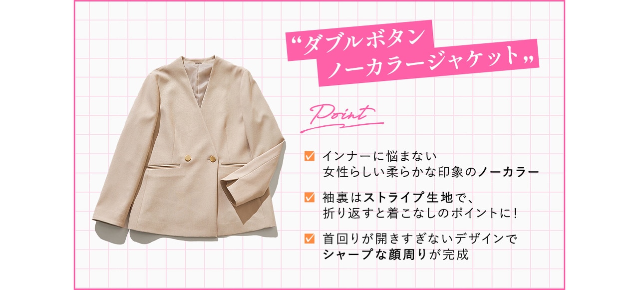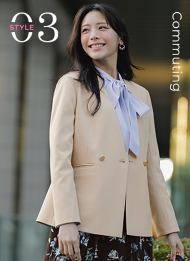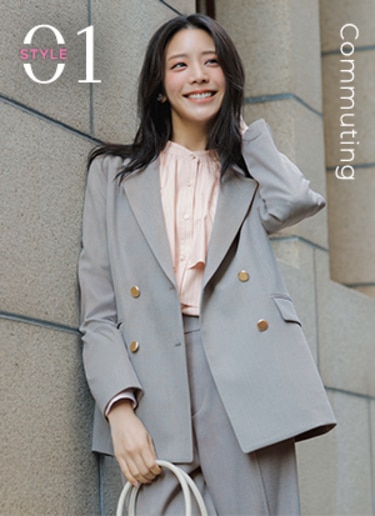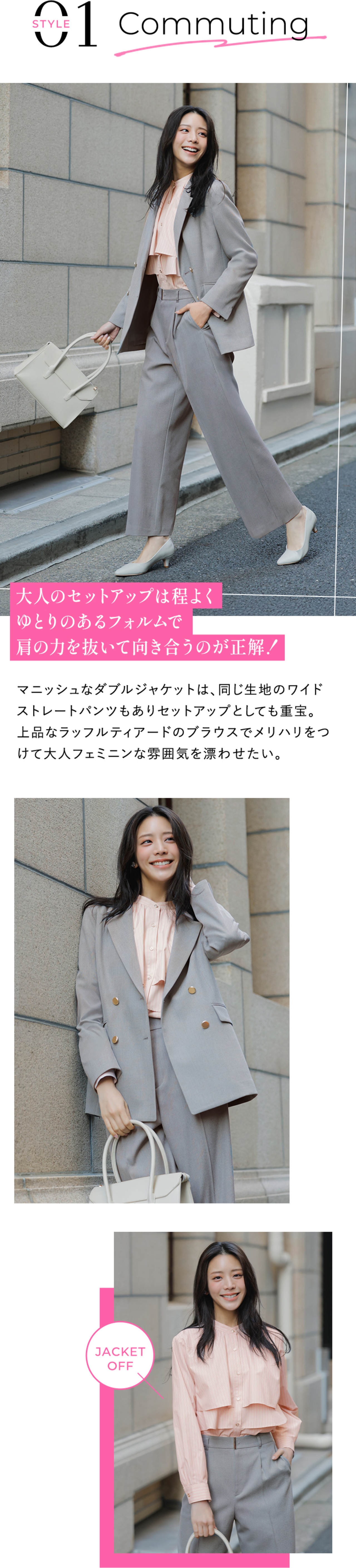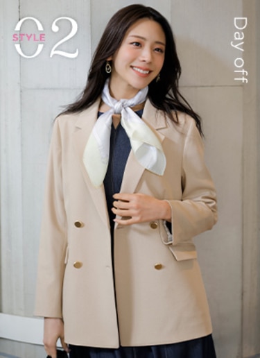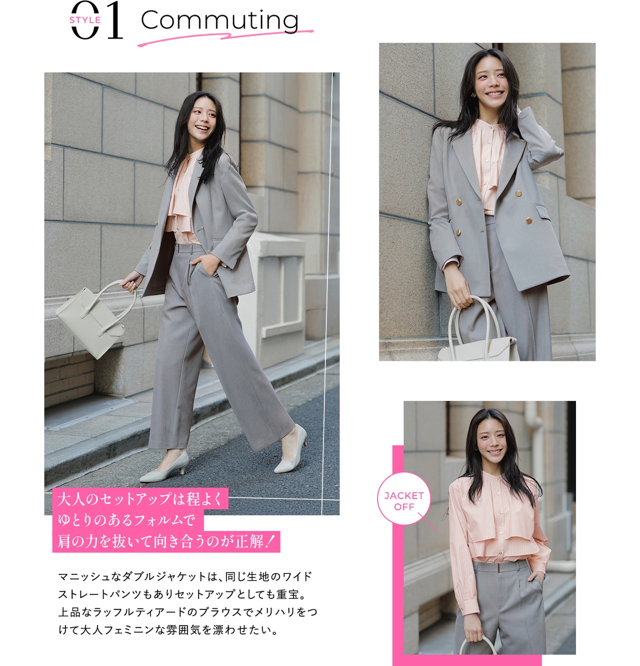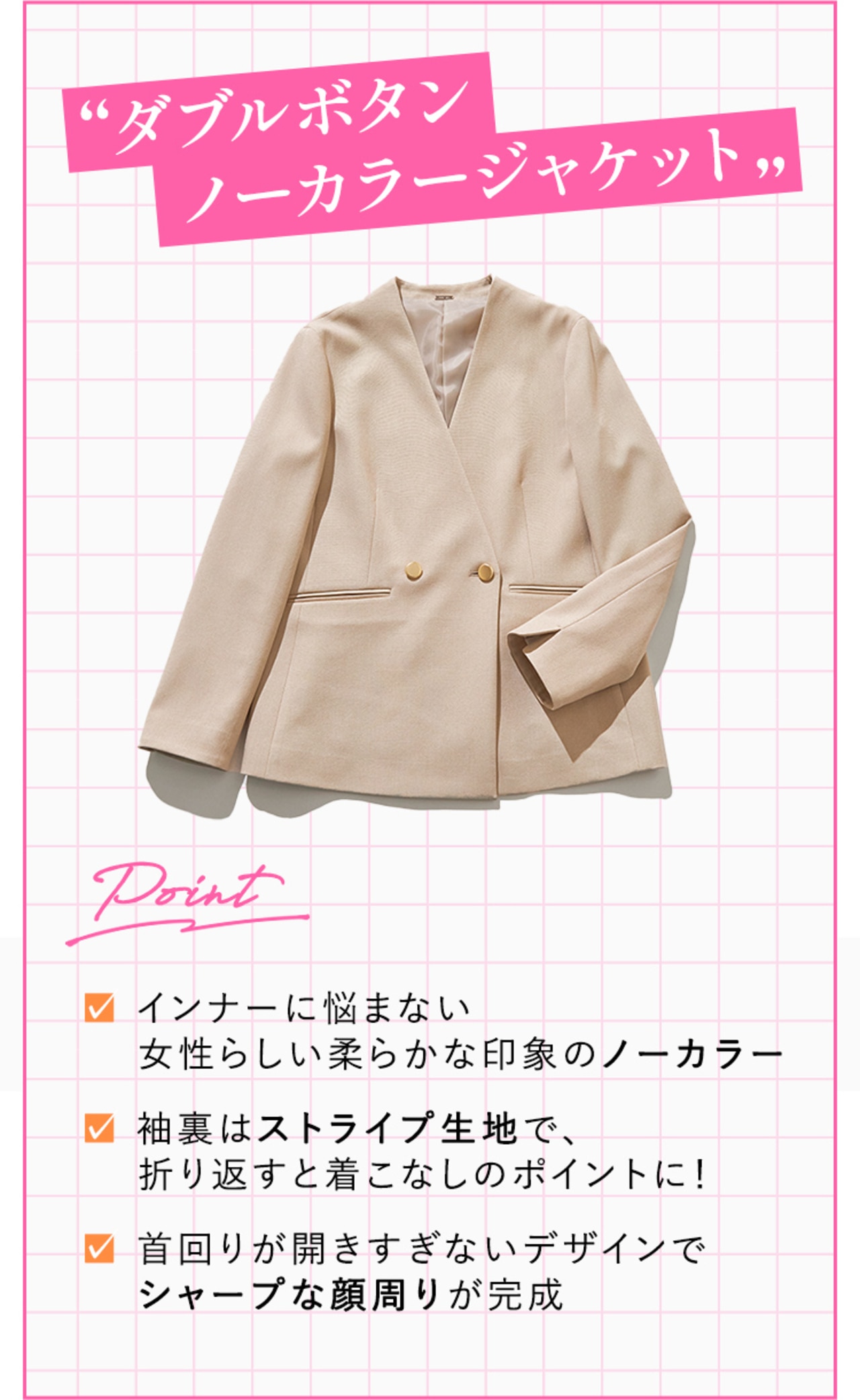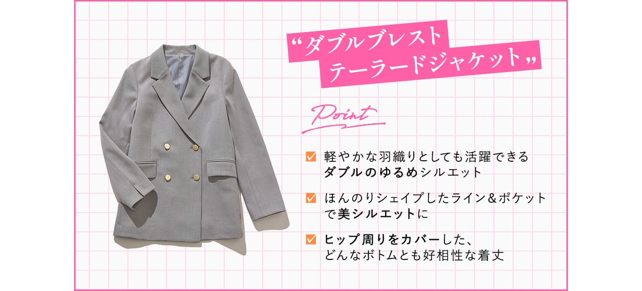 春の軽アウター感覚でまとえる程よくゆとりのあるフォルムやほんのりマニッシュなダブルボタン使いで更新して、通勤はもちろん休日のカジュアルスタイルを切れ味よく着こなしたい。