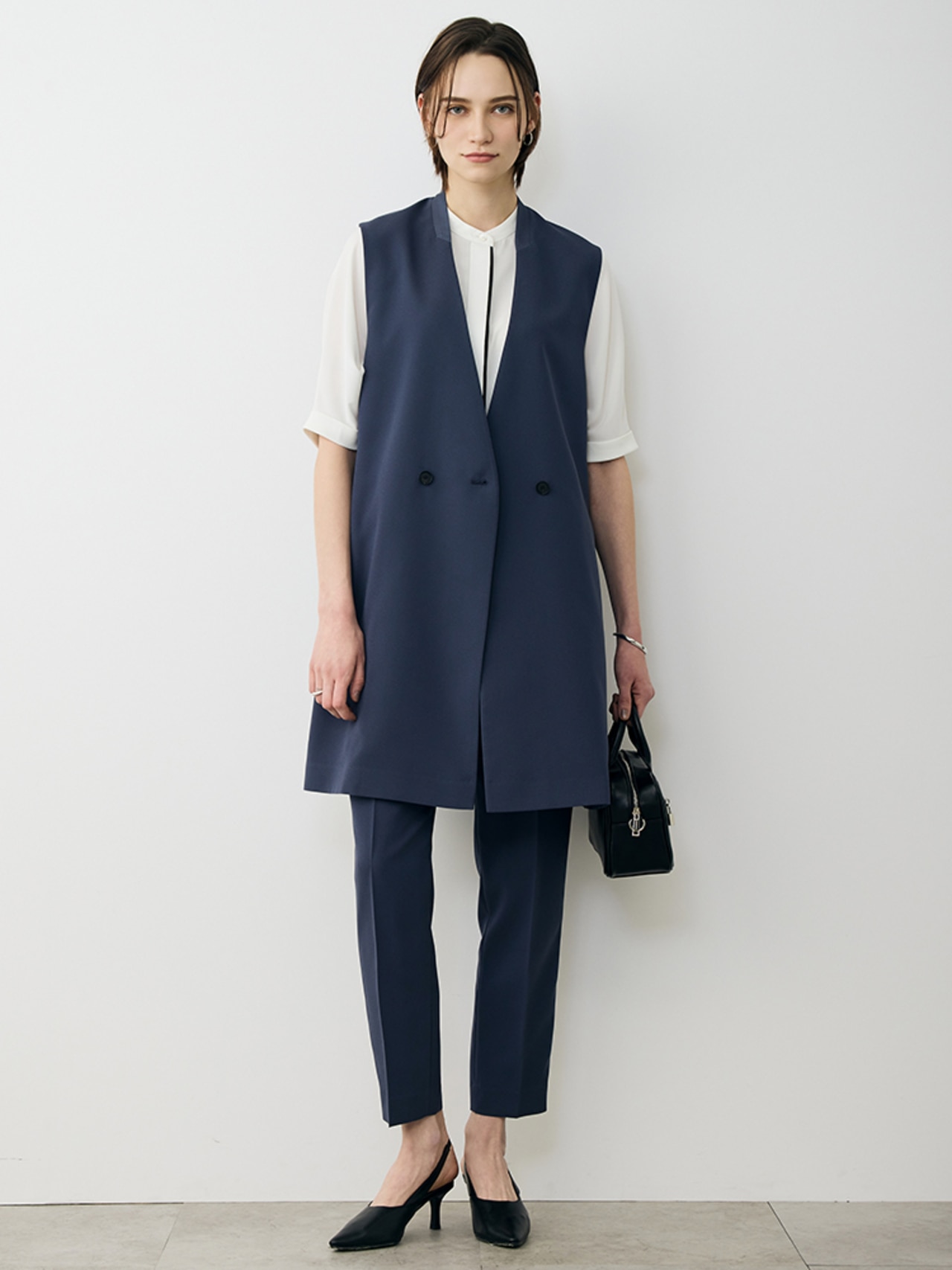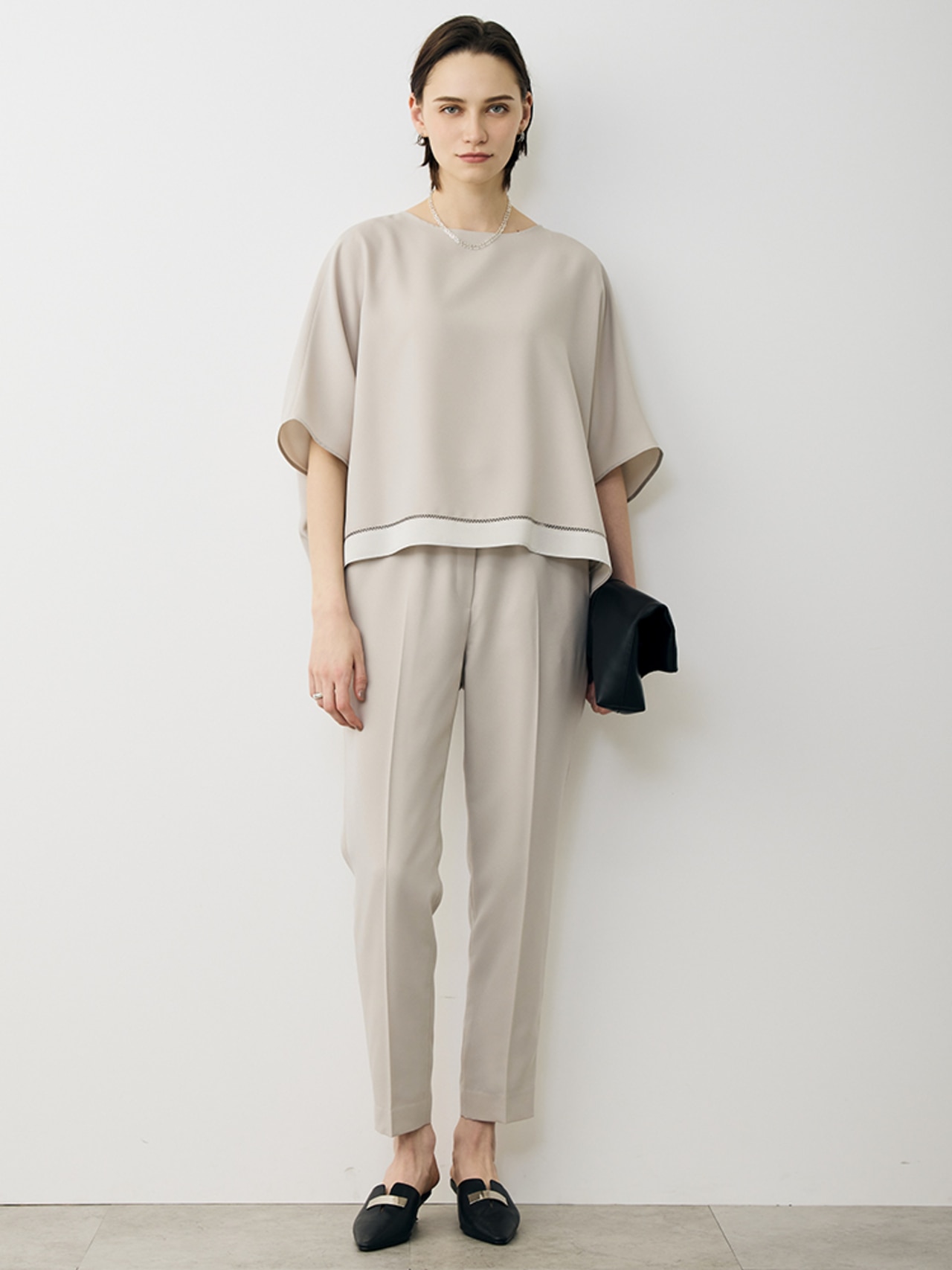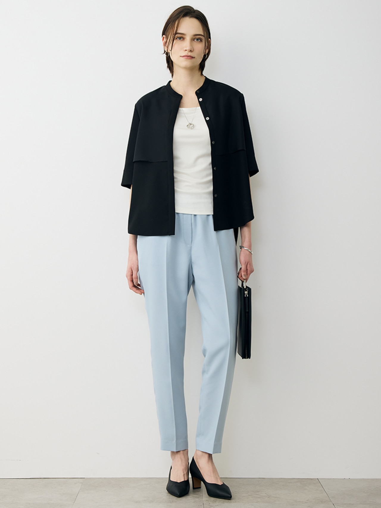 バンドカラーで程よくゆったりとしたサイズ感のブラウスは前を開けて羽織りとしても重宝する万能な1枚。同素材の爽やかなサックスグレーのスティックパンツはWEB限定カラー。