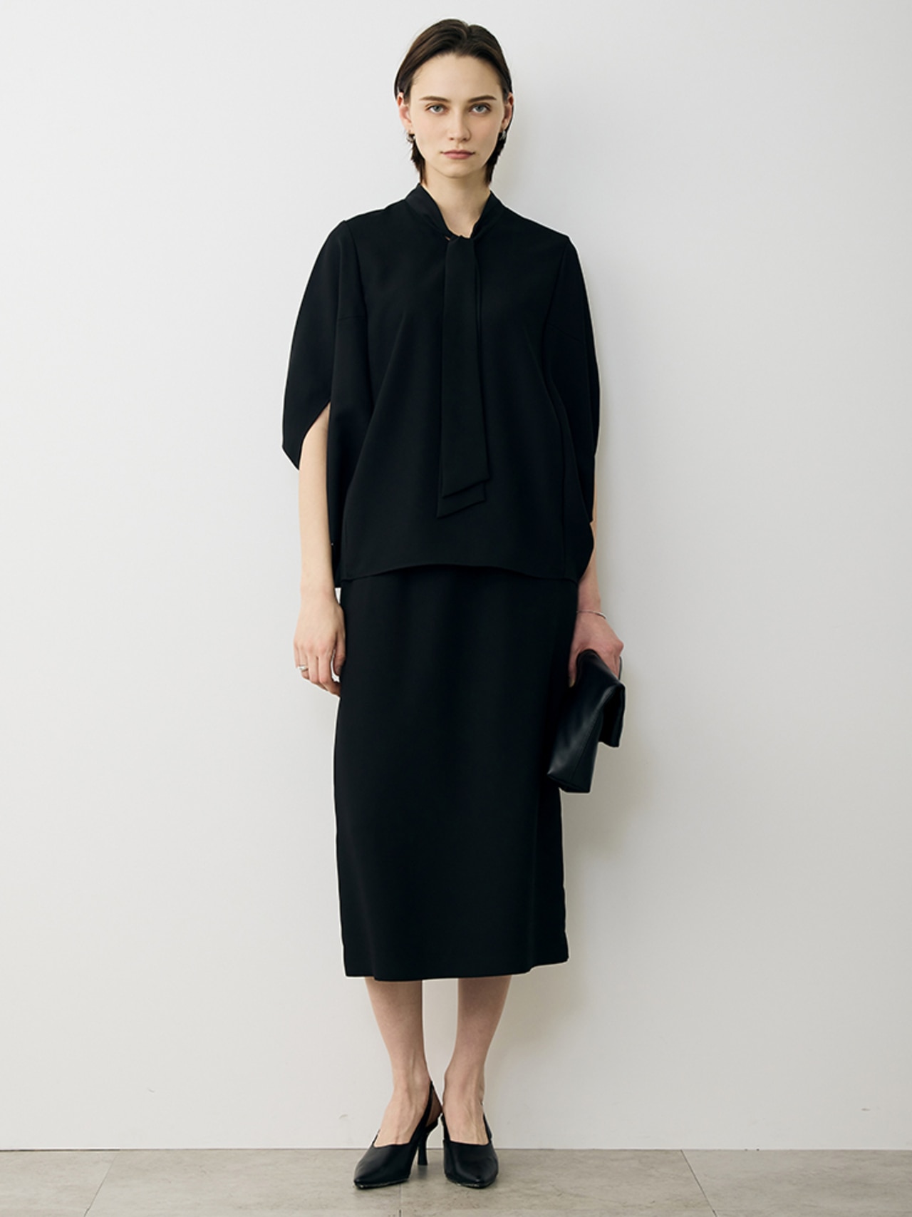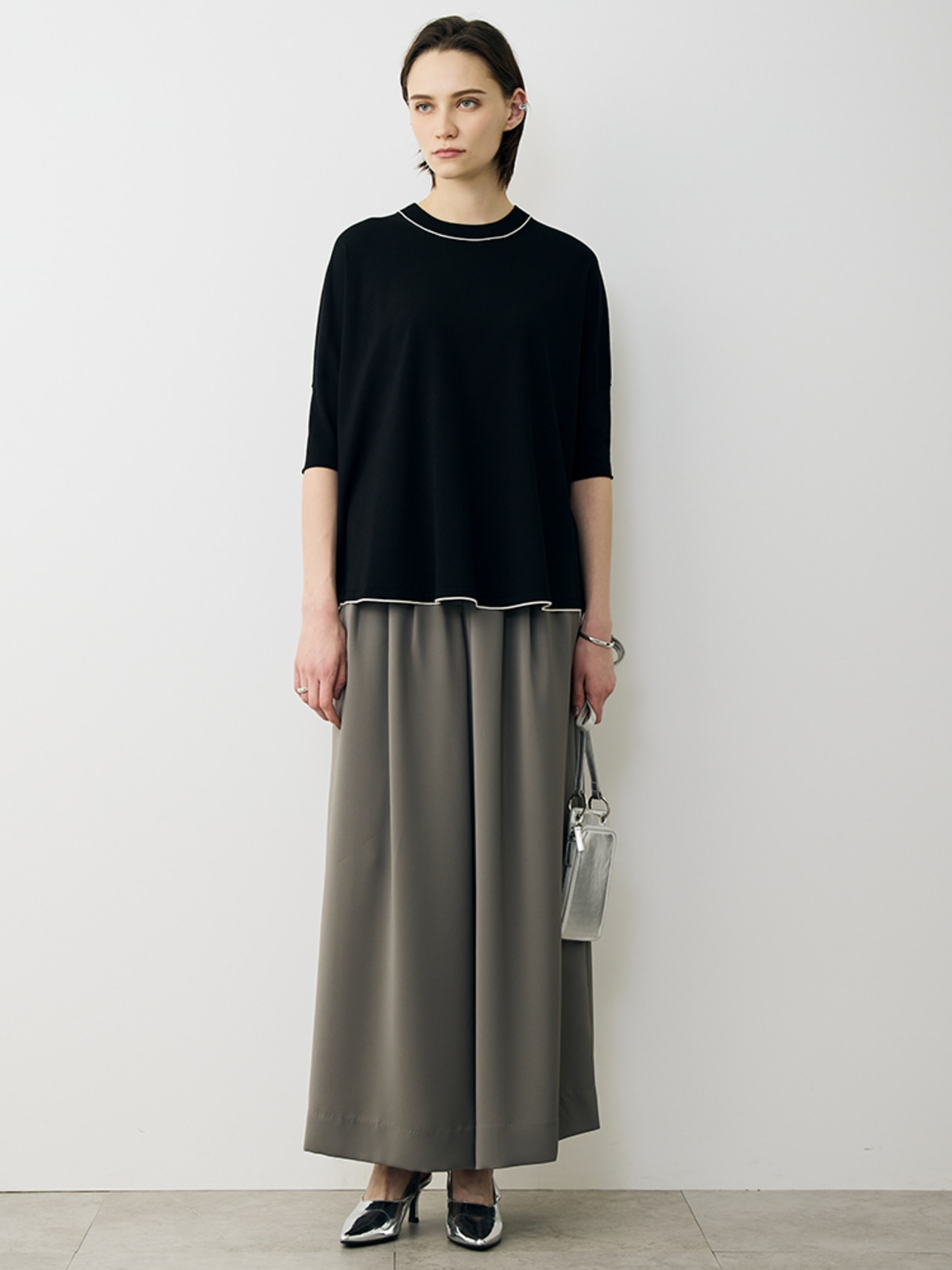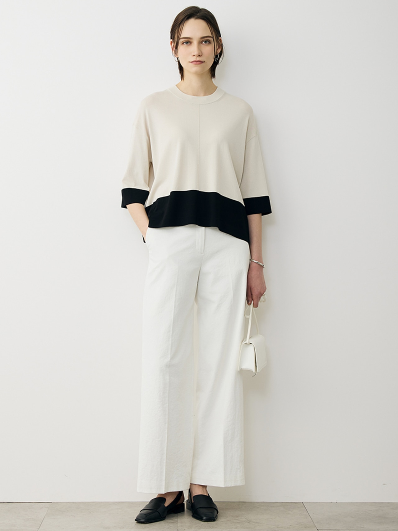 環境に配慮したリサイクルポリエステルを使用し、体のラインを拾いにくい程よい肉感と、適度な落ち感、ハリ感を併せ持った素材で、なめらかな肌触りとストレスフリーな着心地が魅力です。