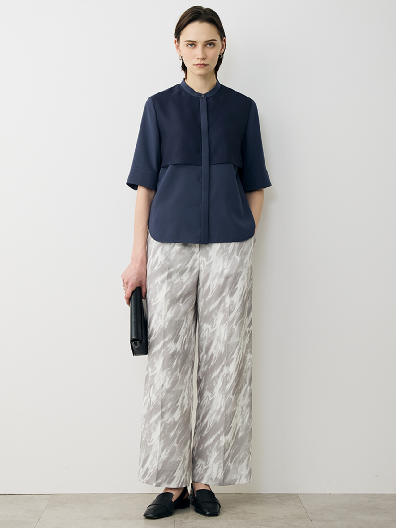 シアー素材を使用したフライヨークや前後差のあるヘムラインがアクセントのブラウスは、マーブルプリントのパンツとの組み合わせが旬な着こなし。柄パンツを投入するだけで、いつものセットアップに新鮮さをプラス。