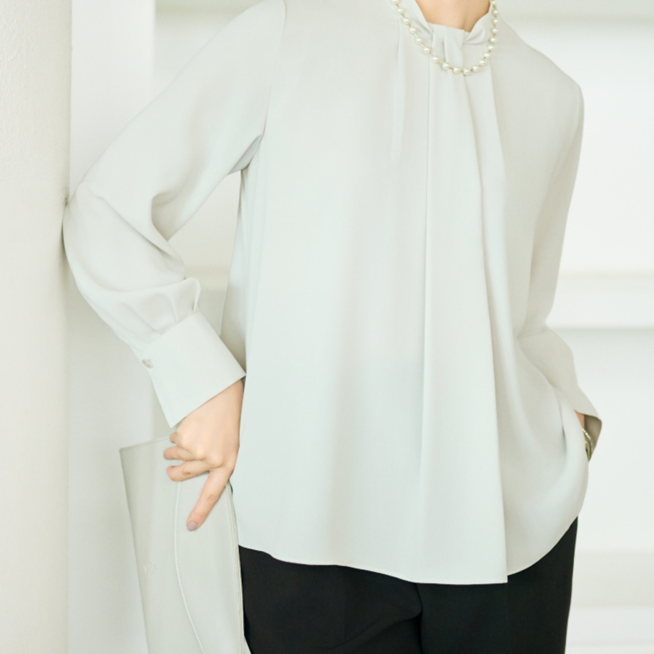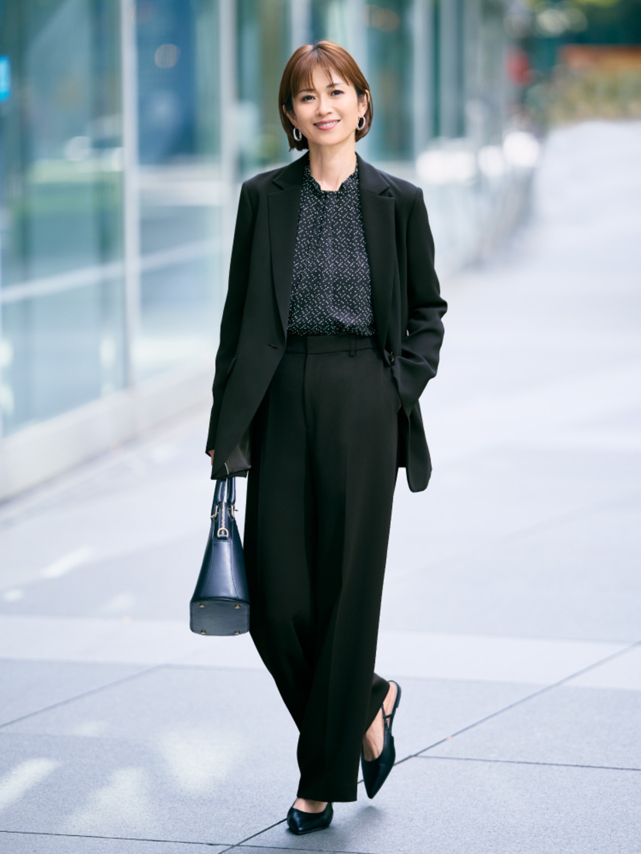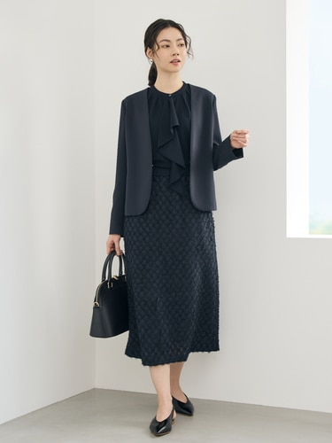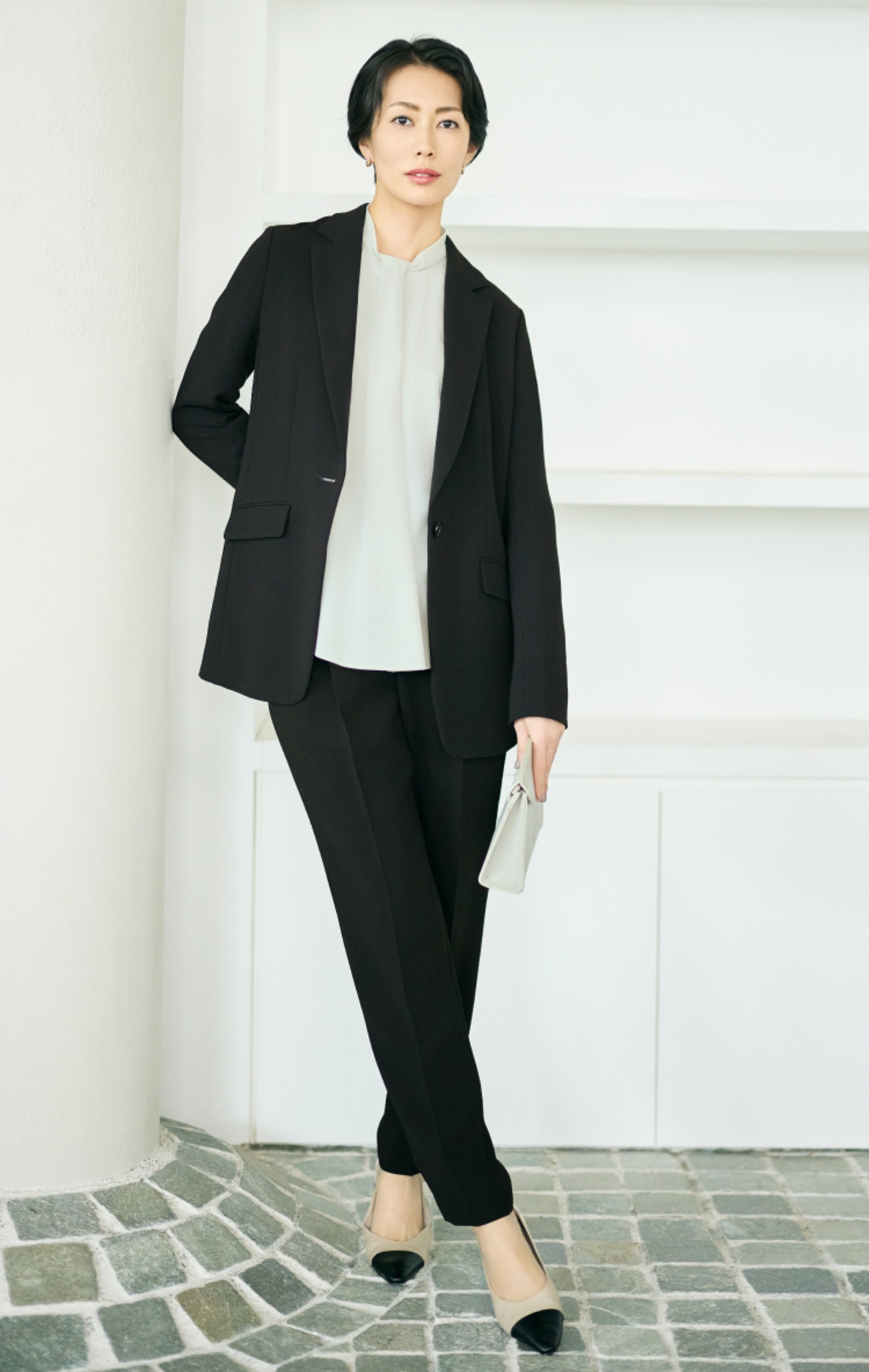 計算されたシルエットと上質感が際立つ、王道セットアップ。顔まわりを明るく映す微光沢のブラウスをインナーに。端正さと華やかさを纏う、上質な通勤コーディネートです。