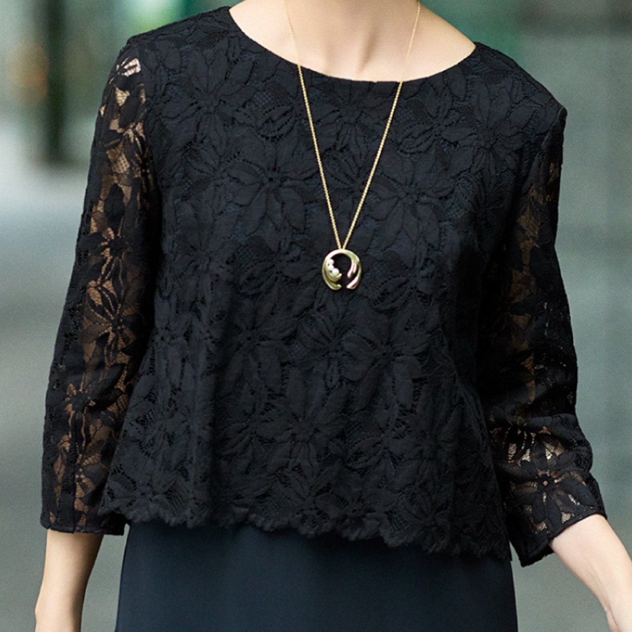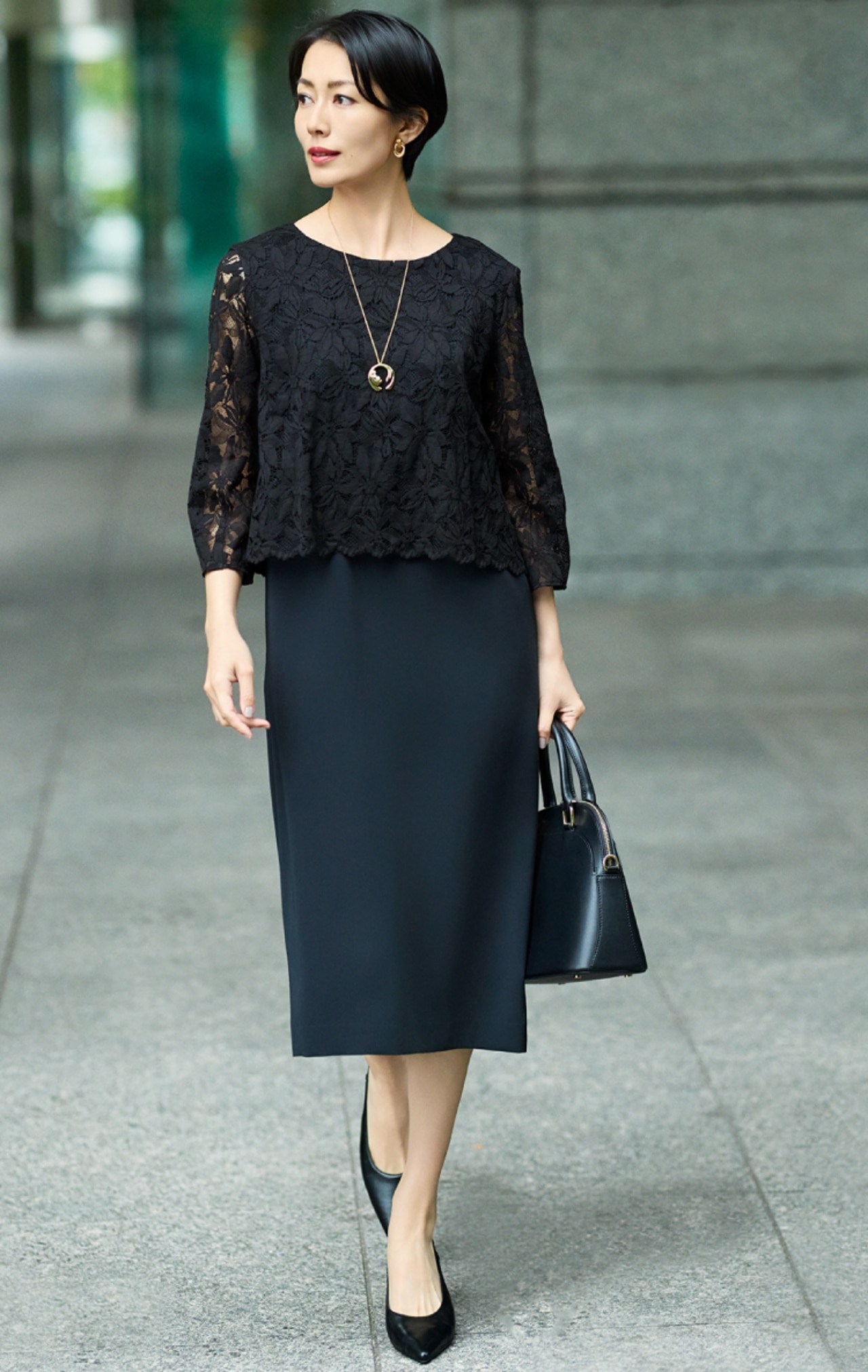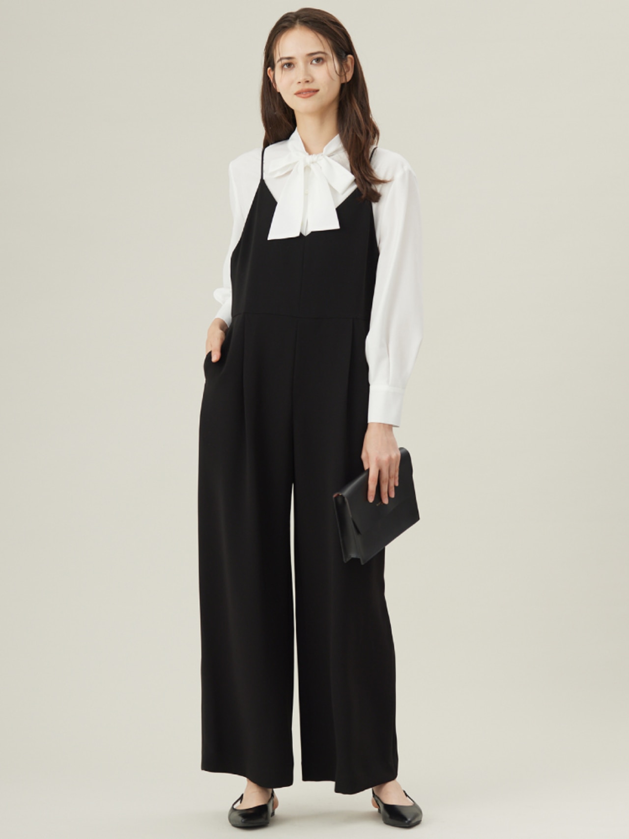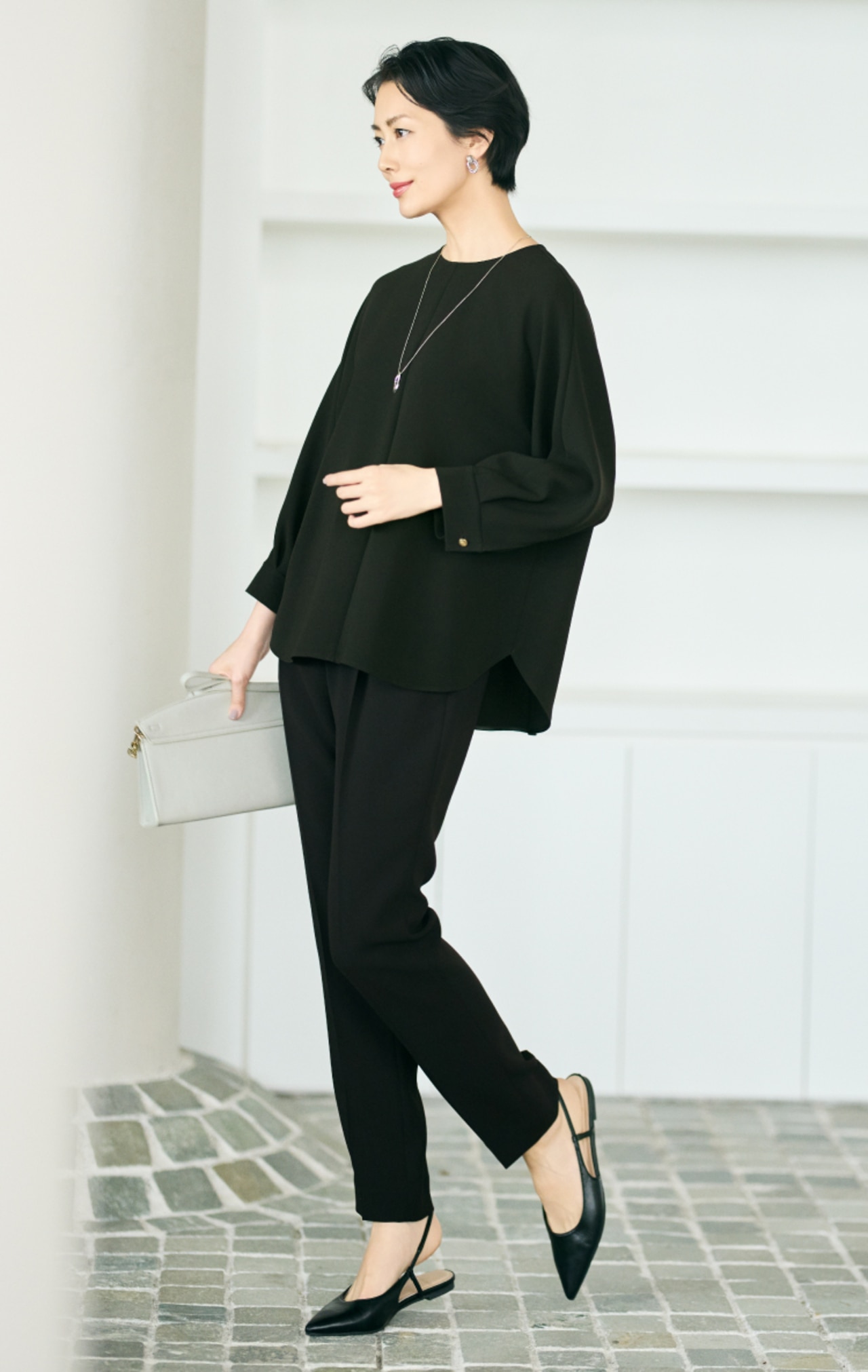 計算されたシルエットと上質感が際立つ、王道セットアップ。顔まわりを明るく映す微光沢のブラウスをインナーに。端正さと華やかさを纏う、上質な通勤コーディネートです。