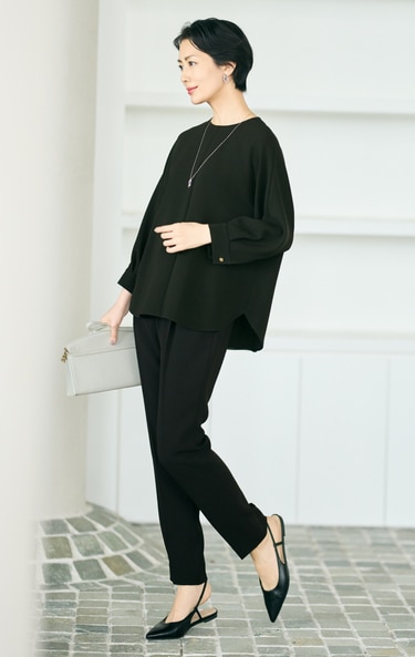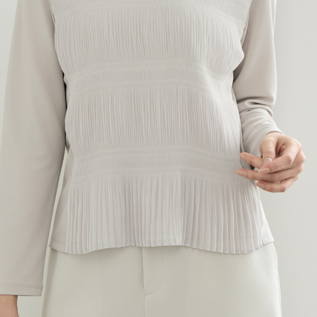 優しいベージュが印象を和らげる、トリアセダブルクロスのセットアップ。動きのあるプリーツブラウスを合わせれば、女性らしい軽やかさを叶えます。トップスは、後ろ身頃と袖はジャージ―素材になっており、リラクシーな着心地に。