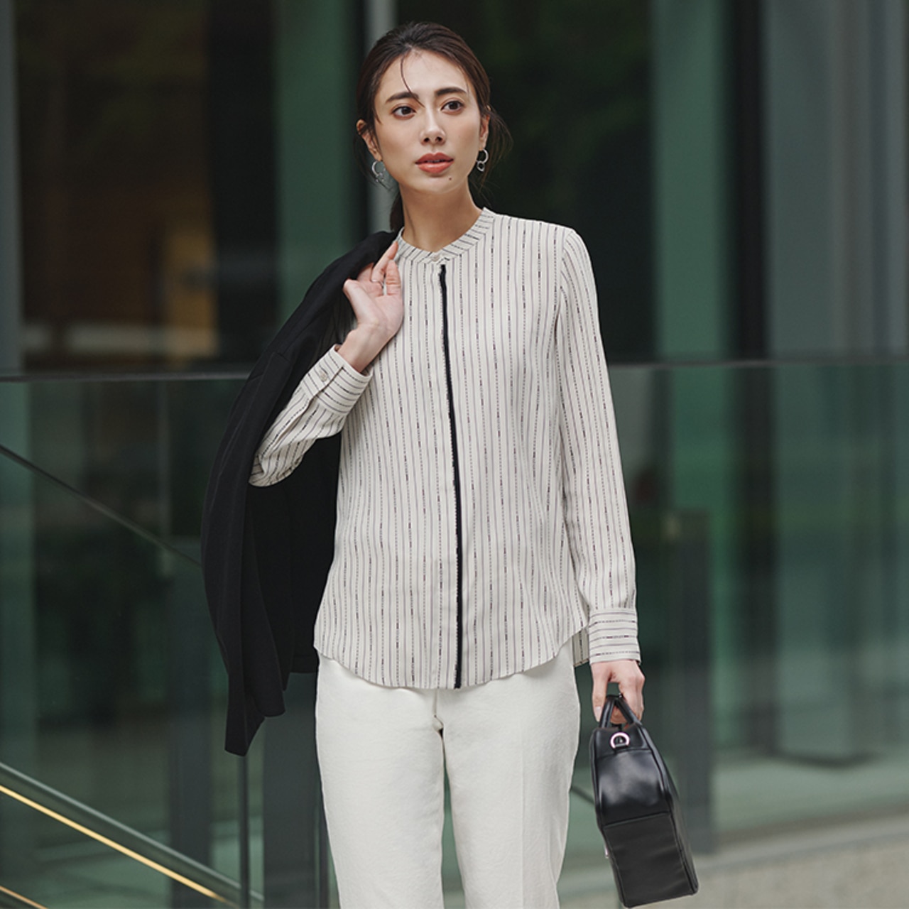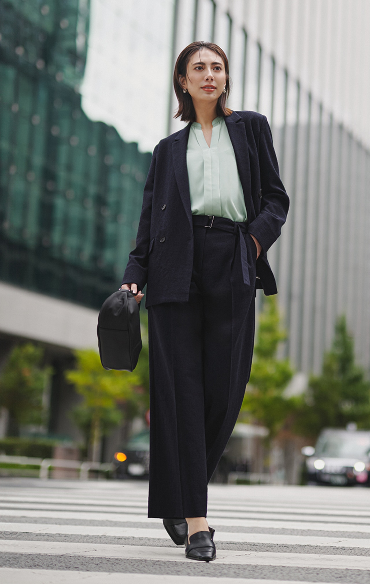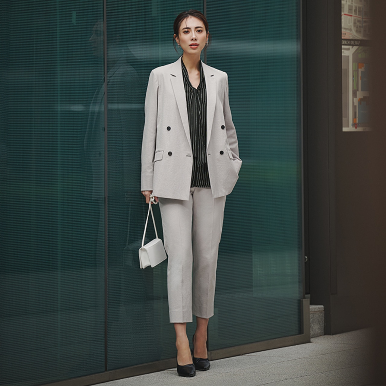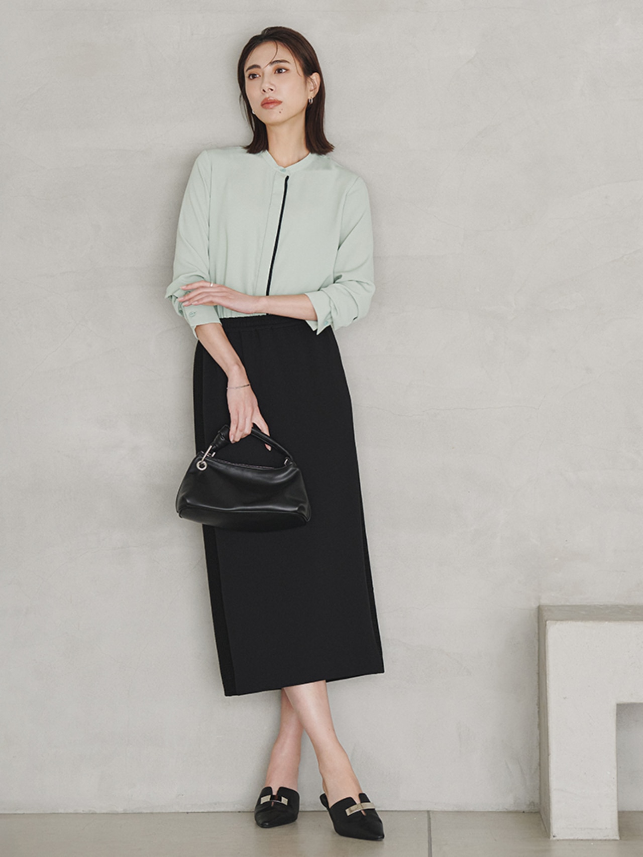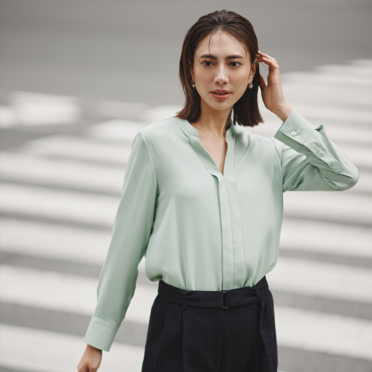 暗くなりがちなセットアップコーデも、スモークグリーンのキーネックブラウスで爽やかに決まる。