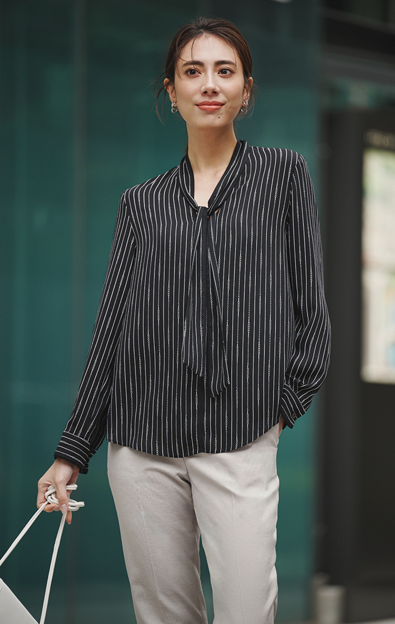 女性らしい上品さをプラスする、きれいめボウタイブラウス。顔周りを優美に印象付けるデザインは、ジャケットのインナーとしてもスタイリングのポイントに。