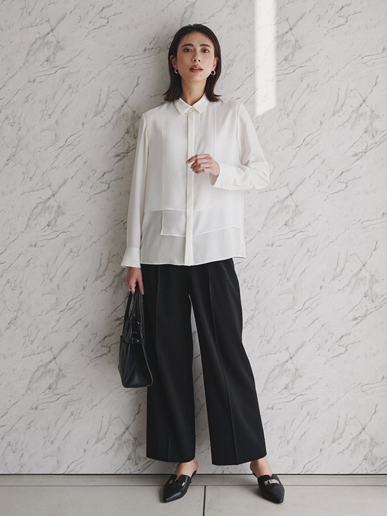 薄手の別布ジョーゼットを重ね、軽やかに仕上げたデザイン性の高いシャツブラウス。シャツカラーデザインがクリーンな印象。