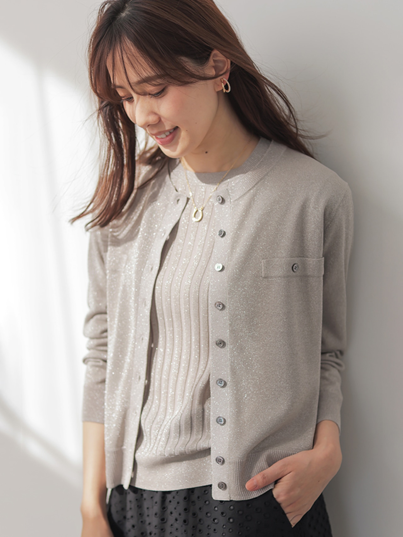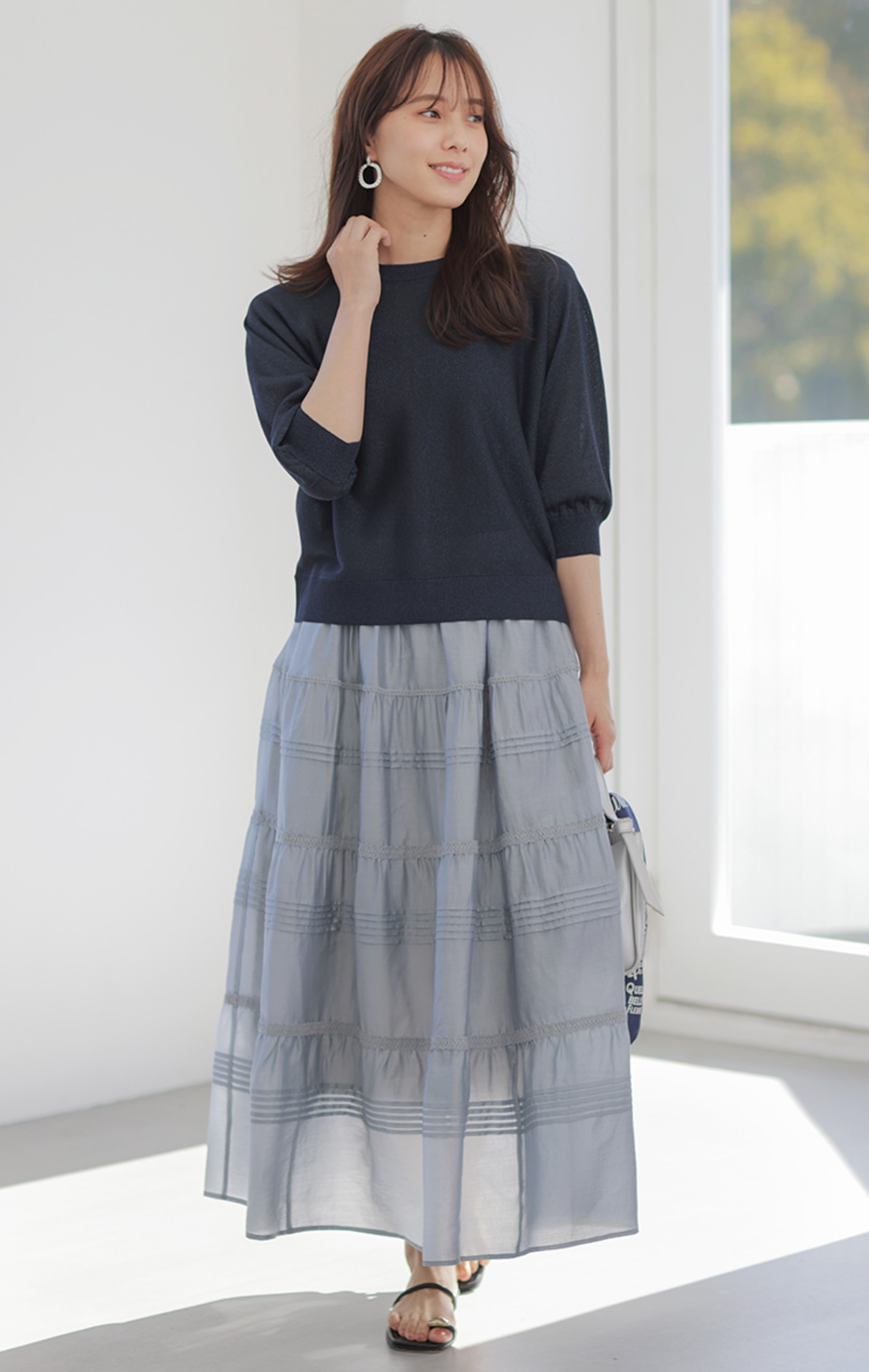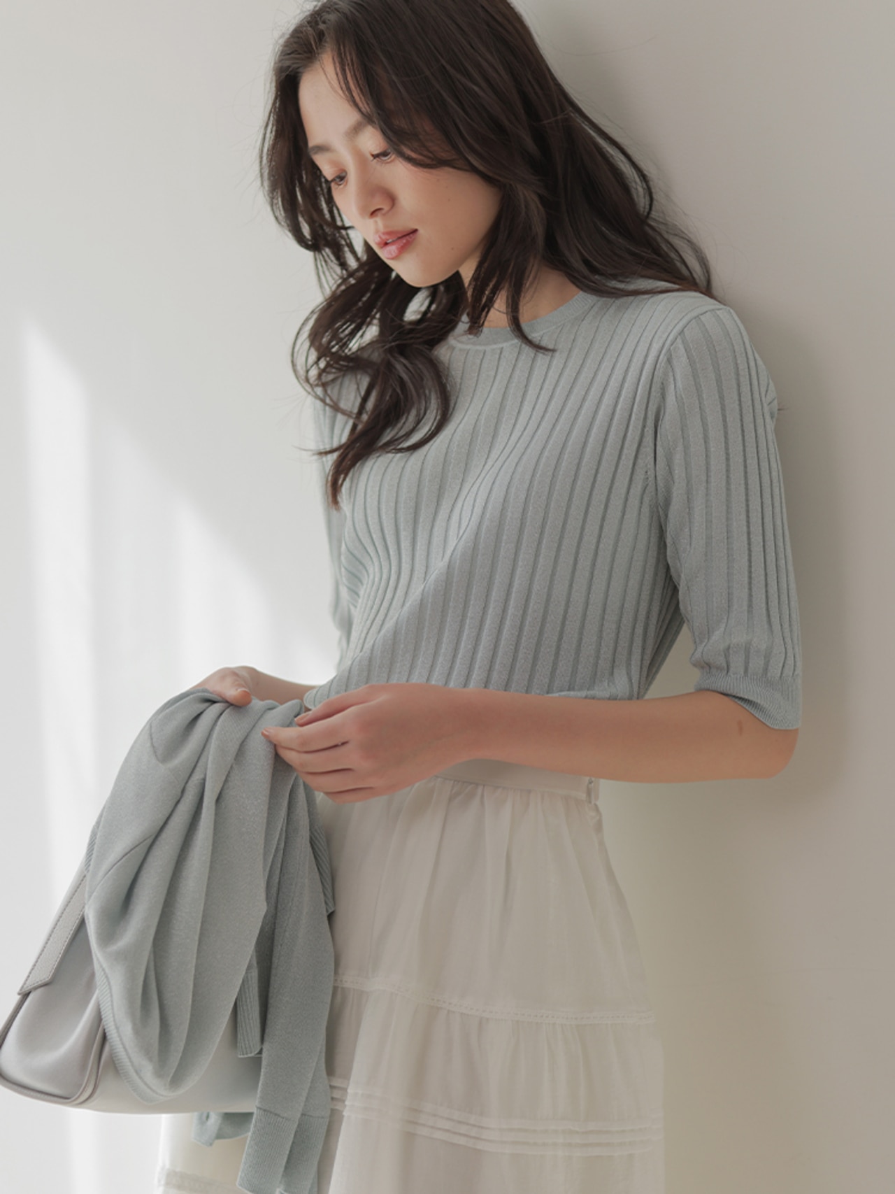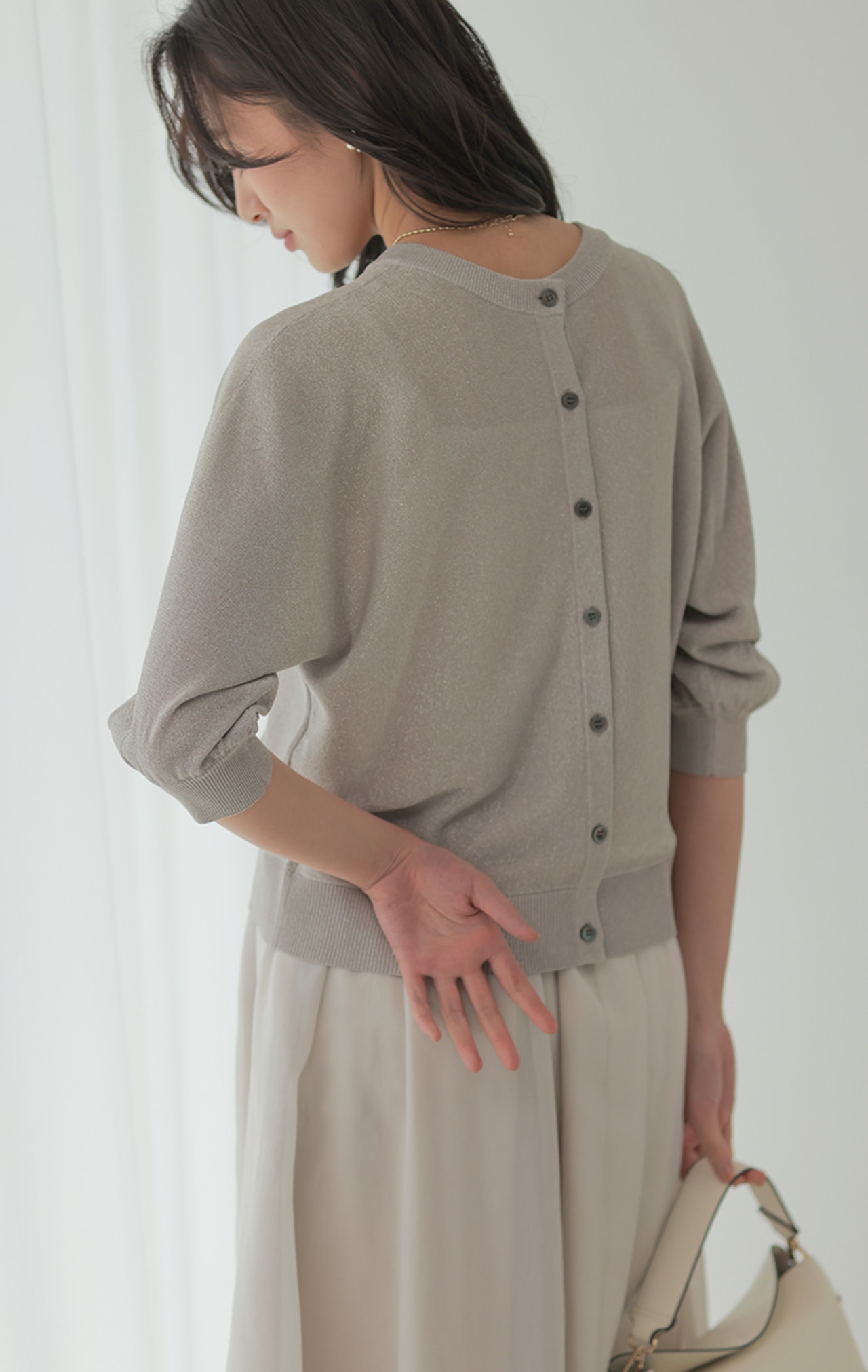 こなれ見えするワントーンコーデは、ニュアンスの違うアイボリー×グレーで洒落感UP。小物は白でクリーンにまとめて。