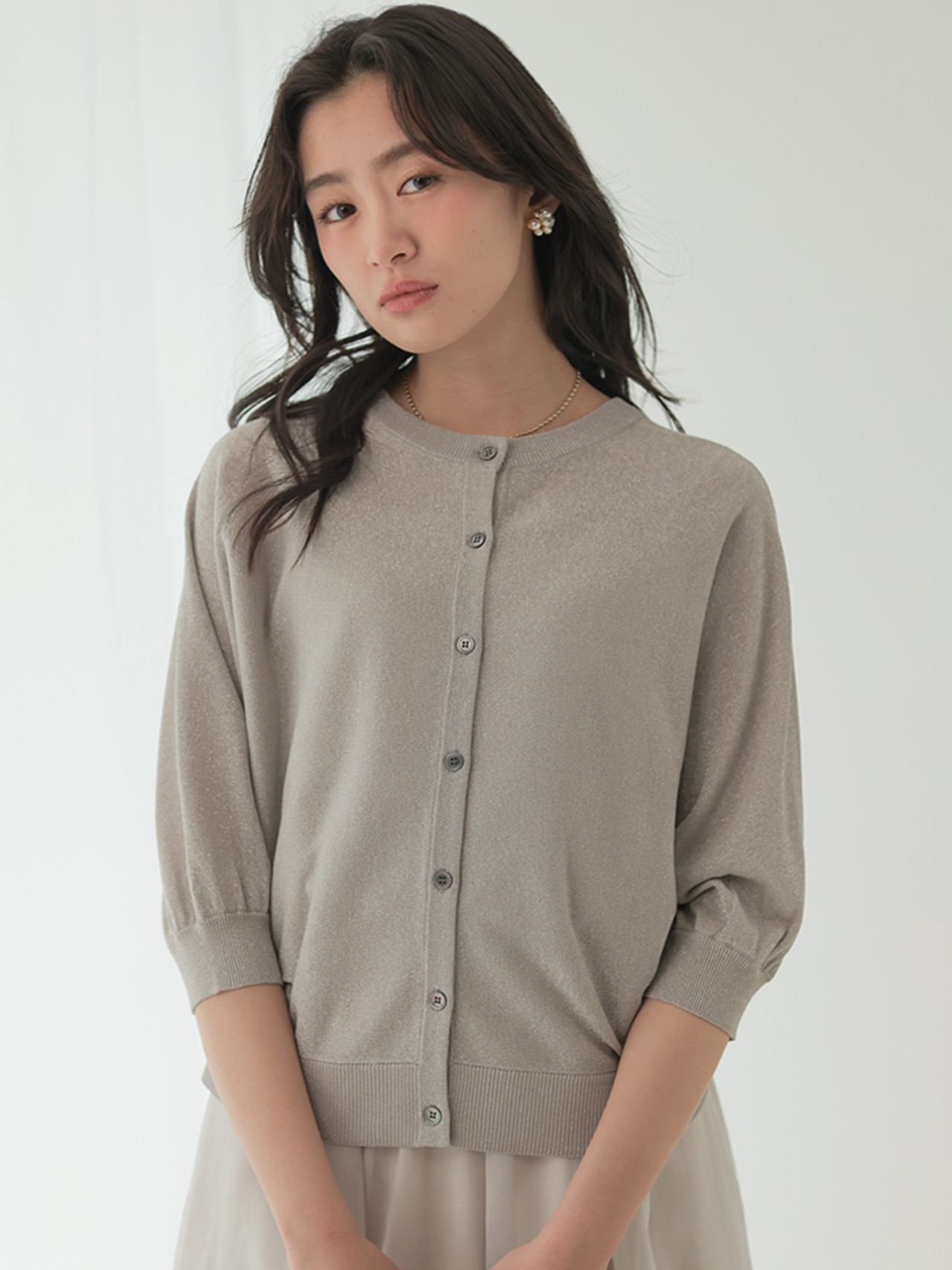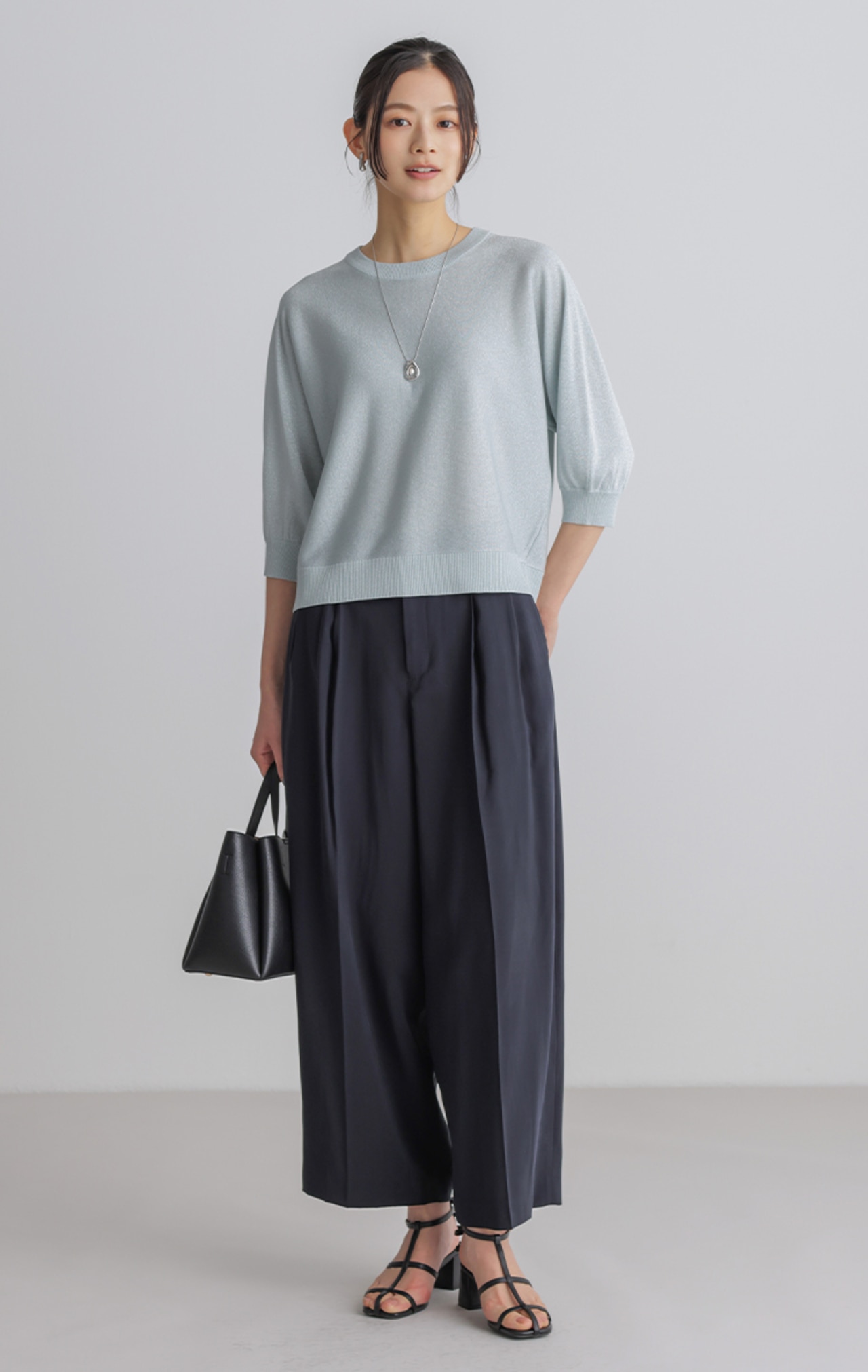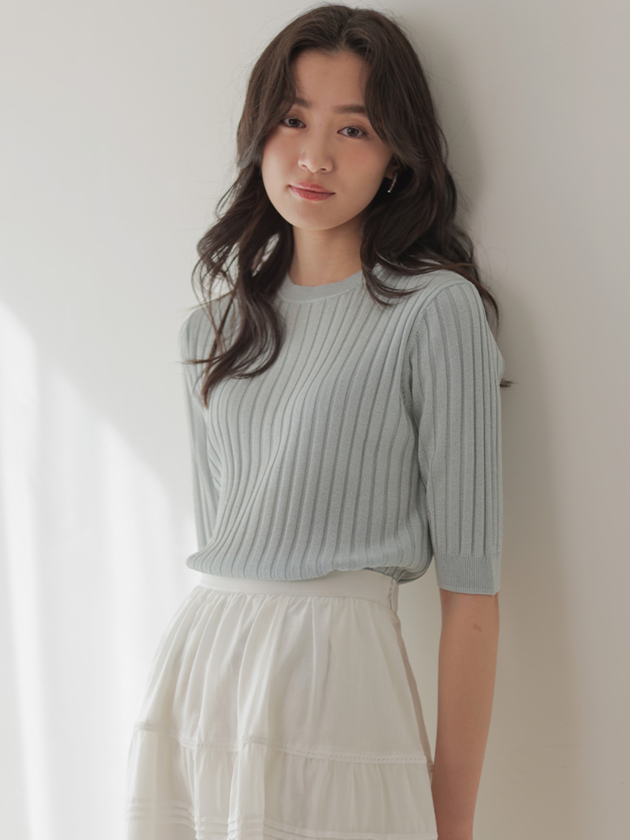 こなれ見えするワントーンコーデは、ニュアンスの違うアイボリー×グレーで洒落感UP。小物は白でクリーンにまとめて。