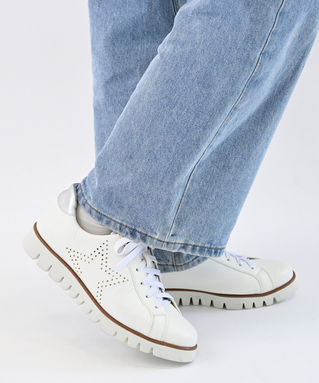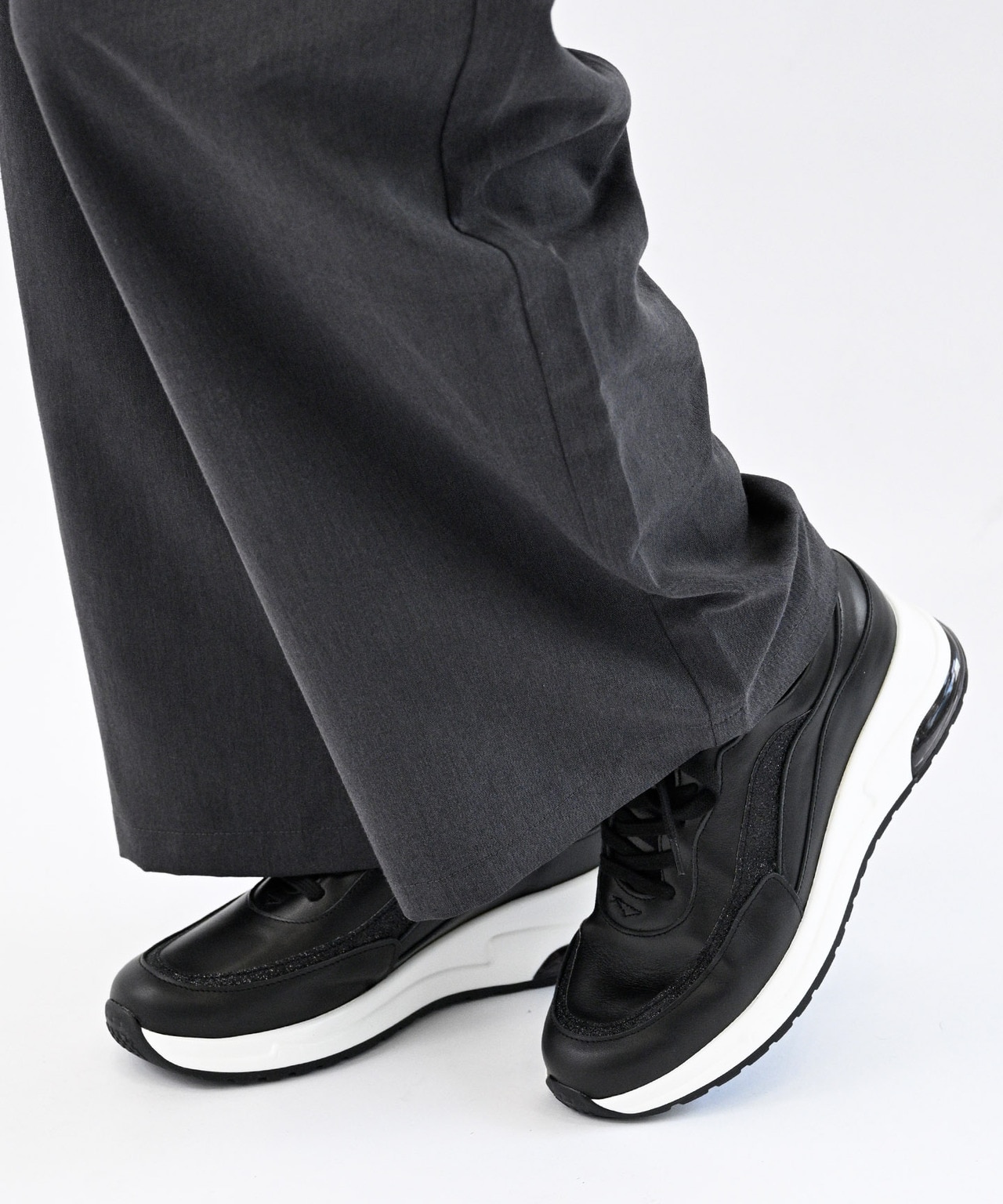 異素材コンビのアッパーとメタルパーツが、足元にほどよいアクセントを添えてくれます。