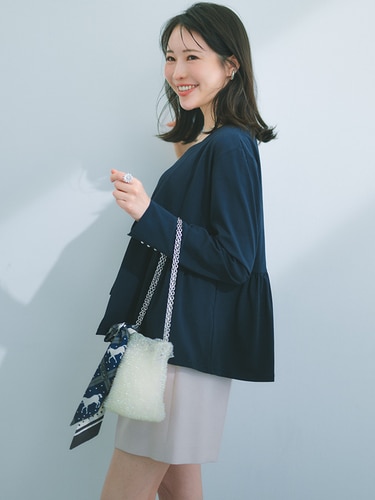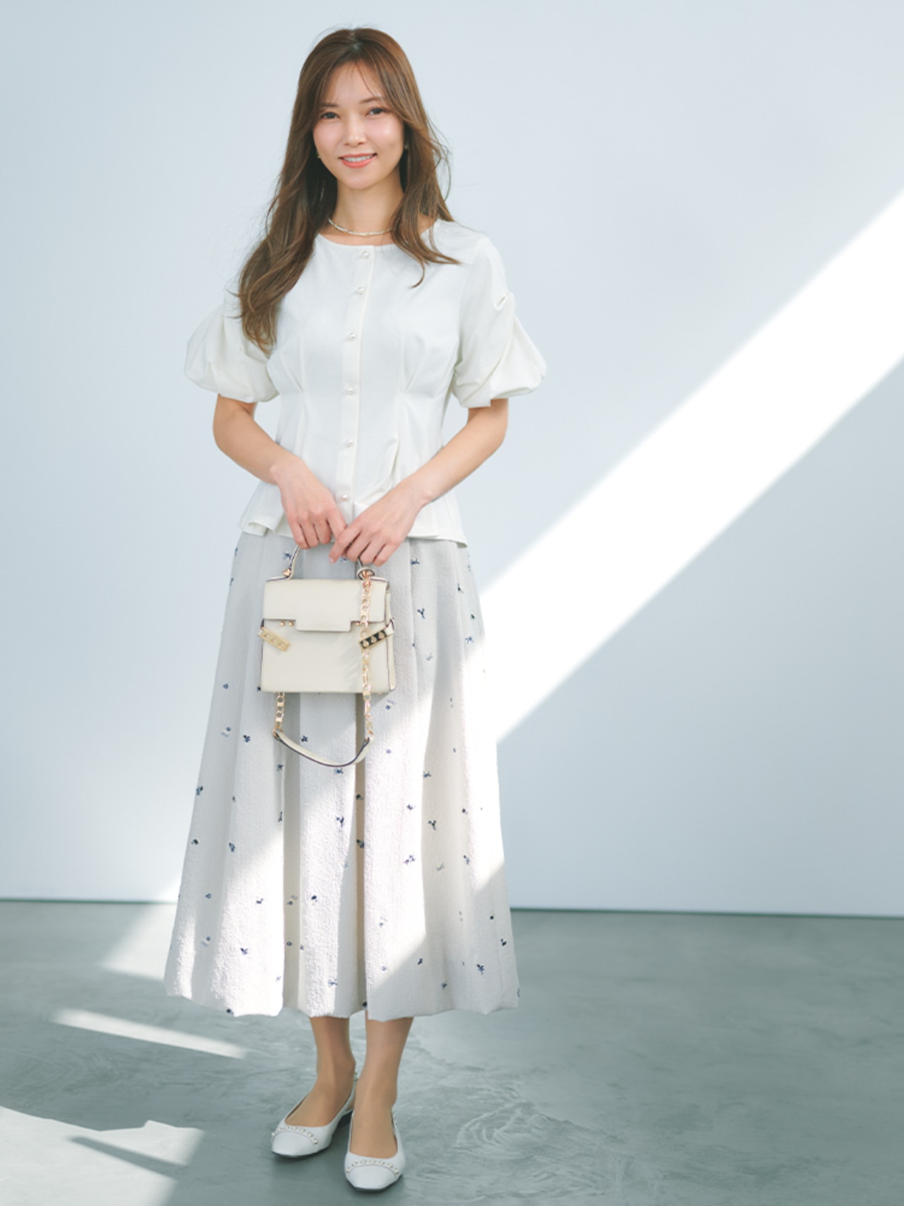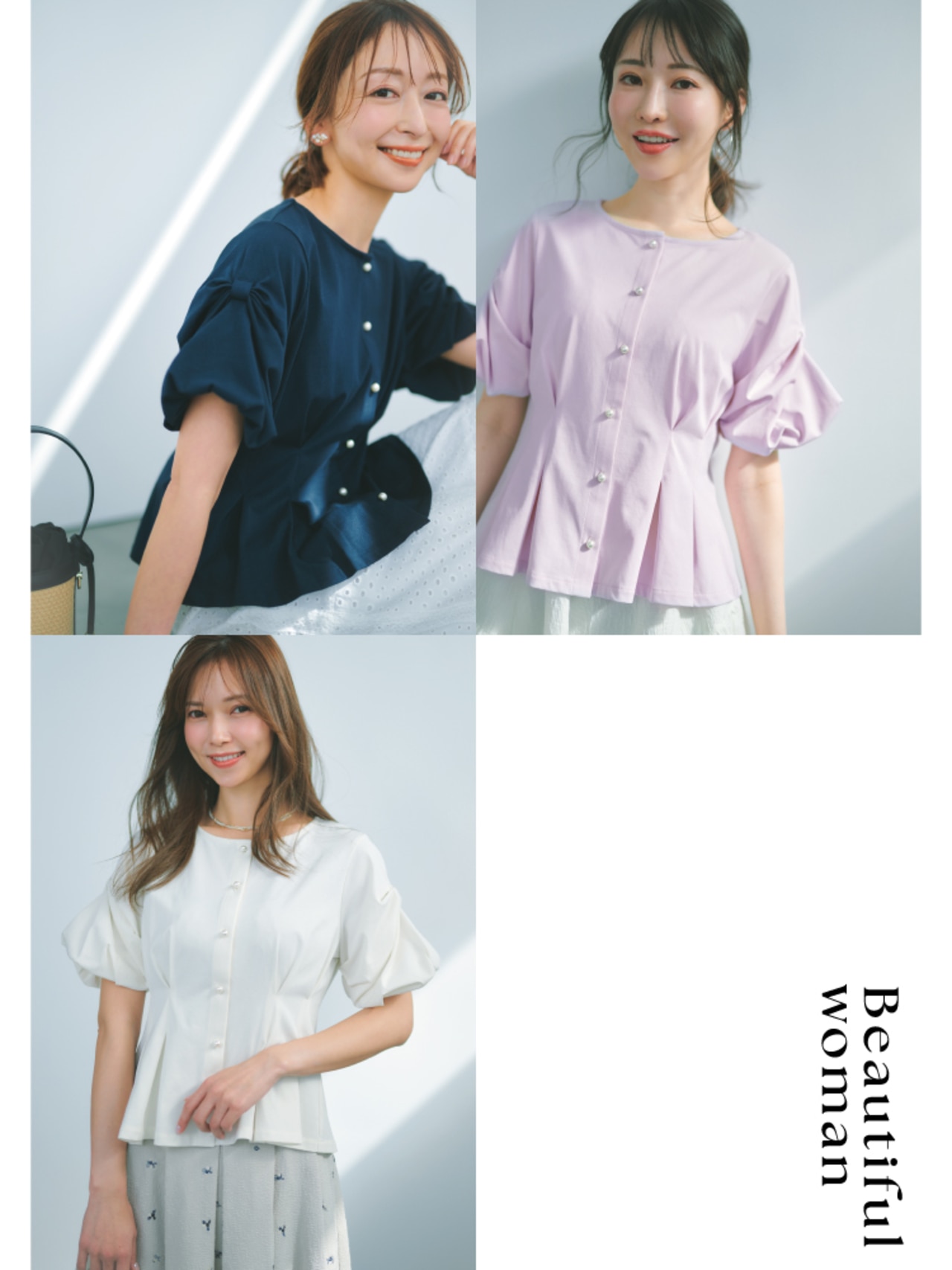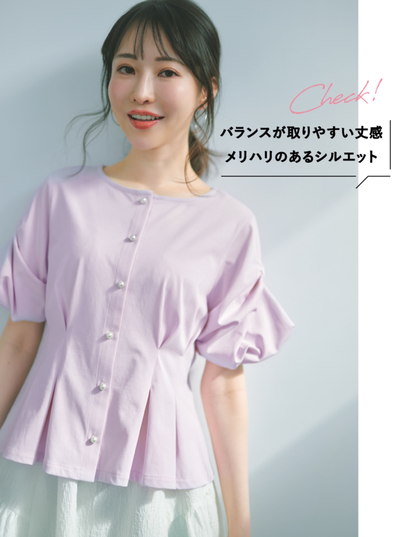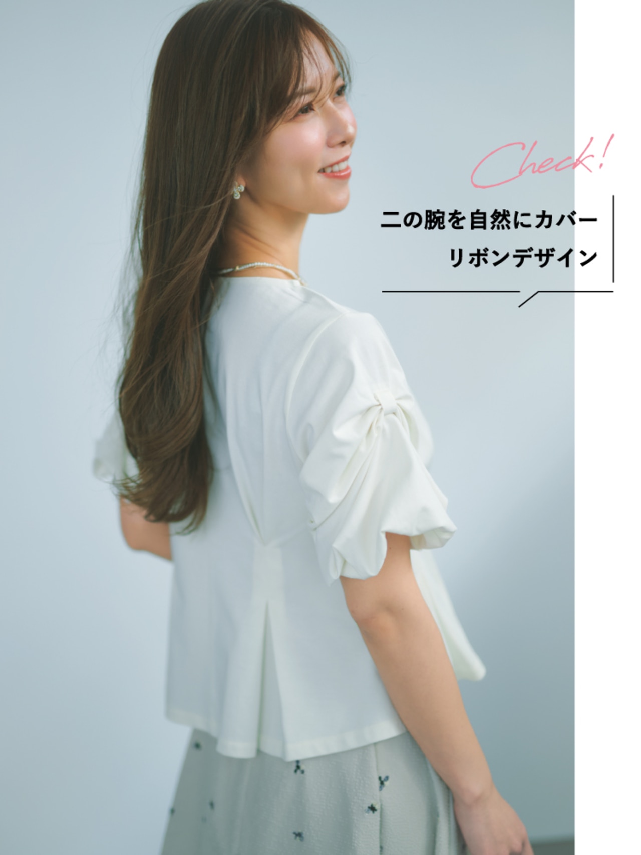 スカートでもパンツでも、ショート丈でもロングでも、着るだけで自然とスタイルが整って見えるように、丈感を何度も調整しています。特にウエスト周りのラインが綺麗で、着た瞬間にメリハリのあるシルエットになるのがすごく嬉しいです。さらにパールのデザインがあることで、一枚でちゃんと華やかさも出るので、コーディネートがすごく楽になります。袖のリボンもポイントで、主張しすぎないさりげないデザインなので、甘くなりすぎず、でもちゃんと女性らしさが出るんです。顔まわりではなく、あえて腕にボリュームを持たせているので、バランスよく華やかに見えるのもお気に入りです。何に合わせても決まるし、ちゃんと可愛い!そんな頼れる一枚だと思います。