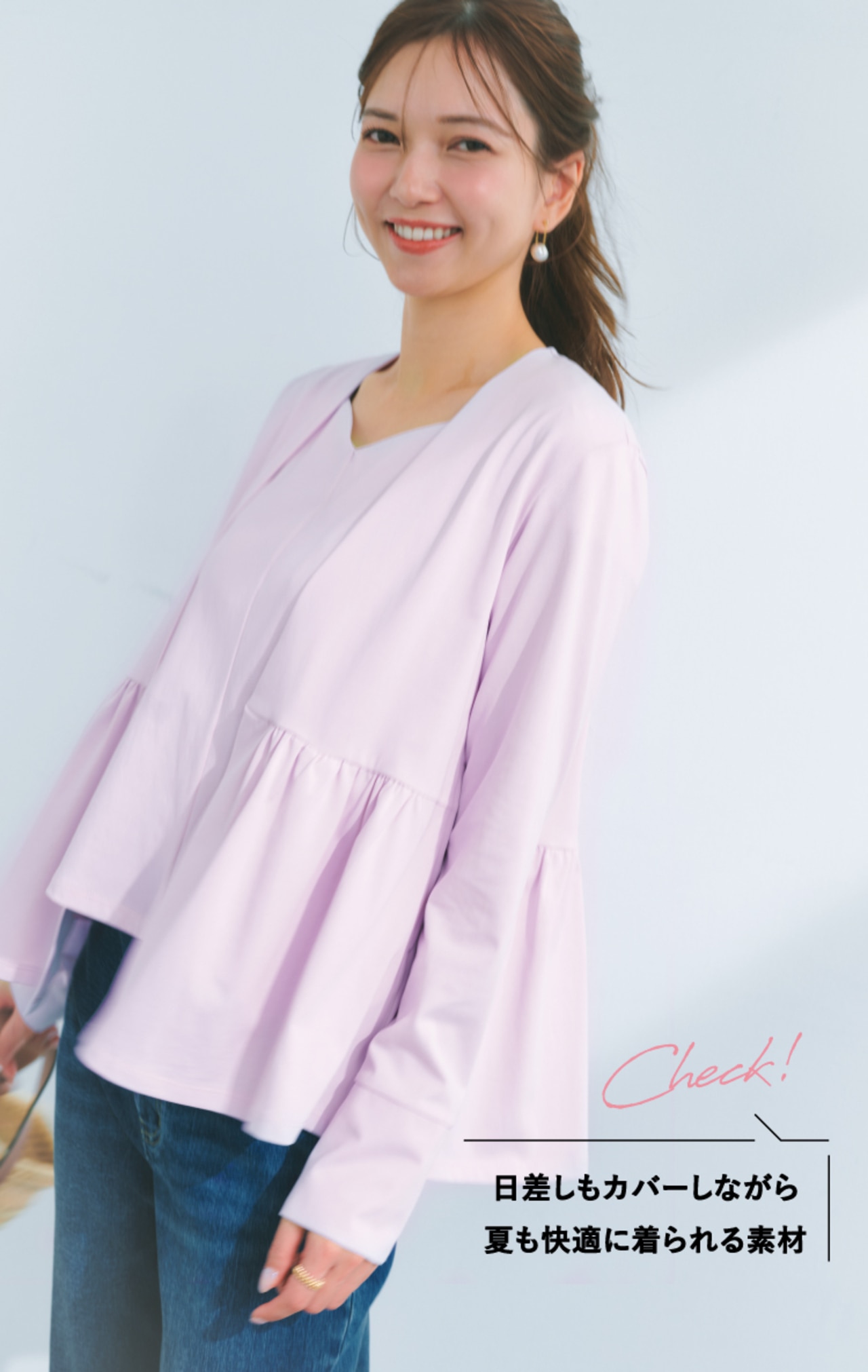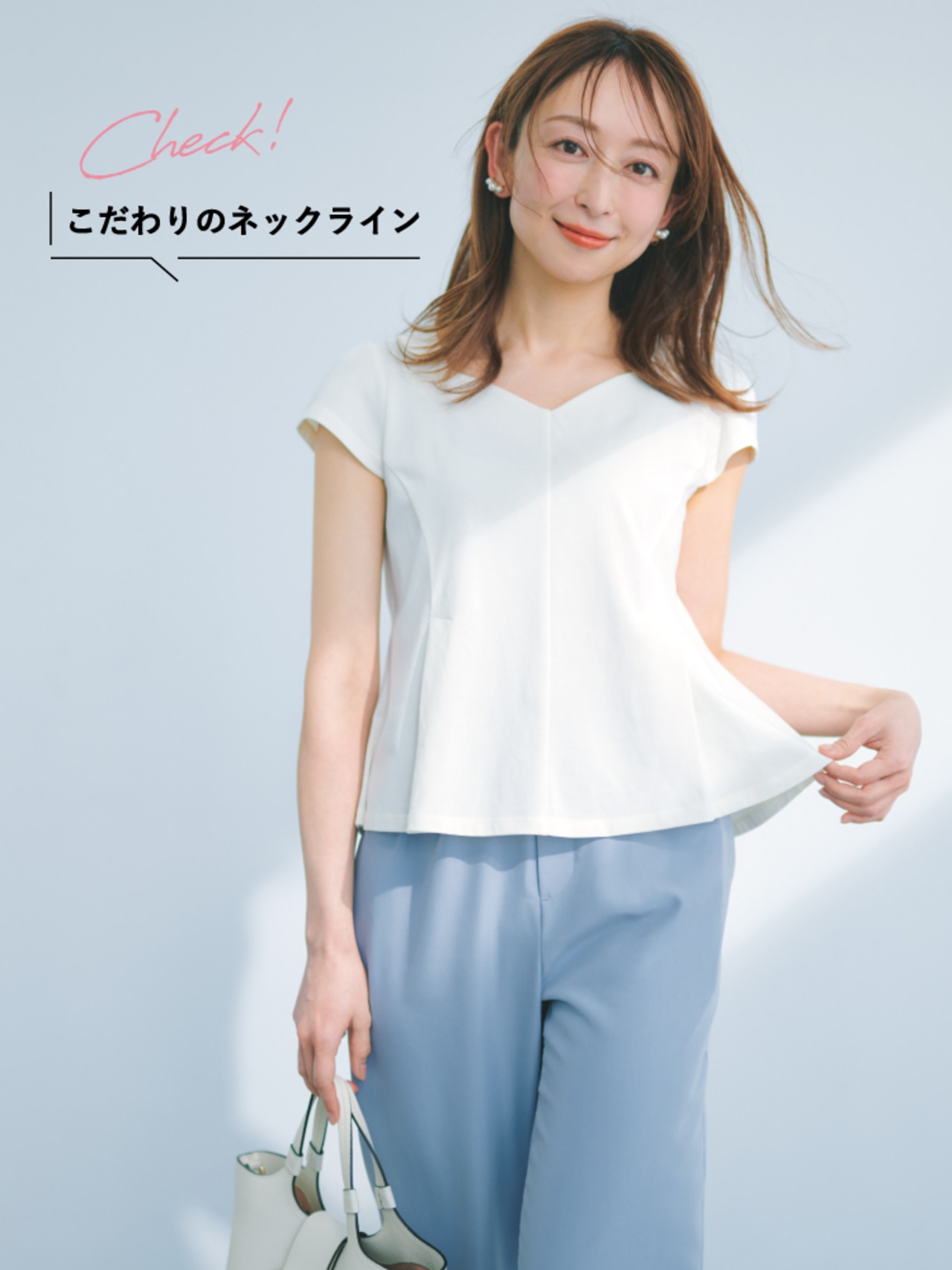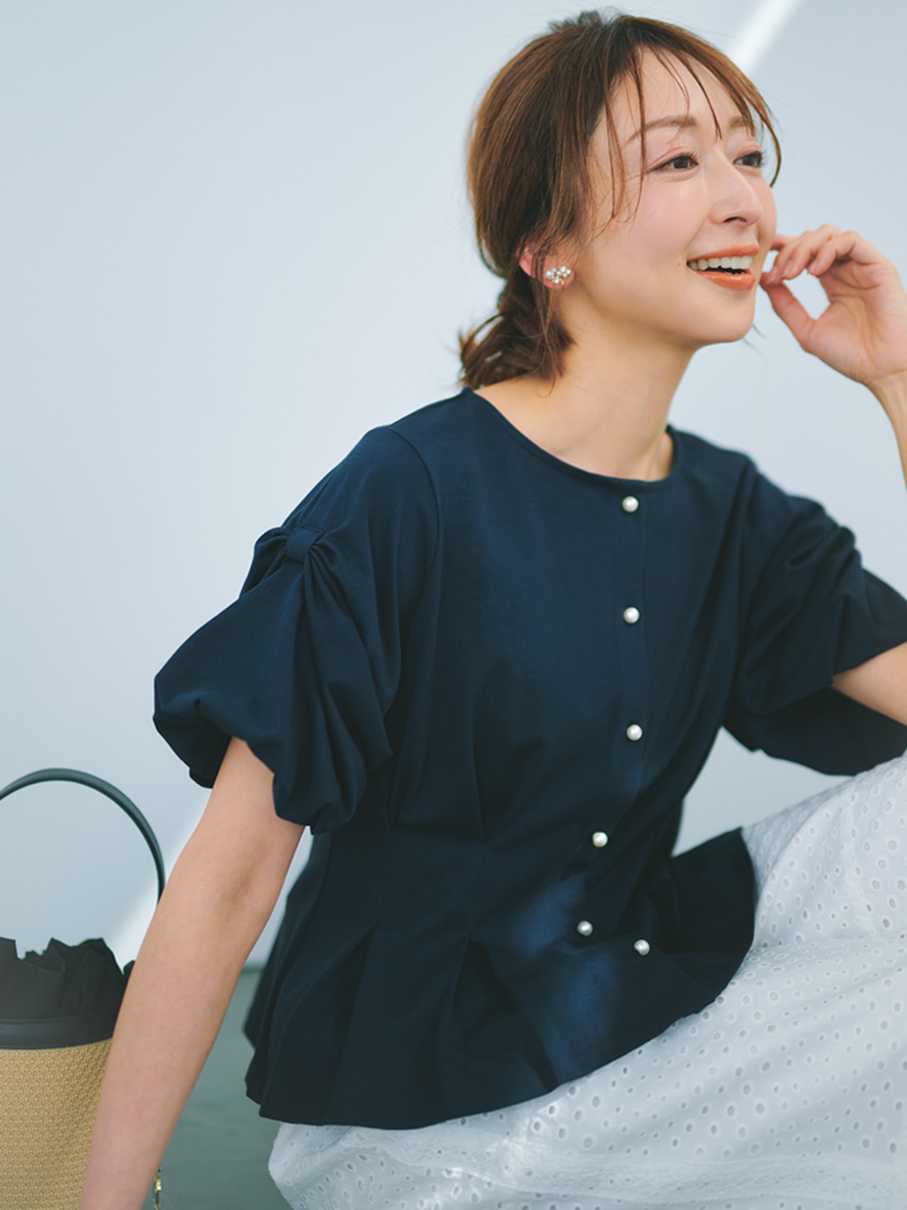 セットでももちろん着やすいんですが、一枚で着たときのシルエットの綺麗さがすごくお気に入りです。あと、夏ってどうしても腕を出すのが気になるんですが、これは袖がしっかりあるのに涼しくて、日焼けもカバーしながら、ちゃんと快適に着られるんです。さらに袖にパールが付いているので、Tシャツ感覚で着られるのにカジュアルになりすぎなくて、一枚でちゃんと上品に見えるのもすごくいいなと思っています。鎖骨がきれいに見えるネックラインなので、少し華奢に見える感じもあって、どんなシーンでも迷わず手に取れる一枚だと思います。