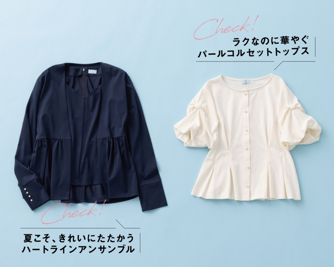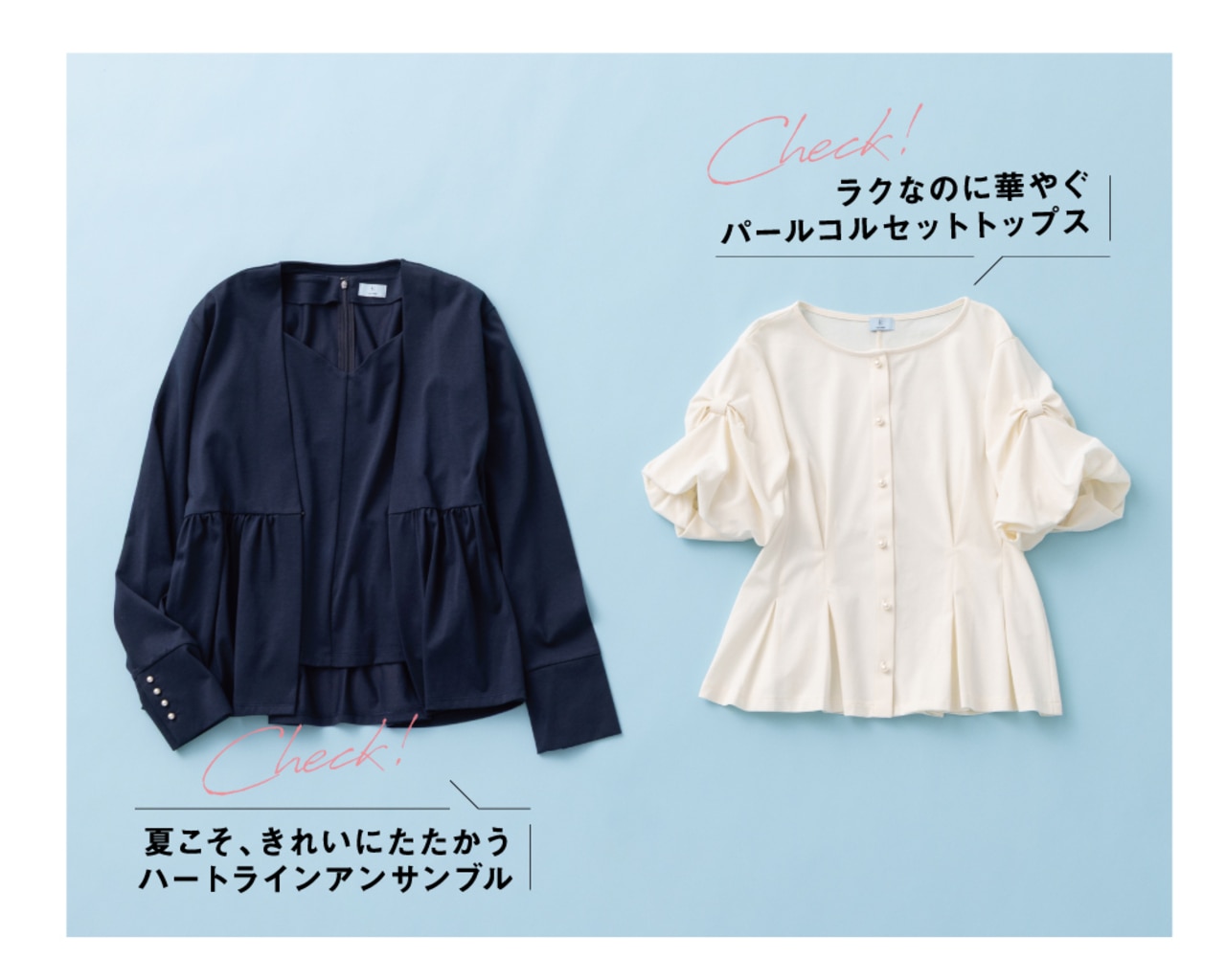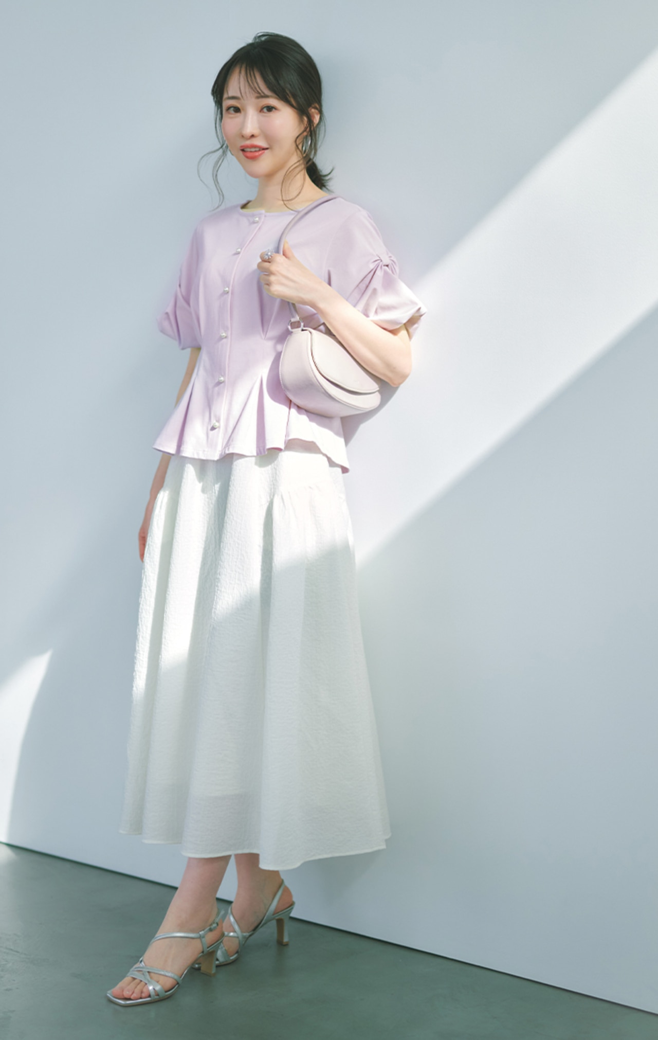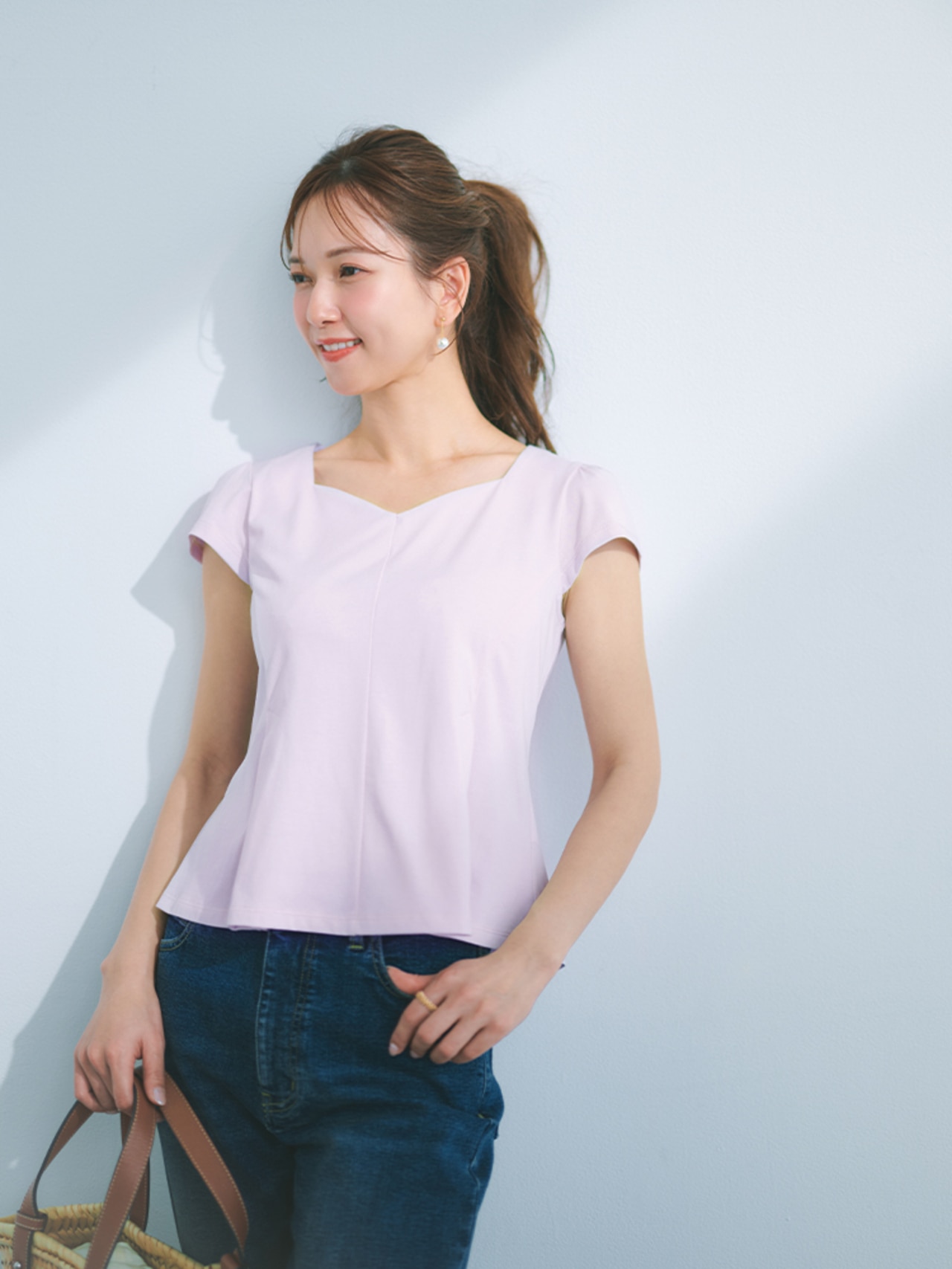 セットでももちろん着やすいんですが、一枚で着たときのシルエットの綺麗さがすごくお気に入りです。あと、夏ってどうしても腕を出すのが気になるんですが、これは袖がしっかりあるのに涼しくて、日焼けもカバーしながら、ちゃんと快適に着られるんです。さらに袖にパールが付いているので、Tシャツ感覚で着られるのにカジュアルになりすぎなくて、一枚でちゃんと上品に見えるのもすごくいいなと思っています。鎖骨がきれいに見えるネックラインなので、少し華奢に見える感じもあって、どんなシーンでも迷わず手に取れる一枚だと思います。