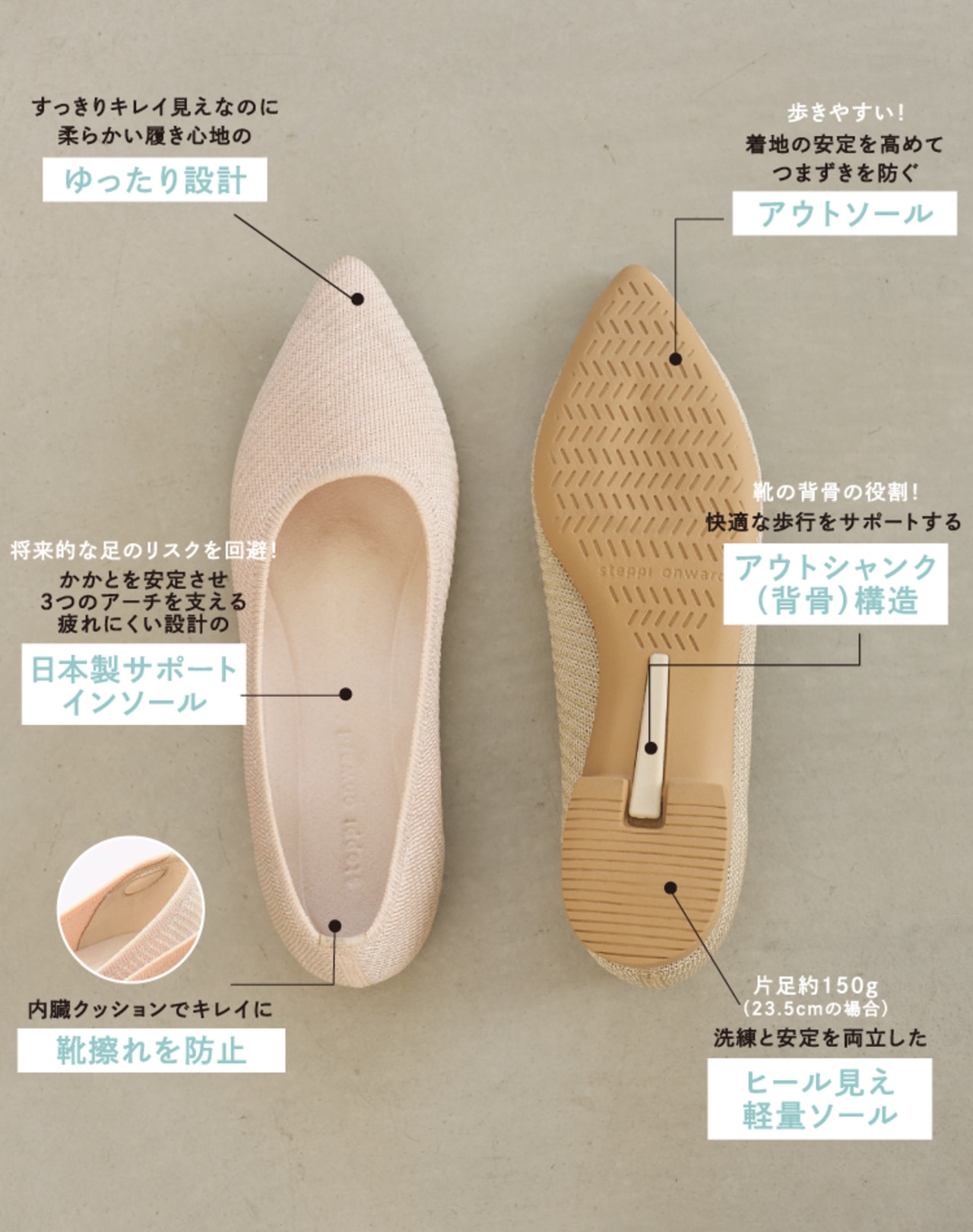 足をきれいに見せるシルエットと、足のお悩みに寄り添うこだわりを詰め込んだ一足です。