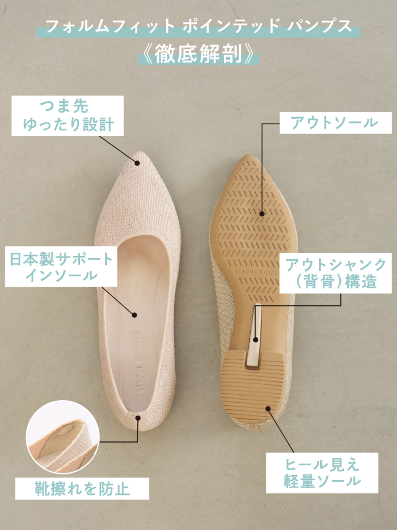 ヒールパンプスにも採用されている、“背骨のように足を支える構造”を取り入れました。かかとから土踏まずにかけてのねじれを軽減し、安定した歩行をサポートします。さらに、立体的に設計されたアウトソールが着地時の安定感を高め、足の横ぶれを抑えます。 -