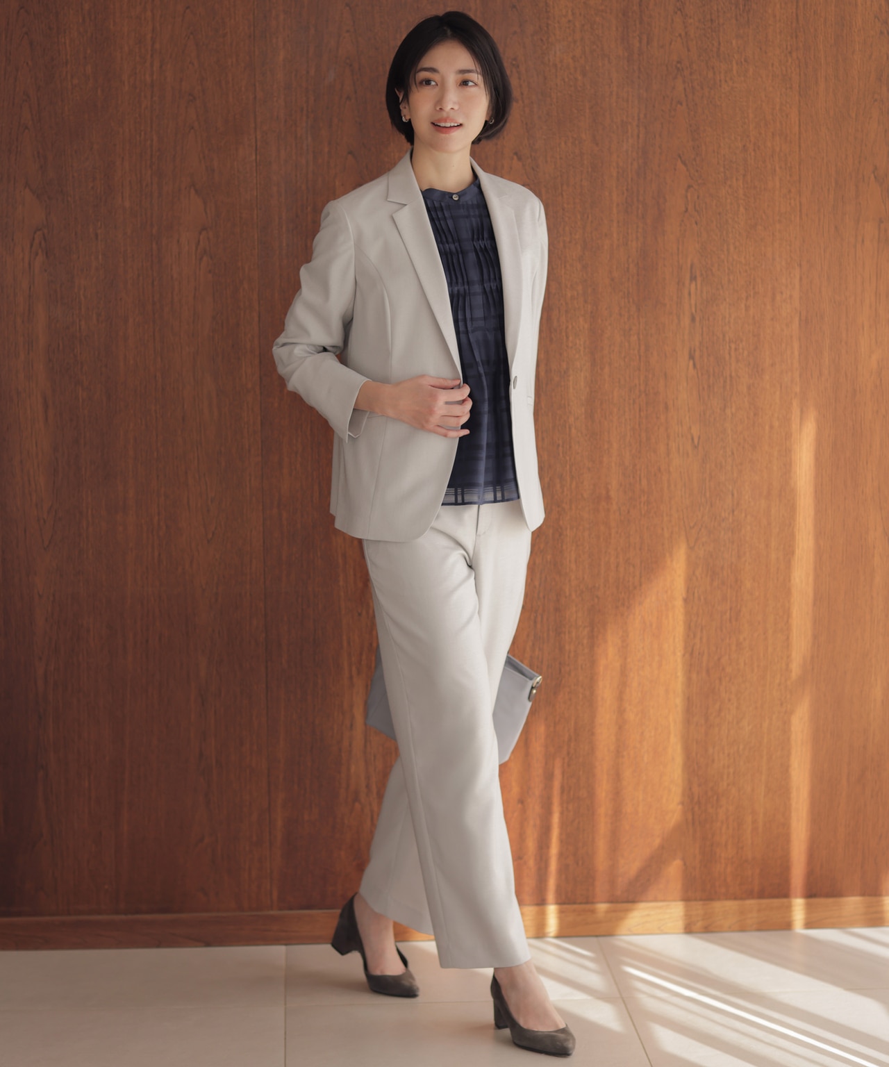 取引先への訪問は、きちんとしたテーラードジャケットとパンツスタイルで。