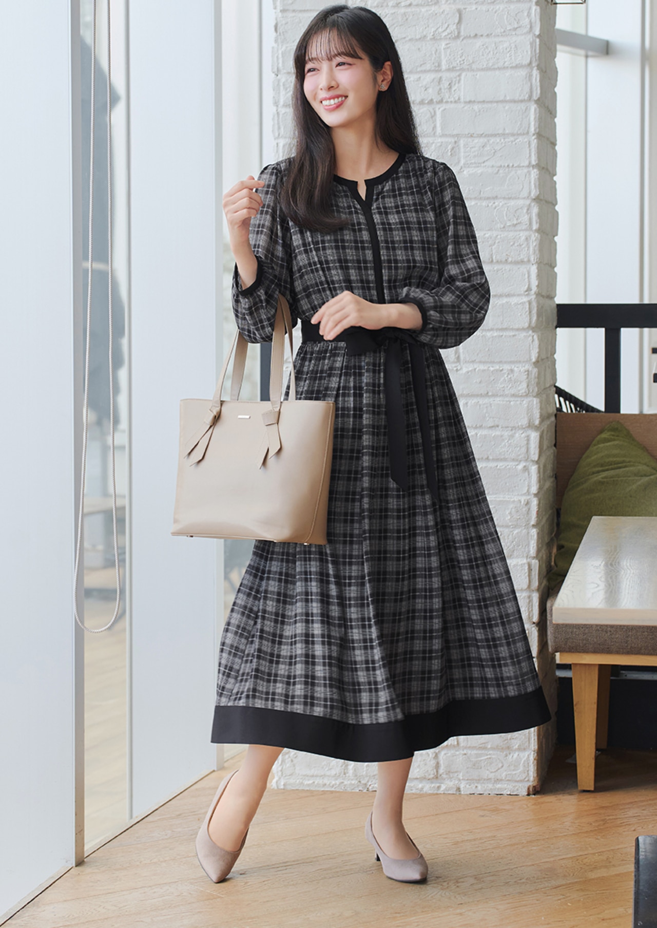 チェック柄でカジュアルさを出し、シフォン素材で上品に仕上げたワンピース。リボンでウエストをマークでき、軽やかな着心地でデイリーに活躍。